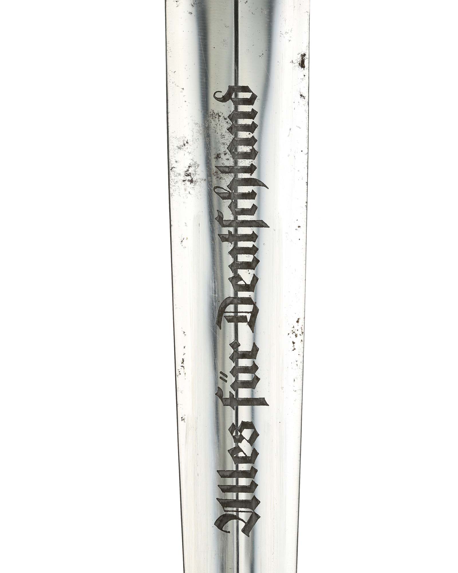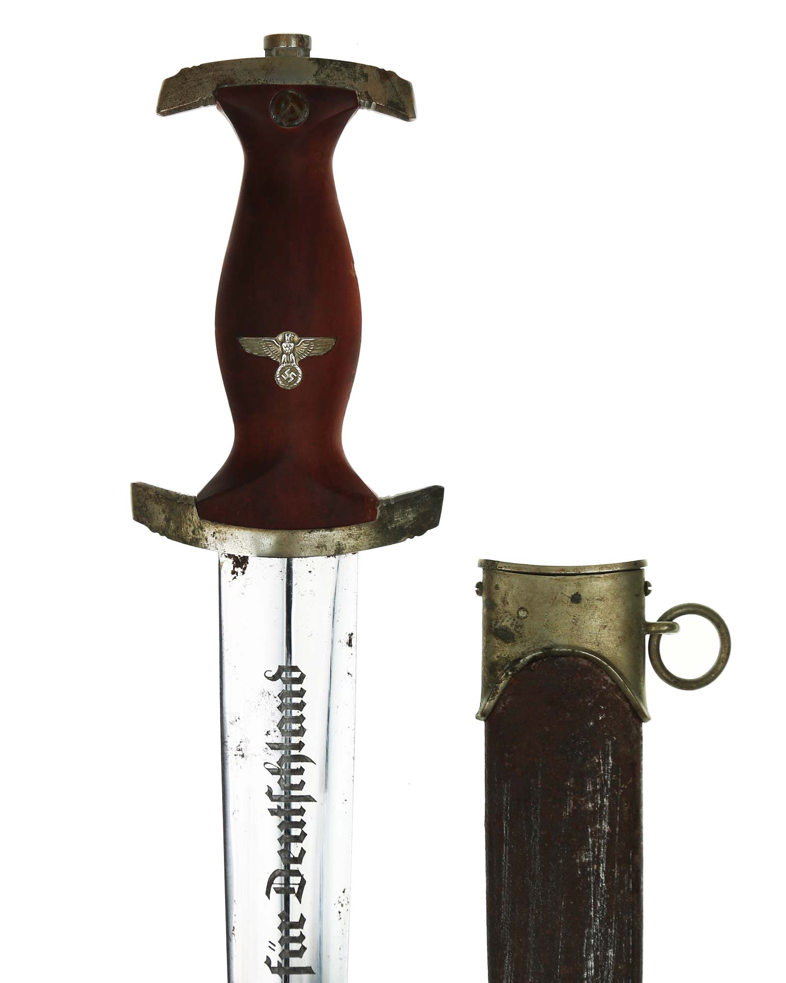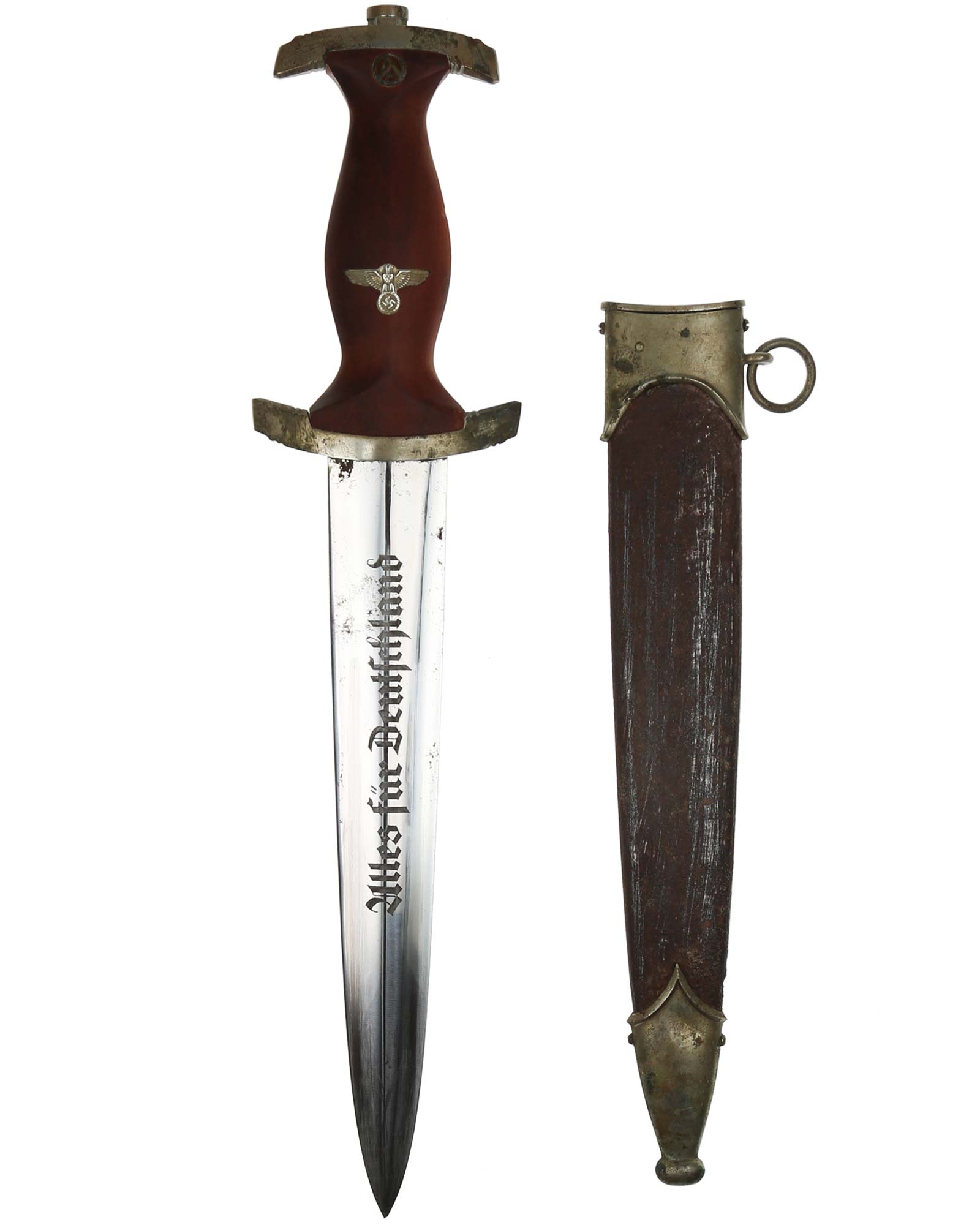 Blade: The blade is in Near Mint condition. The SA motto Alles für Deutschland «Everything for Germany» is crisp and deep having the darkening in the background letters. The ricasso area still has the full trademark, Gebr. Bell Solingen. The blade shoulders perfectly meet the lower crossguard contour.