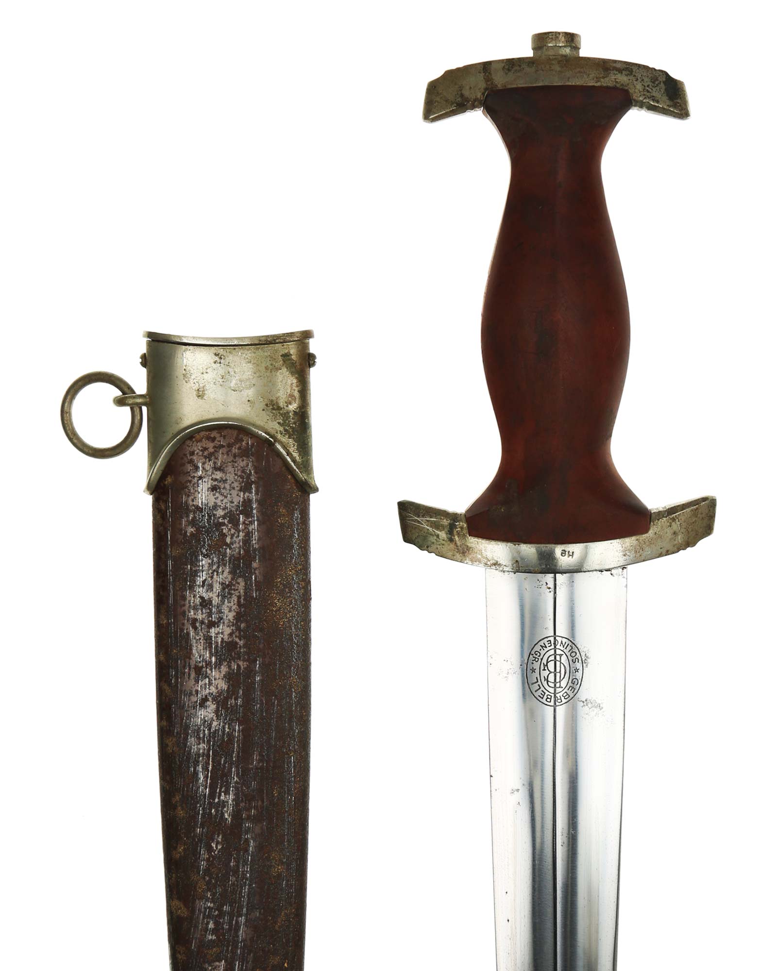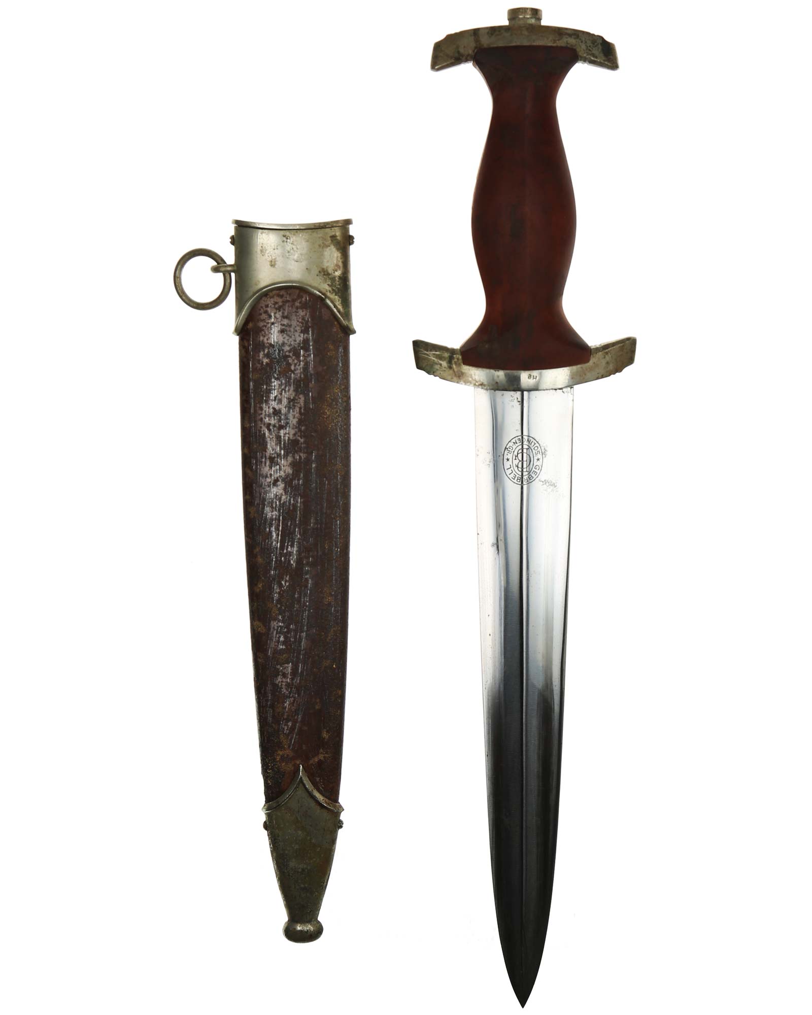 This SA [Sturmabteilung] Dagger in EXC++ condition. Model 1933. The total length is 37.8 cm. Early Nickel fittings, lower guard with "He" stamp. The Dagger has maker mark on the blade: Gebr. Bell Solingen (Brother Bell in Solingen).