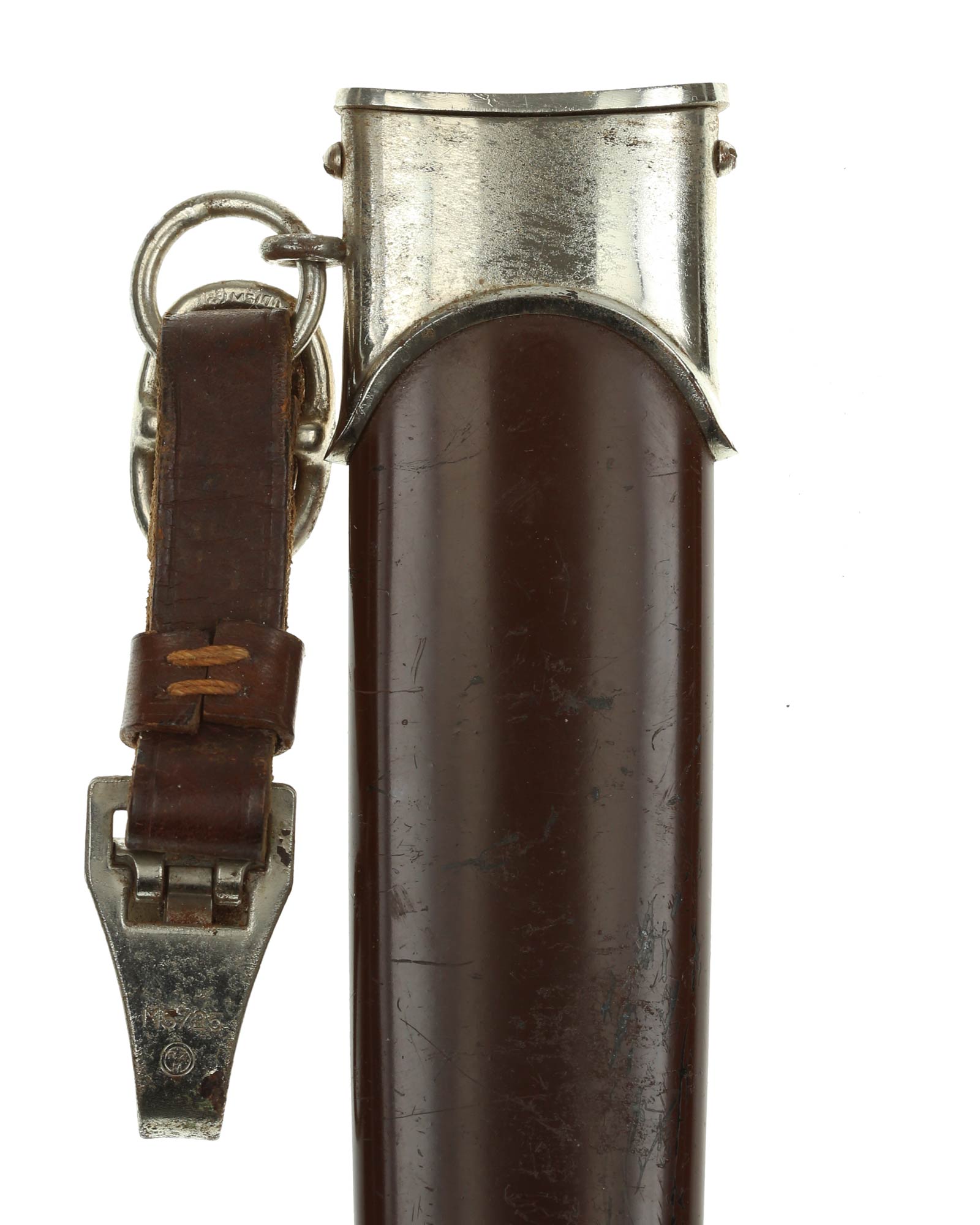 Scabbard: The scabbard shell is straight throughout. This shell has a fine brown coat of paint. The paint is still 99% and still has its fine factory newness to the color. The scabbard mounts are the nickel-plated steel variety. The mounts are retained by screws which still retain their nickel plating.