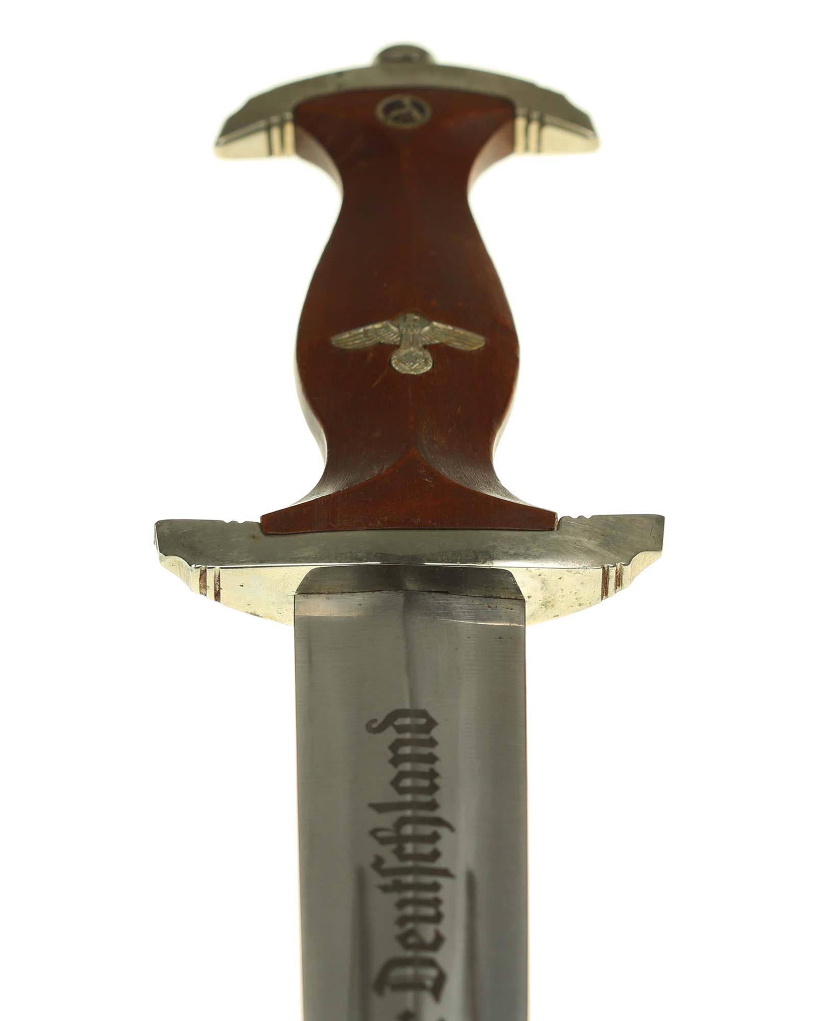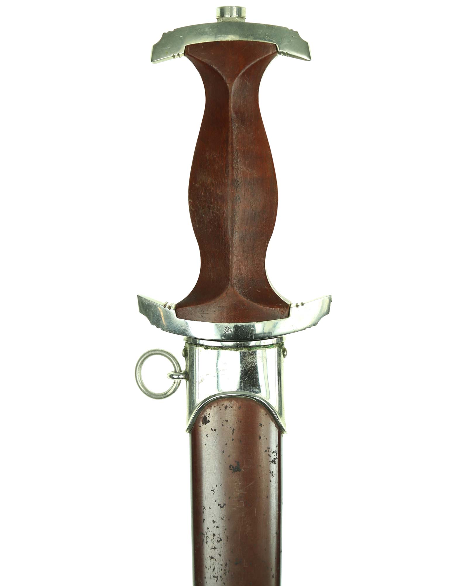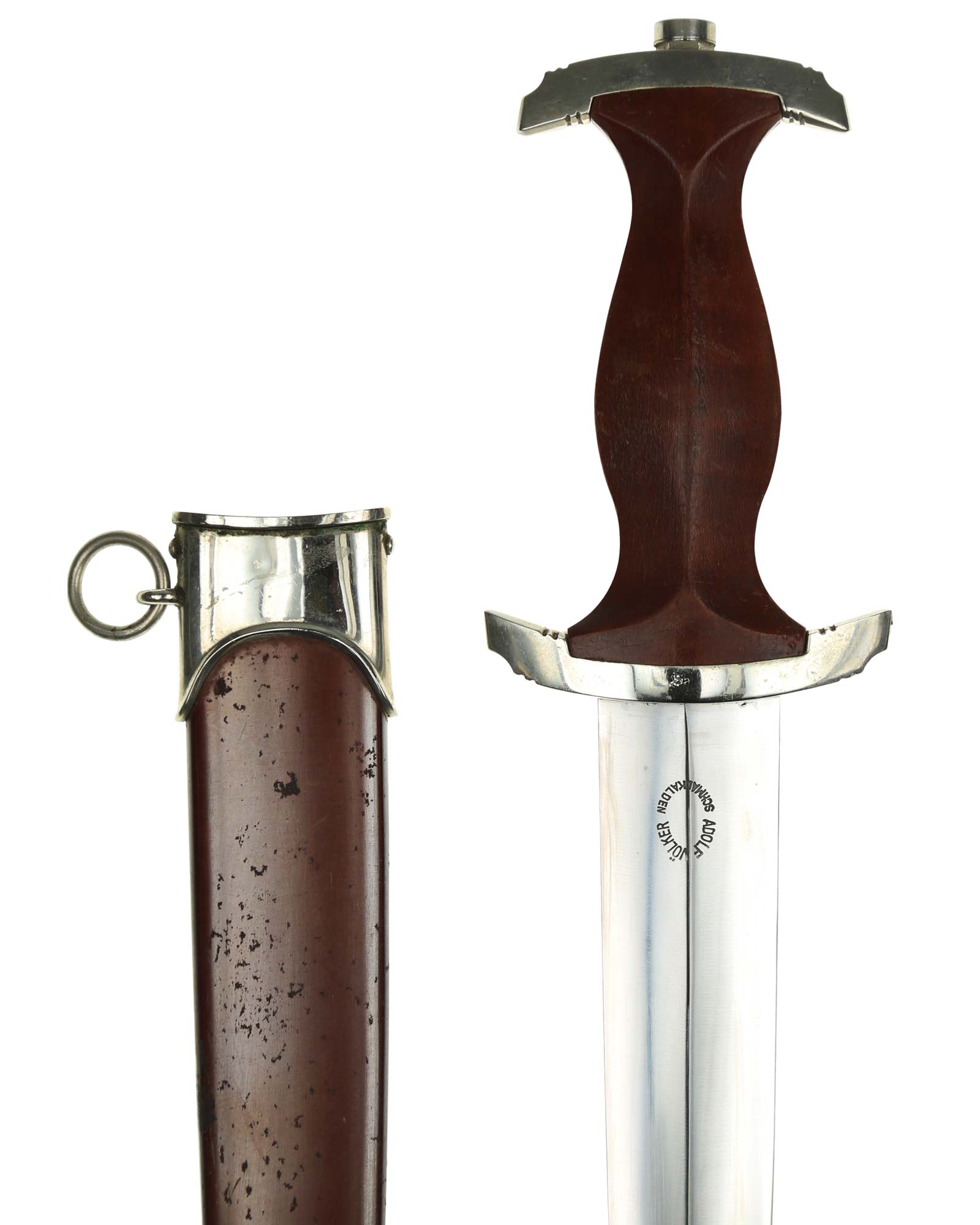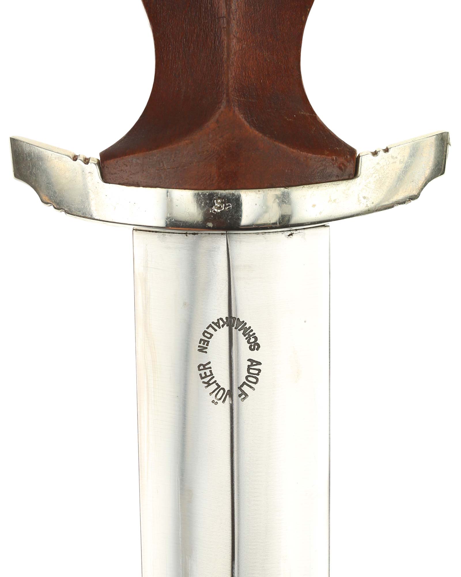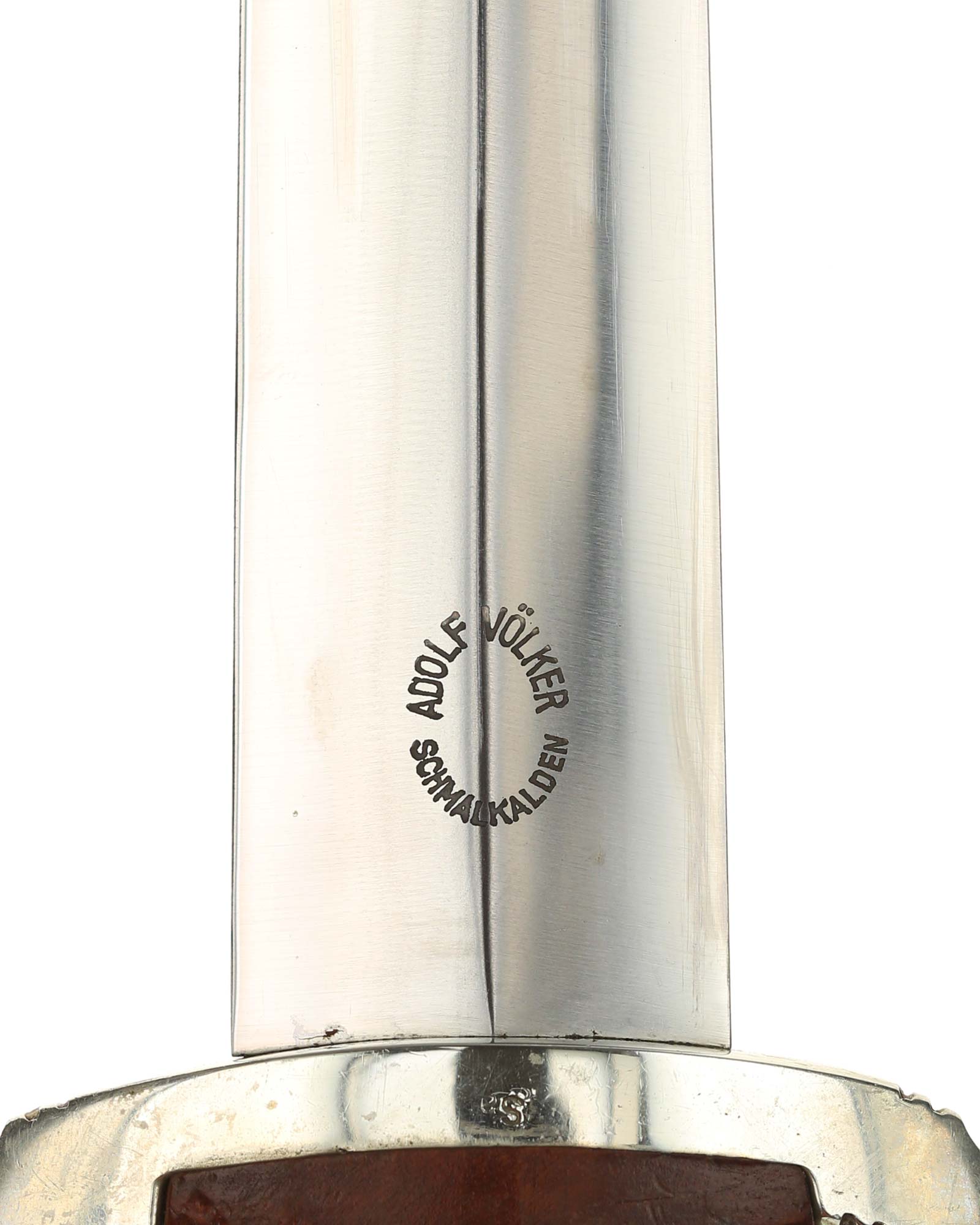 This SA [Sturmabteilung] Dagger in Near Mint condition. Model 1933. The total length is 37.5 cm. Early Nickel fittings, lower guard with "Sa" stamp. The Dagger has the maker mark on the blade: Adolf Völker Schmalkalden.