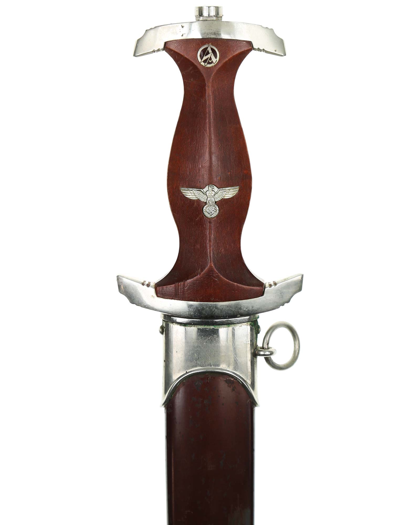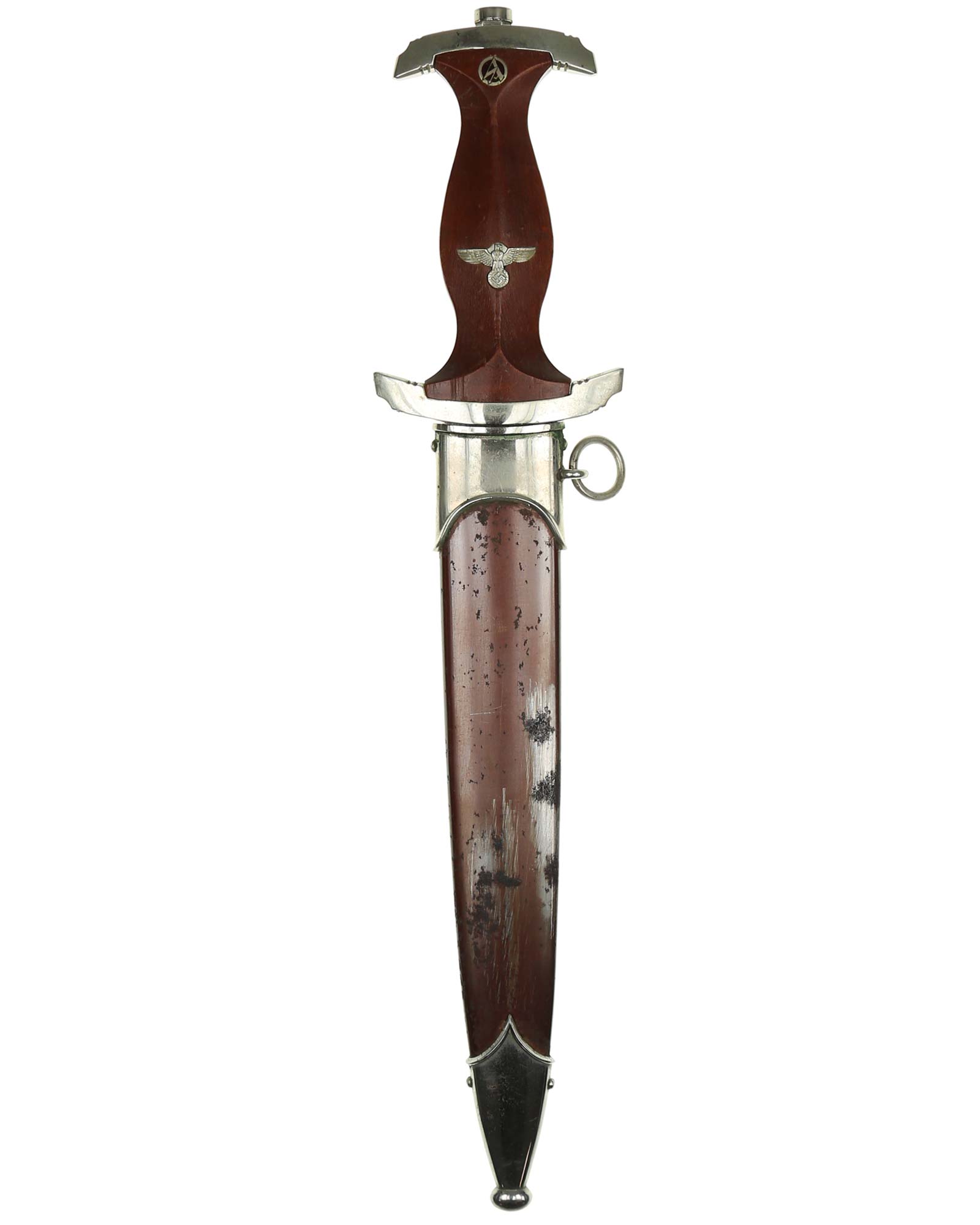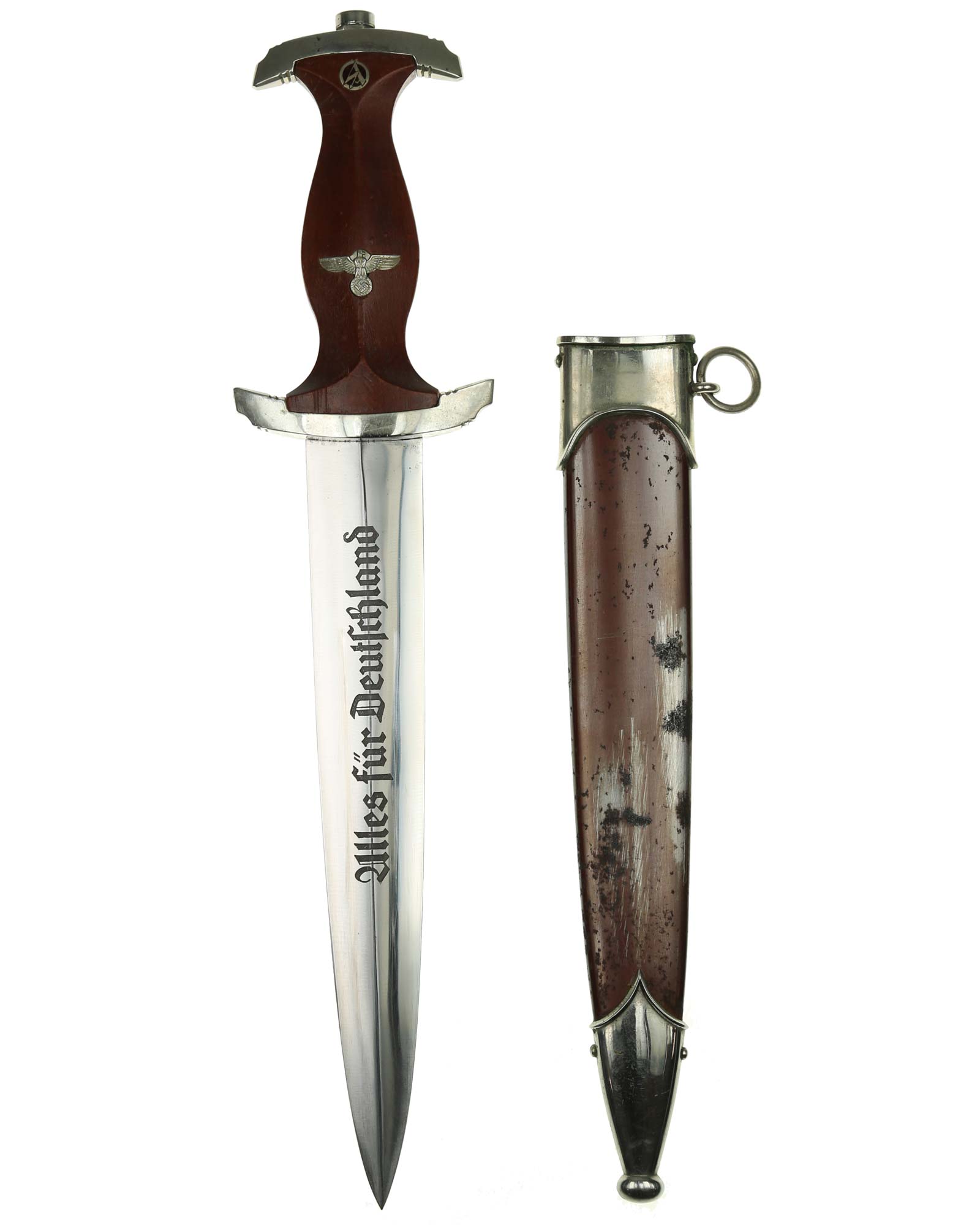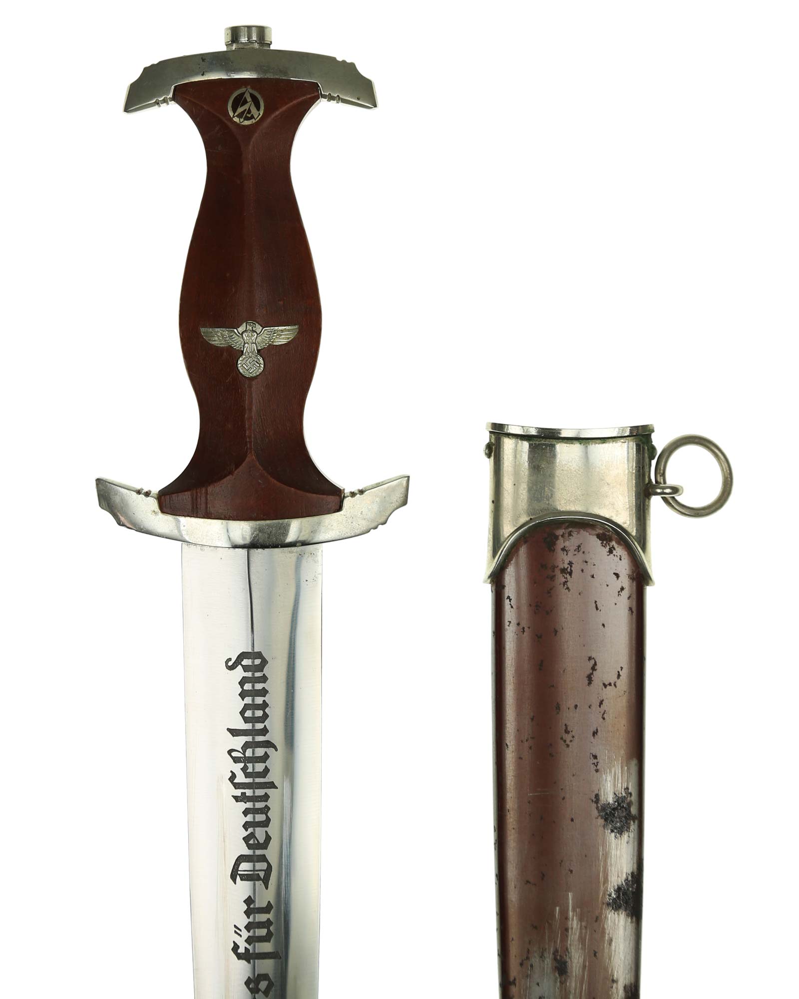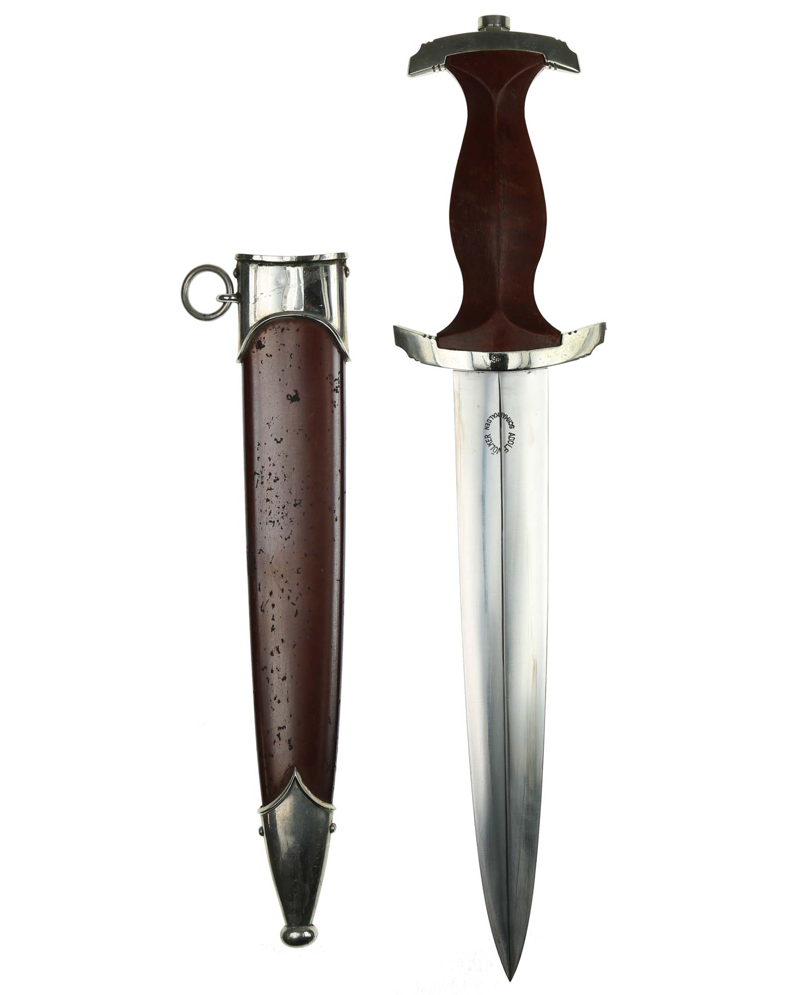 This SA [Sturmabteilung] Dagger in Near Mint condition. Model 1933. The total length is 37.5 cm. Early Nickel fittings, lower guard with "Sa" stamp. The Dagger has the maker mark on the blade: Adolf Völker Schmalkalden.