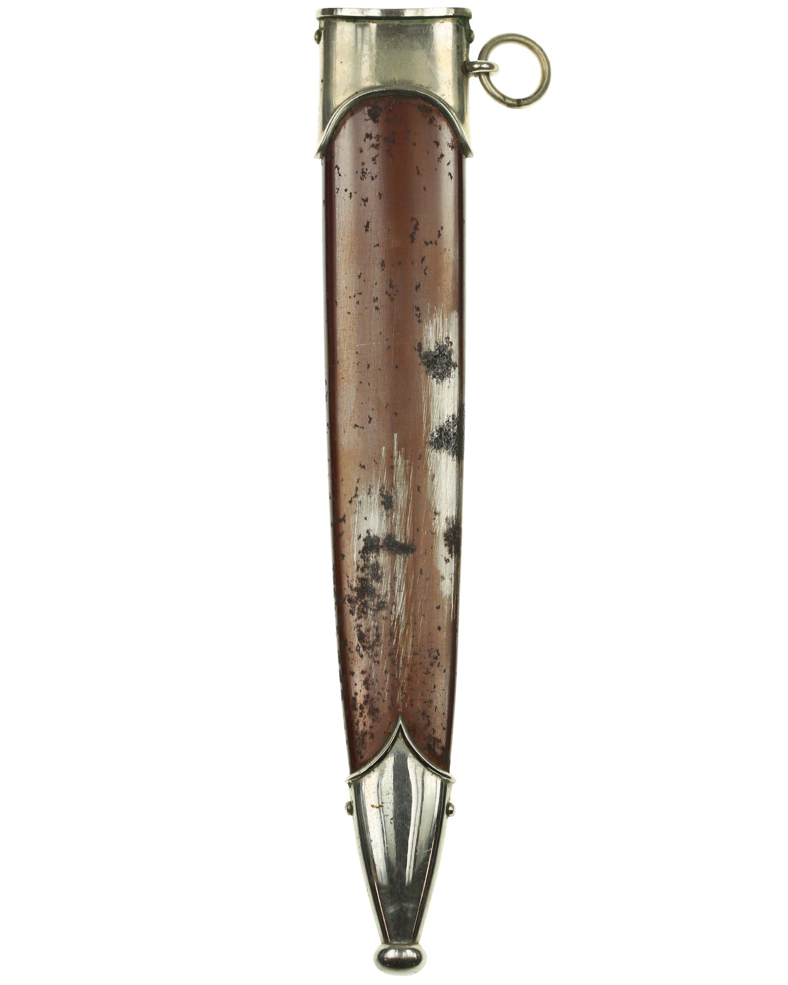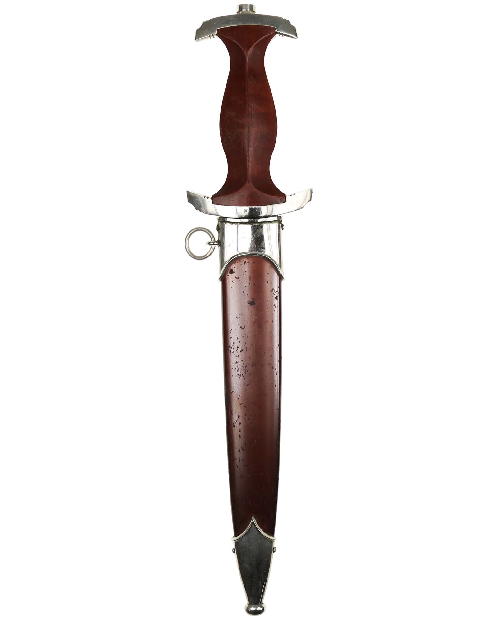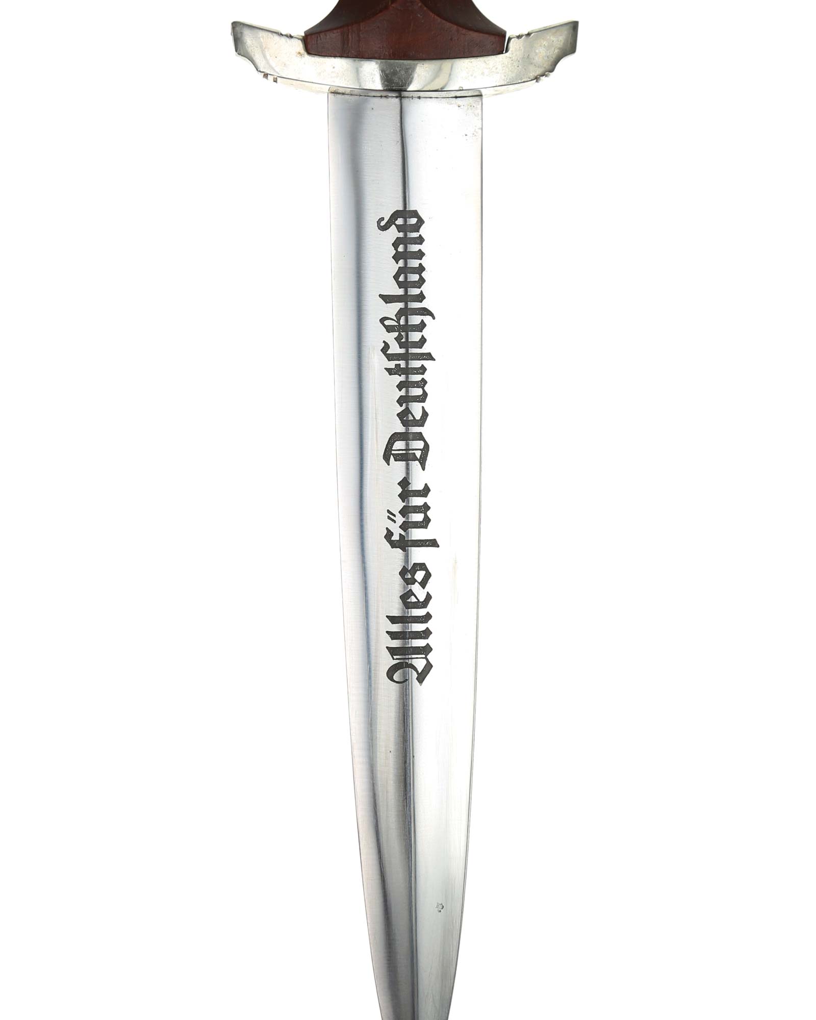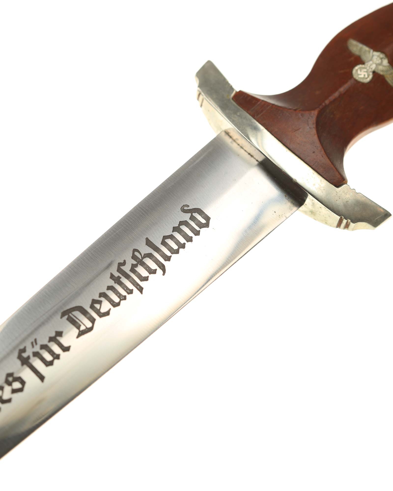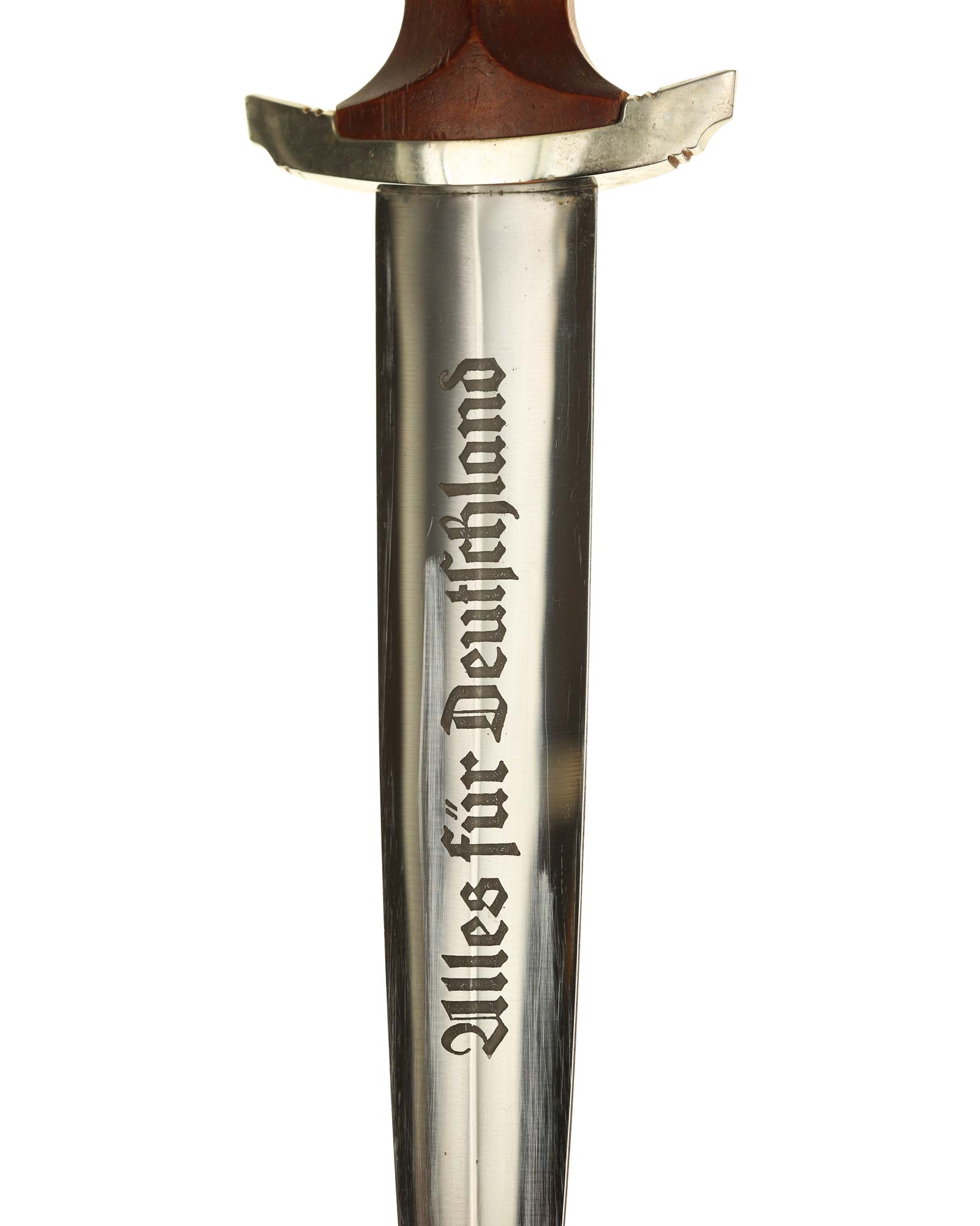 This SA [Sturmabteilung] Dagger in Near Mint condition. Model 1933. The total length is 37.5 cm. Early Nickel fittings, lower guard with "Sa" stamp. The Dagger has the maker mark on the blade: Adolf Völker Schmalkalden.