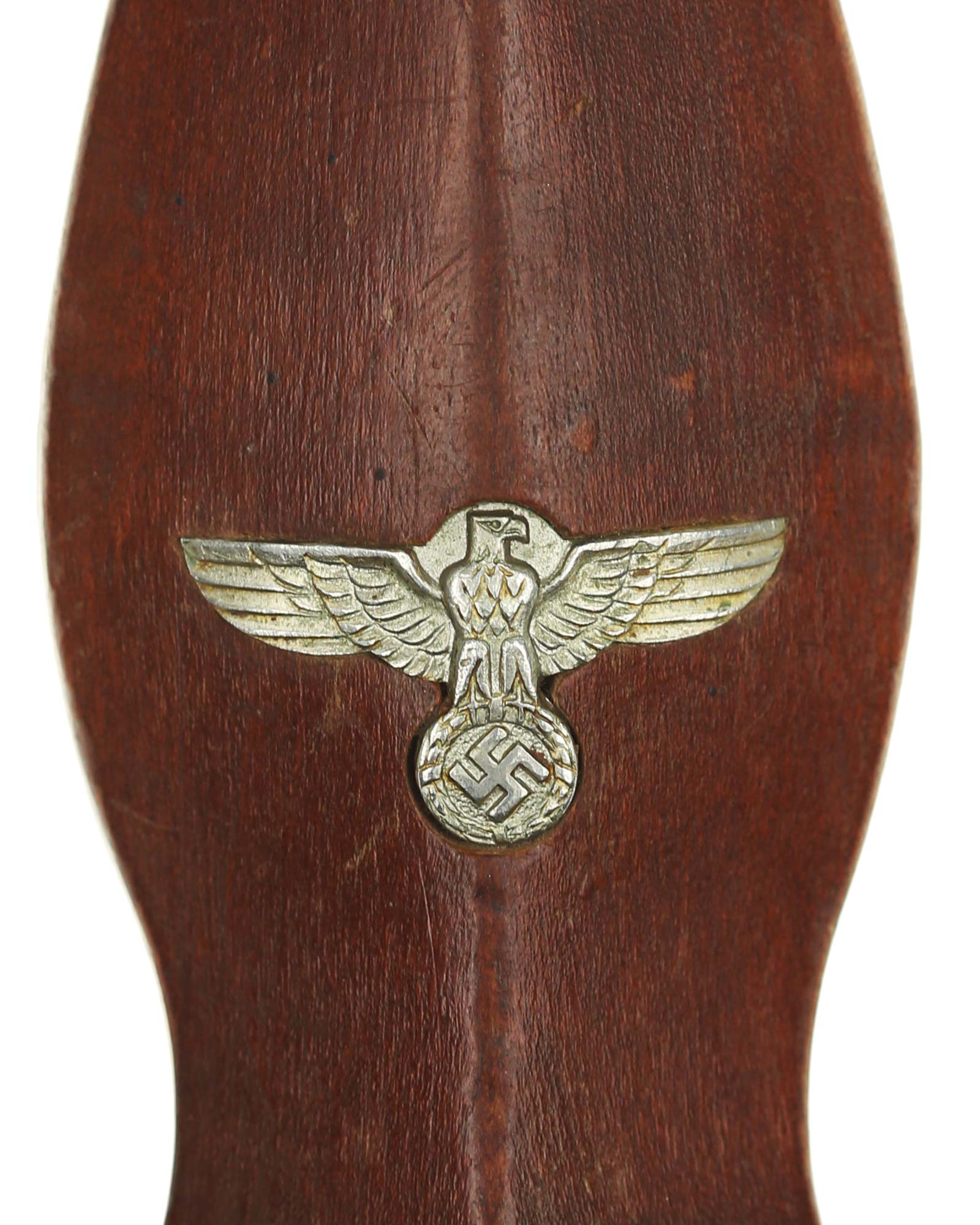 Grip: The mounts on this example are all solid nickel. The lower crossguard is Gruppe marked, “Sa”. The grip is a fine furniture-like wood having a pleasing grain running lengthwise. This grip is of medium contour construction and is in fine condition exactly meeting the crossguards. The SA runes button has good enamel and is perfectly placed. This eagle is in fine condition throughout having full details to its head, eye, breast and wing feathering, talons, wreath and mobile swastika.