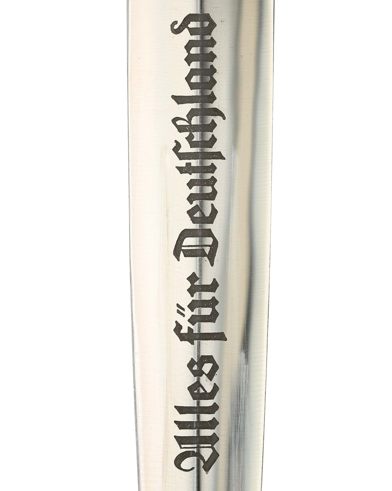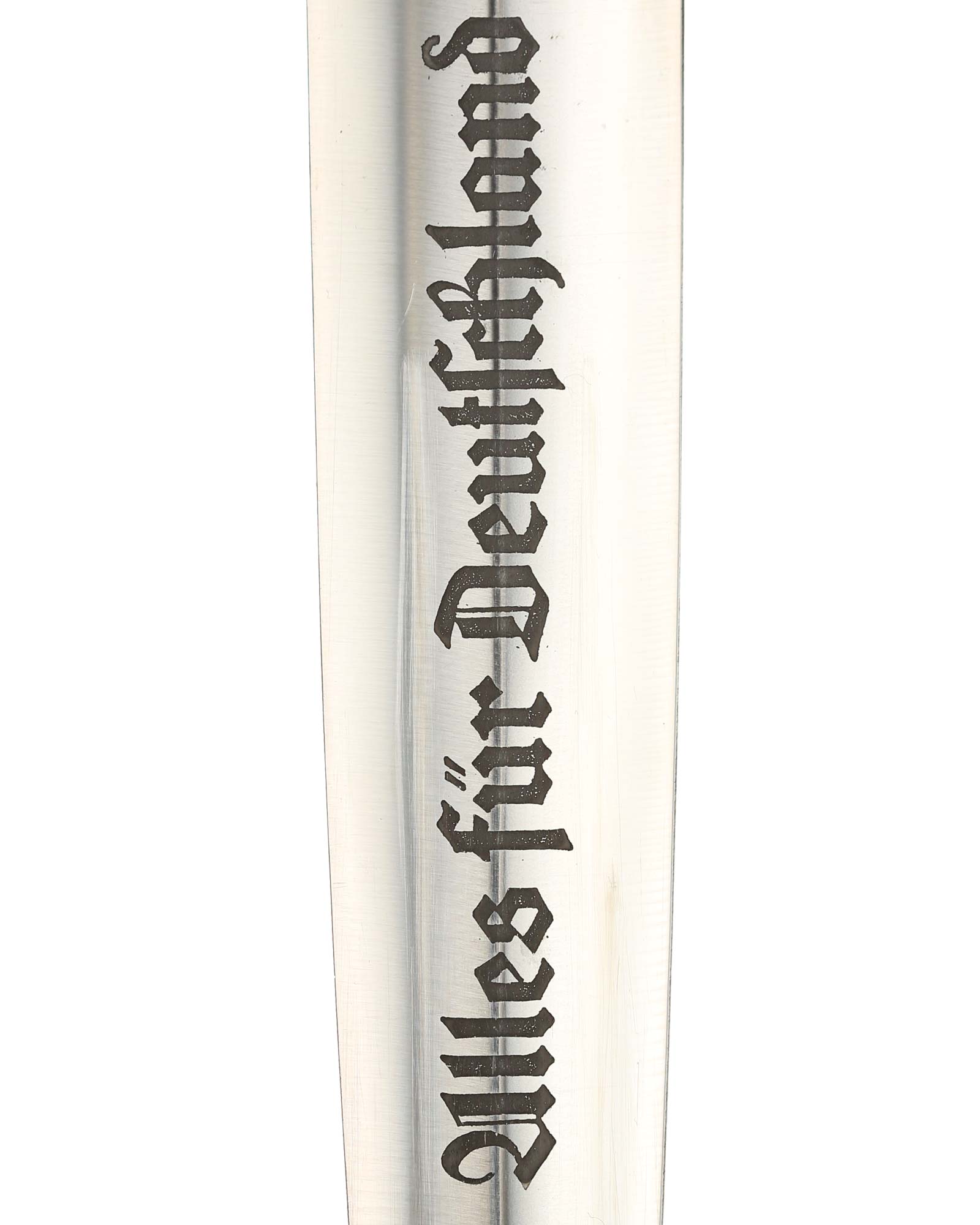 Blade: The blade is in MINT condition. The SA motto Alles für Deutschland «Everything for Germany» is crisp and deep having 100% of the darkening in the background letters. The ricasso area still has the full trademark: Adolf Völker Schmalkalden. The blade shoulders perfectly meet the lower crossguard contour.