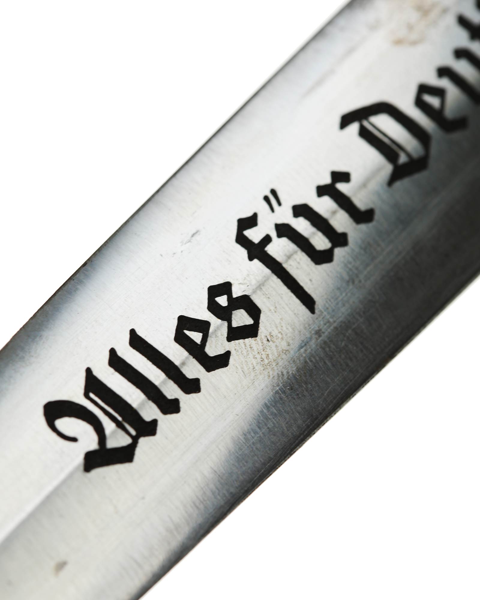 Blade: The SA motto is extremely dark, having 100% of the original blacking in the recesses of the letters. The reverse ricasso is etched with the firm's name and location, Geb. Heller Marienthal.