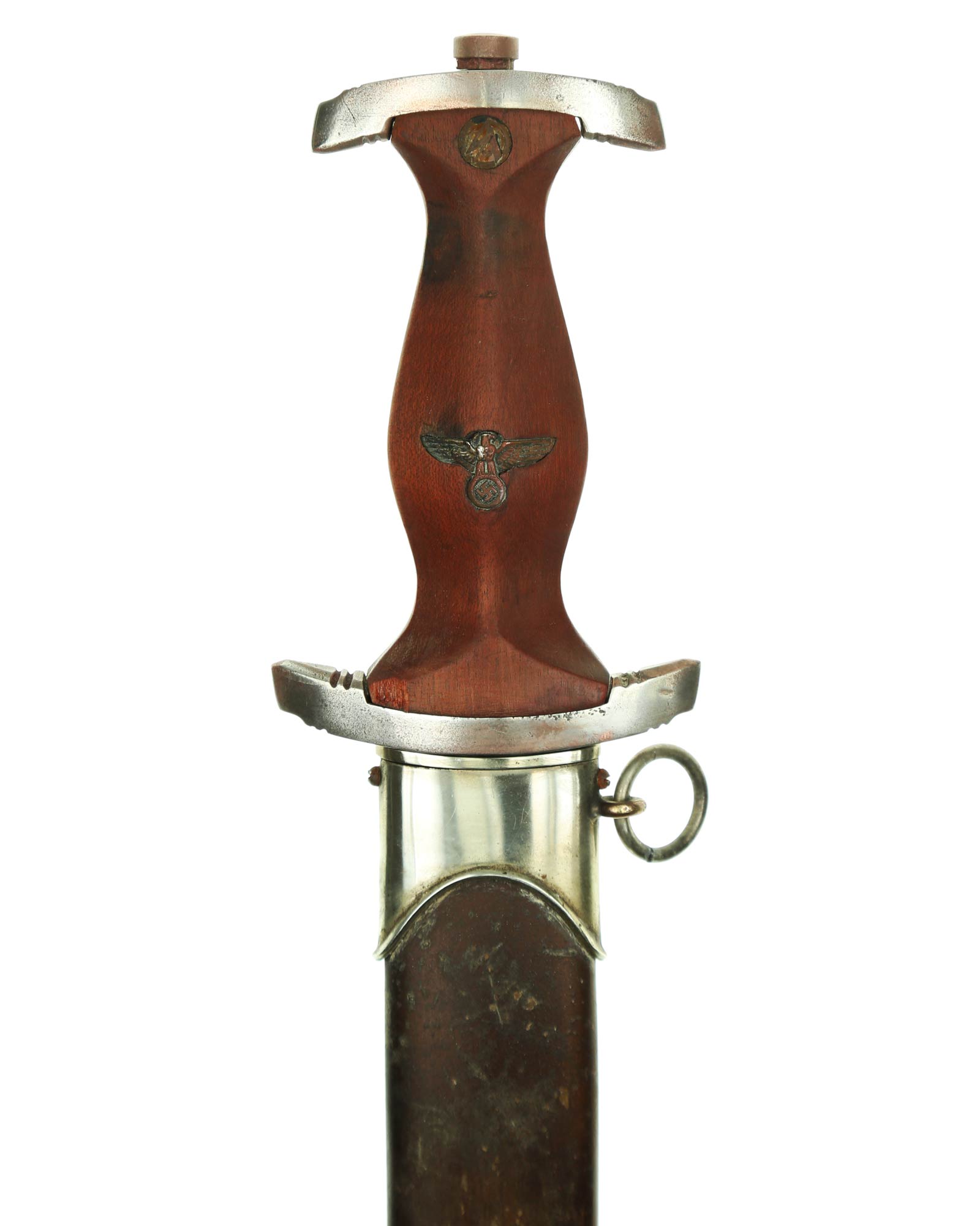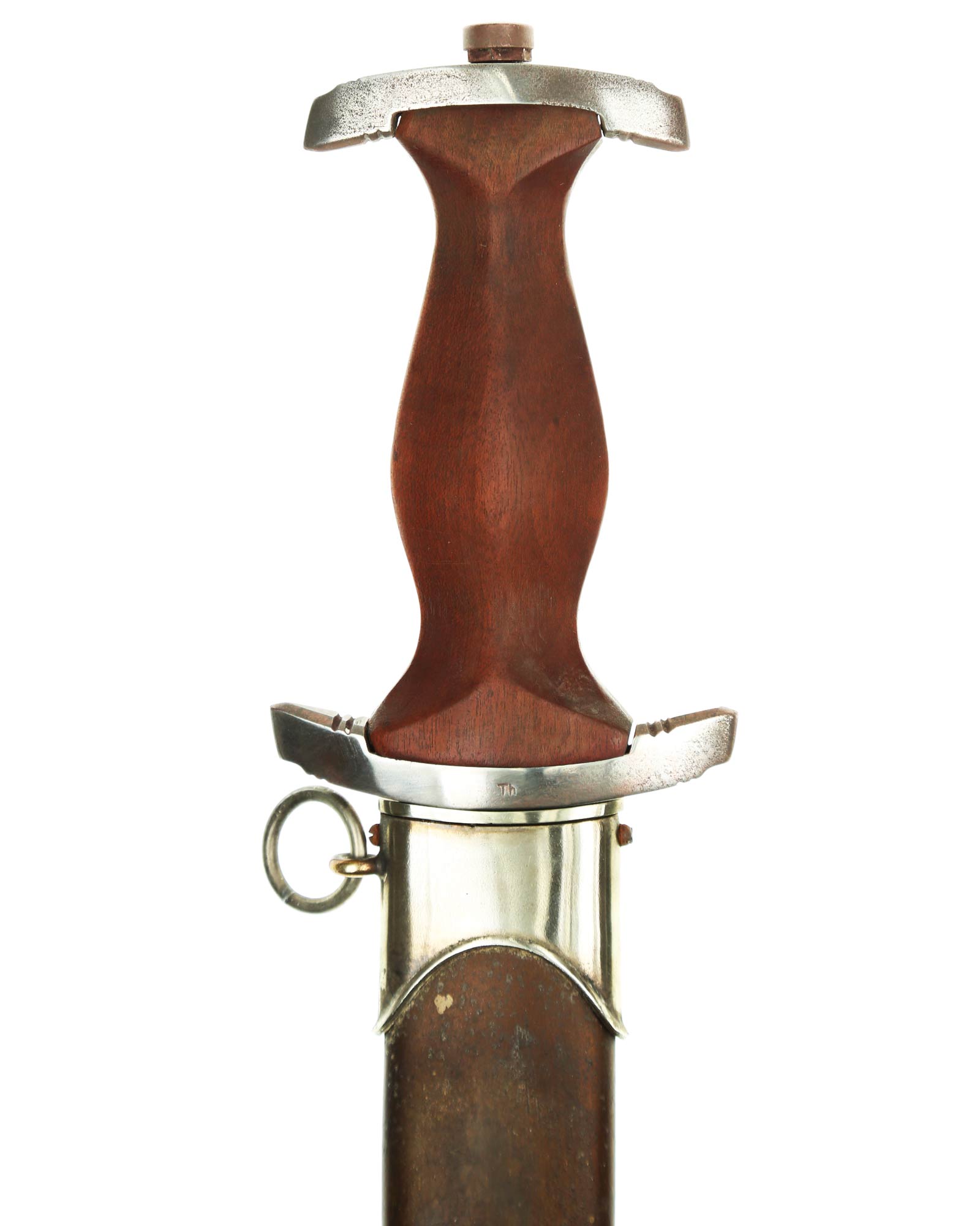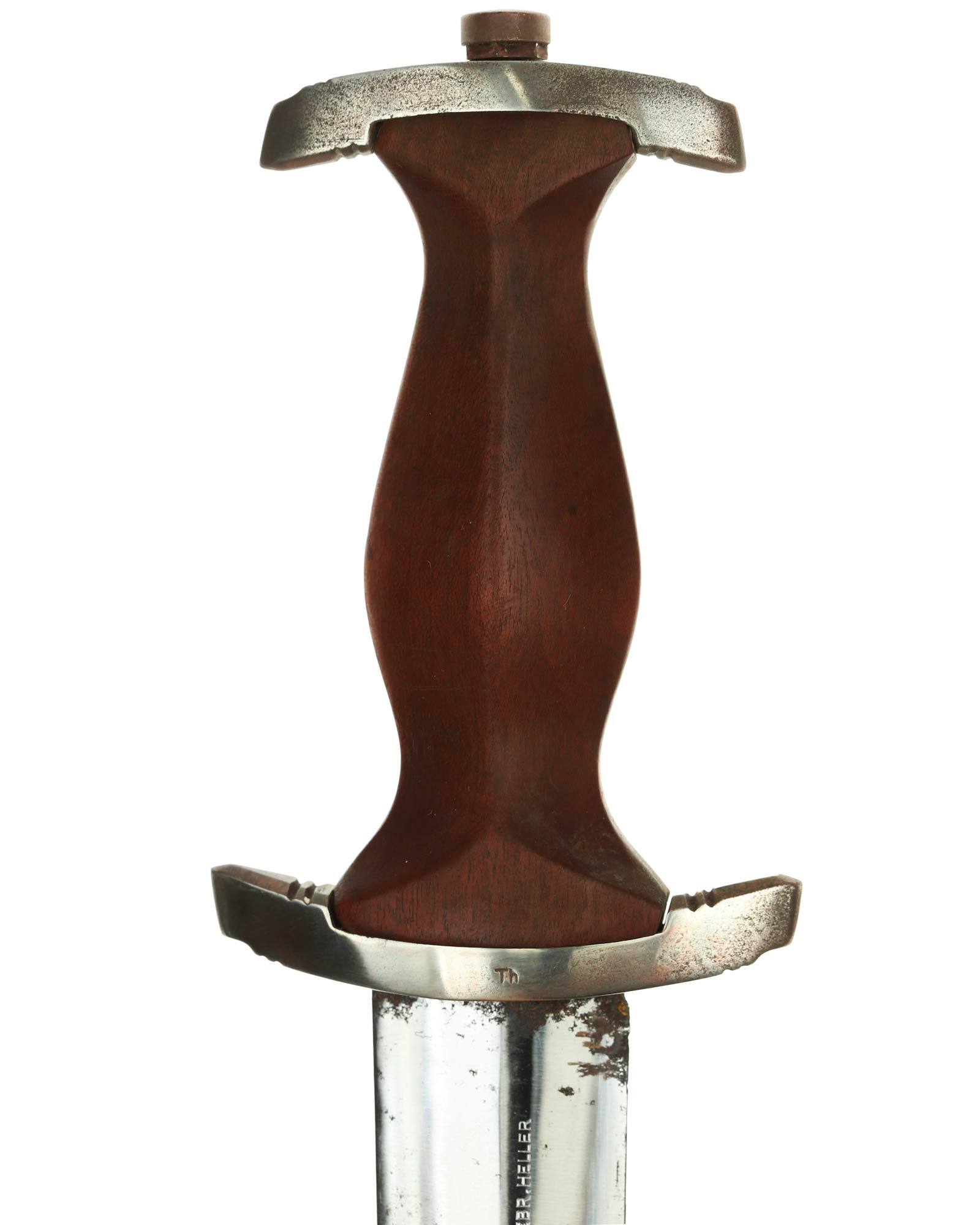 This SA [Sturmabteilung] Dagger in EXC condition. Model 1933. The total length is 37.6 cm. Early Nickel fittings, lower guard with "Th" stamp. The Dagger has the early maker mark on the blade:Geb. Heller Marienthal.