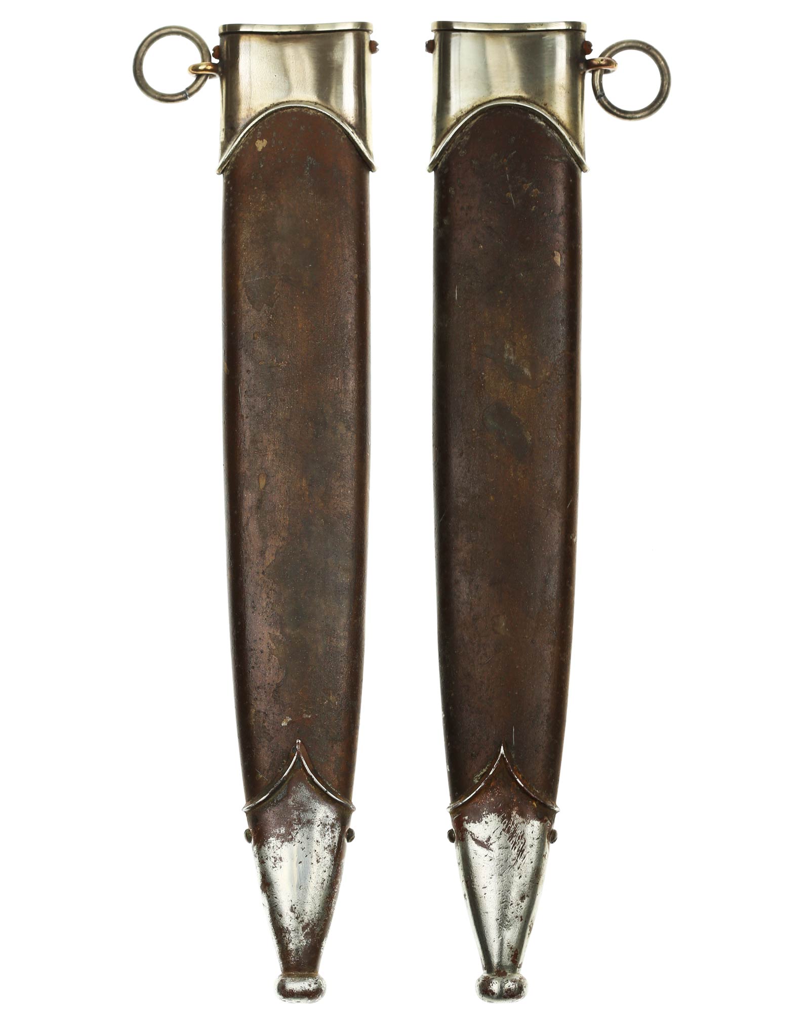 Scabbard: The scabbard shell is straight throughout. The anodized finish on this shell is in good condition. They exactly match the patination of the crossguards, and are retained by four nickel screws.