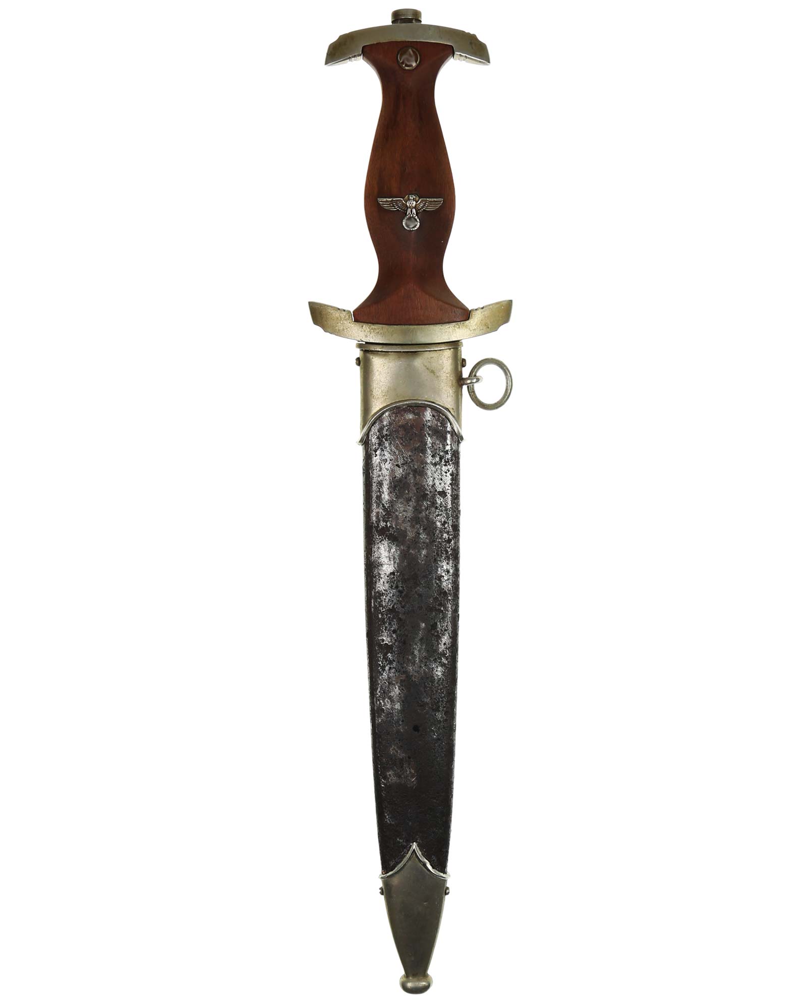 This SA [Sturmabteilung] Dagger is in EXC+ condition and complete uncleaned. Model 1933. The total length is 38.2 cm. Early Nickel fittings, lower guard with "BO" stamp. The Dagger has the maker mark on the blade: Geb. Heller Schmalkalden.