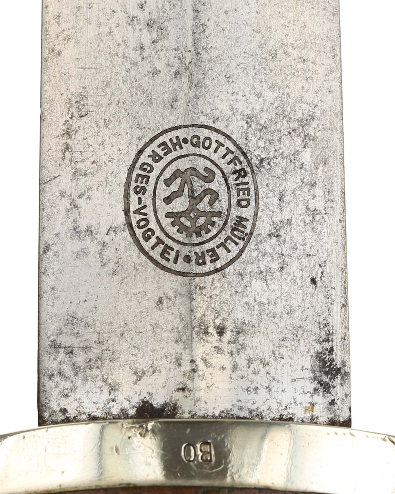 Blade: The blade grades at about EXC+. The reverse has the very rarely seen maker mark of “Gottfried Müller, Herges Vogtei”.