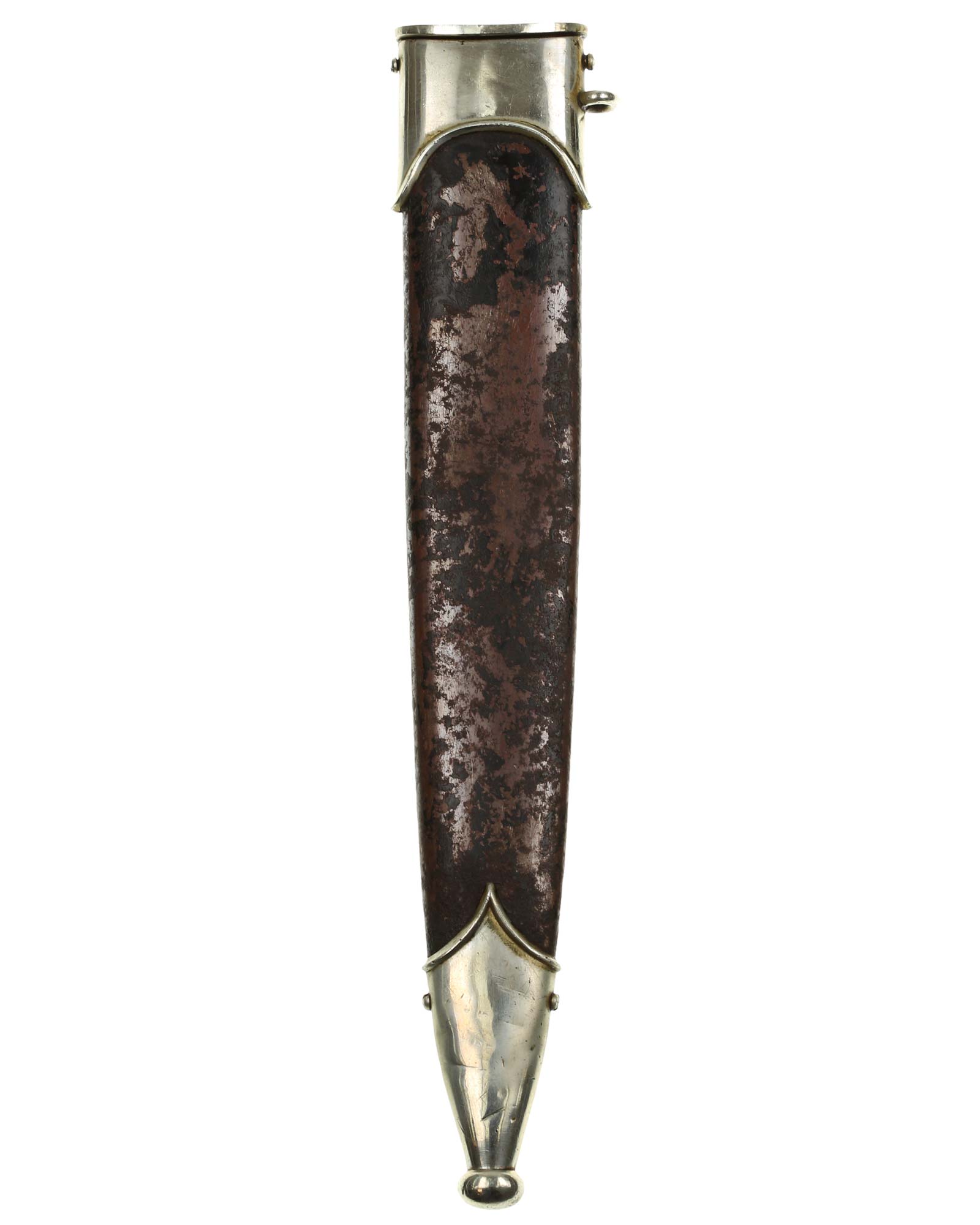 Scabbard: The scabbard shell is straight throughout. There are also traces of protective lacquer clinging to the areas that were protected by the mounts. The mounts are also choice through to the lower ball. They exactly match the patination of the crossguards, and are retained by four nickel screws.