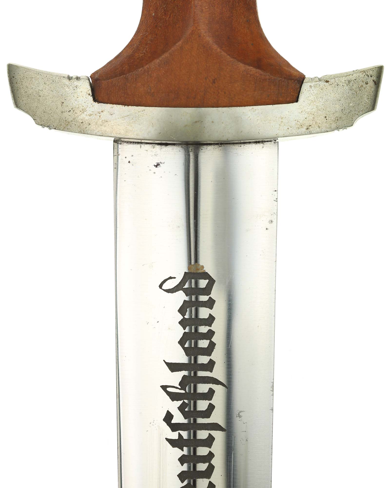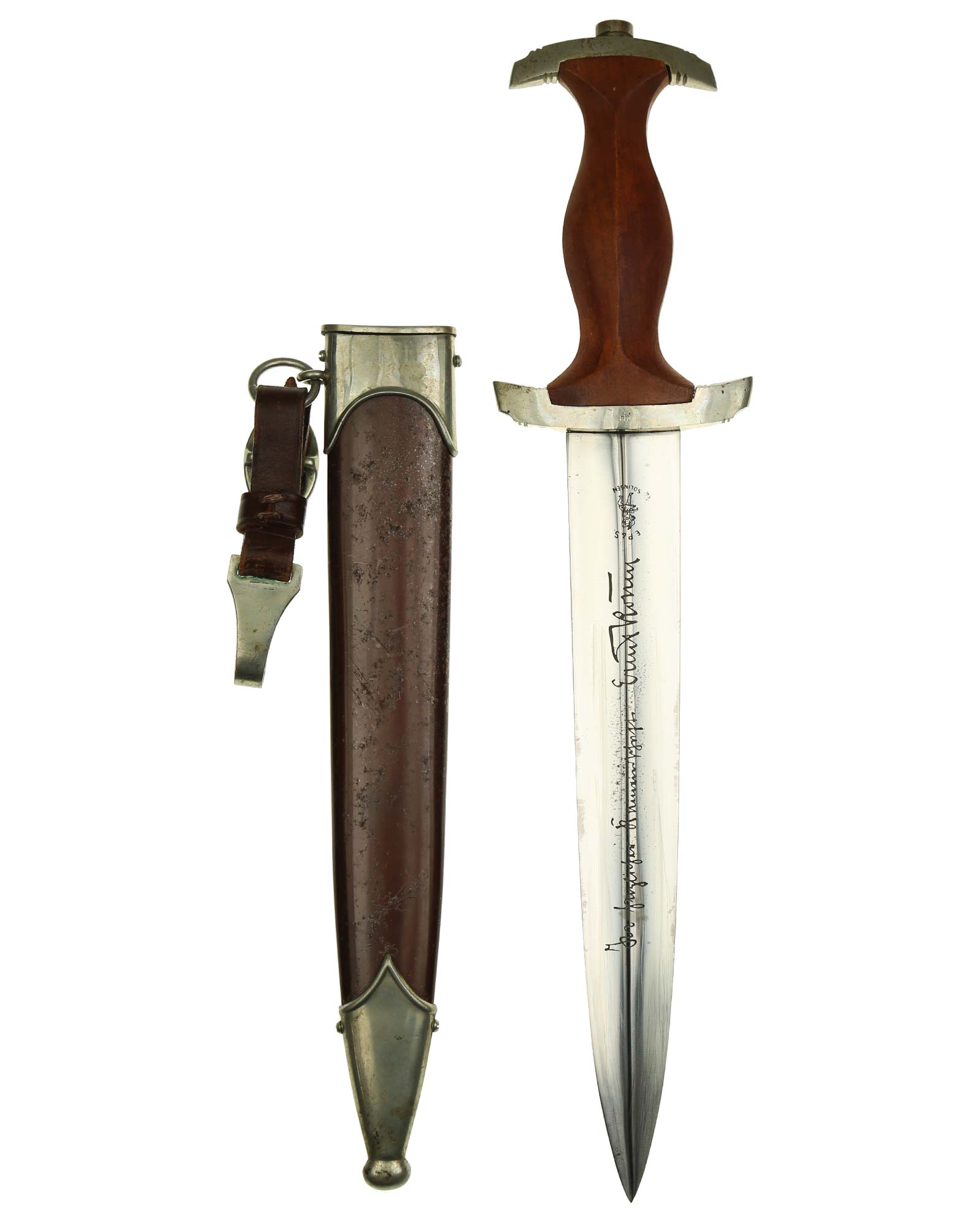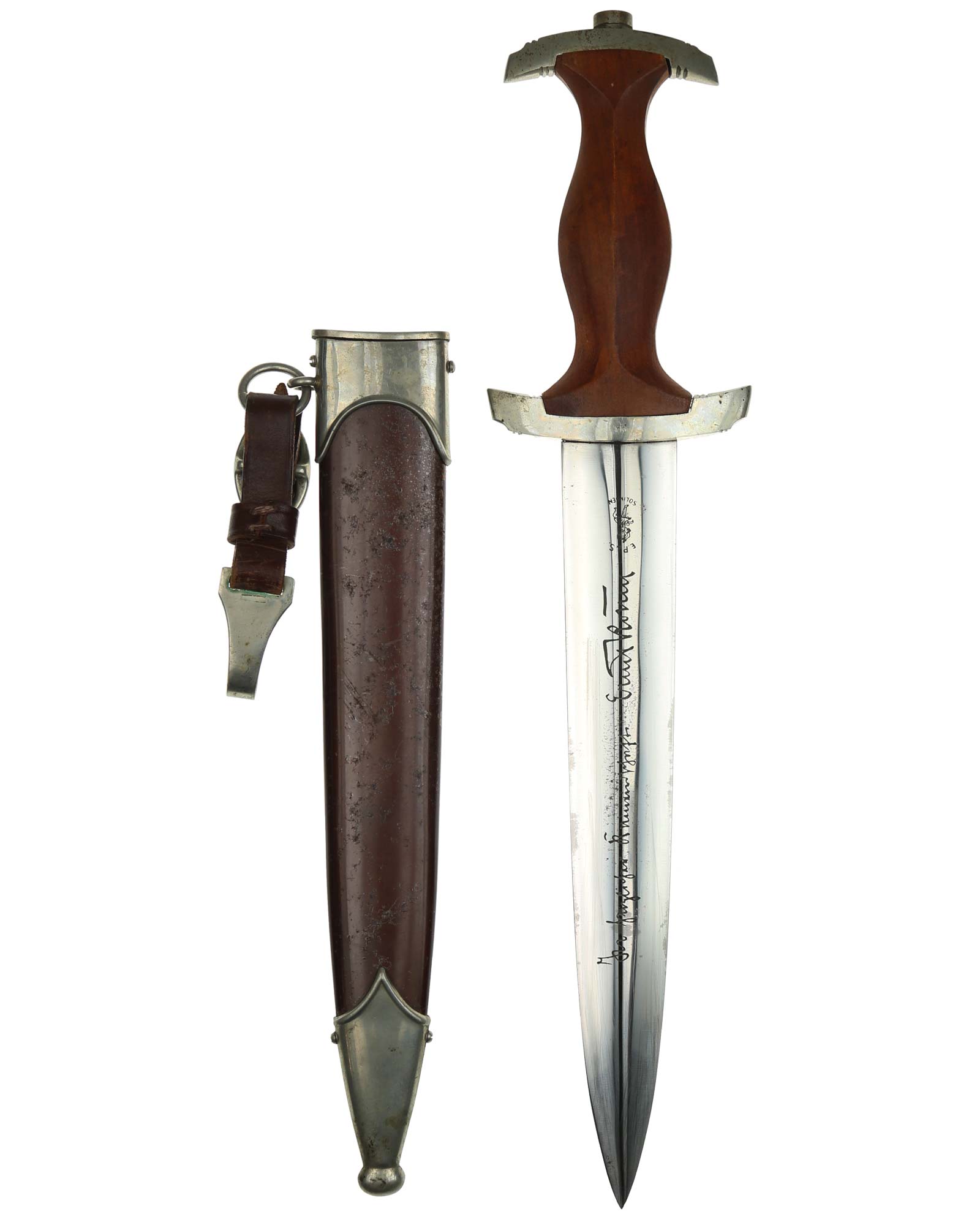 This SA [Sturmabteilung] Honor Dagger in Near Mint condition. Model 1933. The total length is 37.1 cm. Early Nickel fittings, lower guard with "Nrh" stamp. The Dagger has the full rohm inscription: In herzlicher Kameradschaft Ernst Rohm. Maker mark on the blade: E.P.&S. in Solingen.