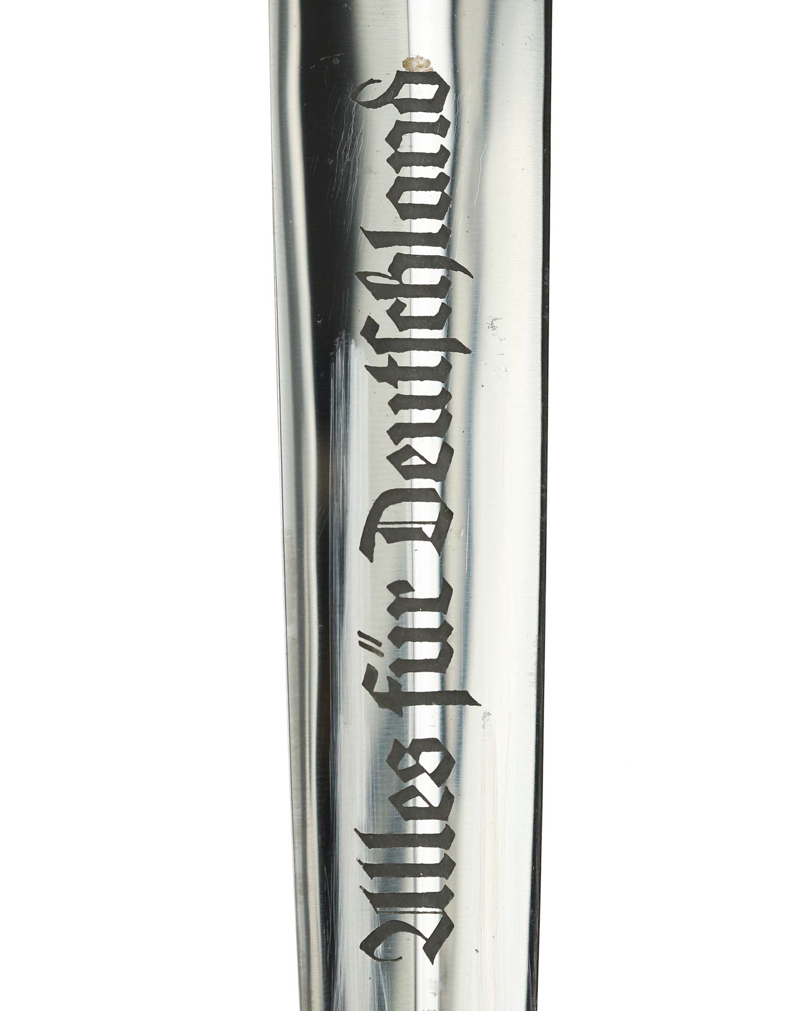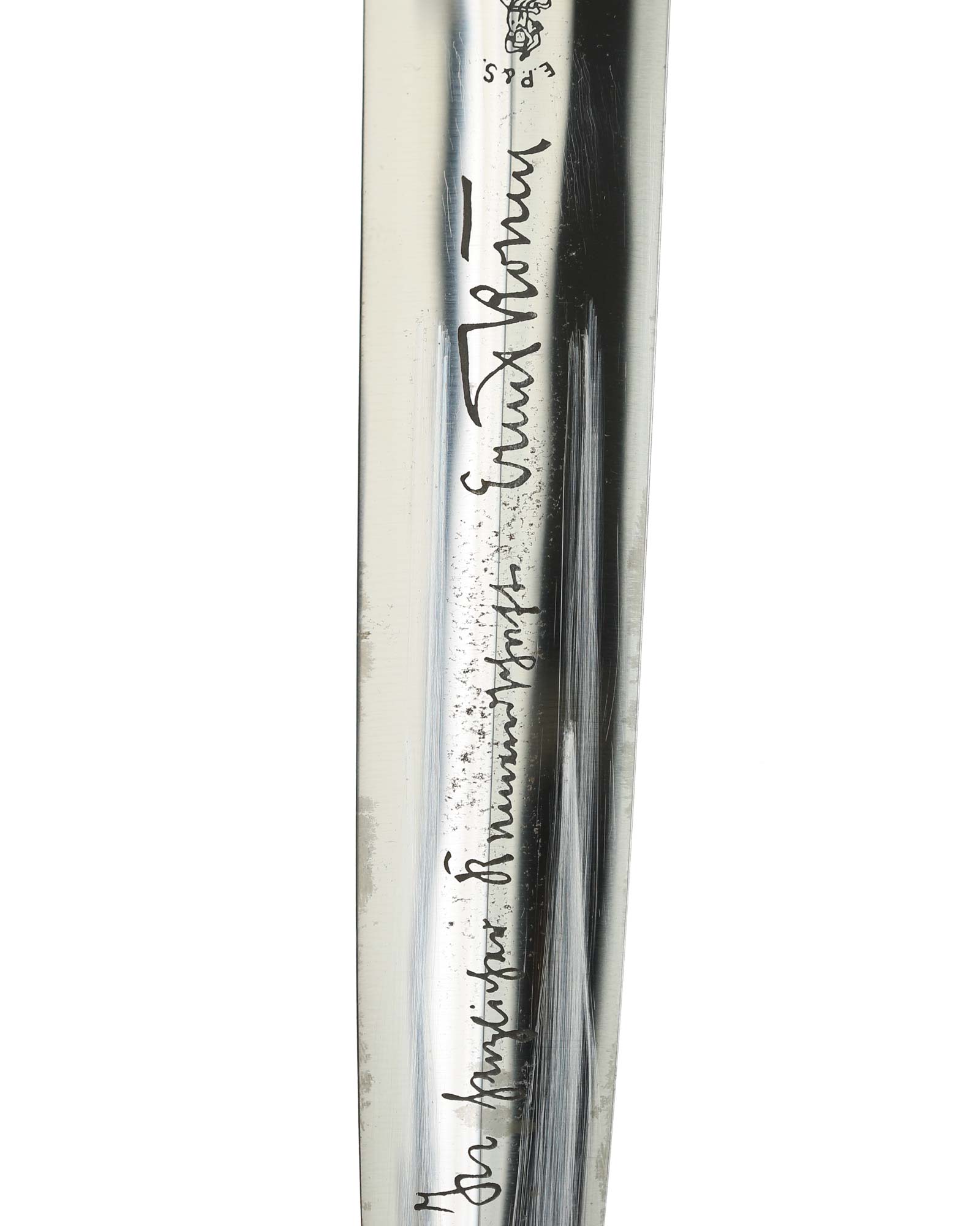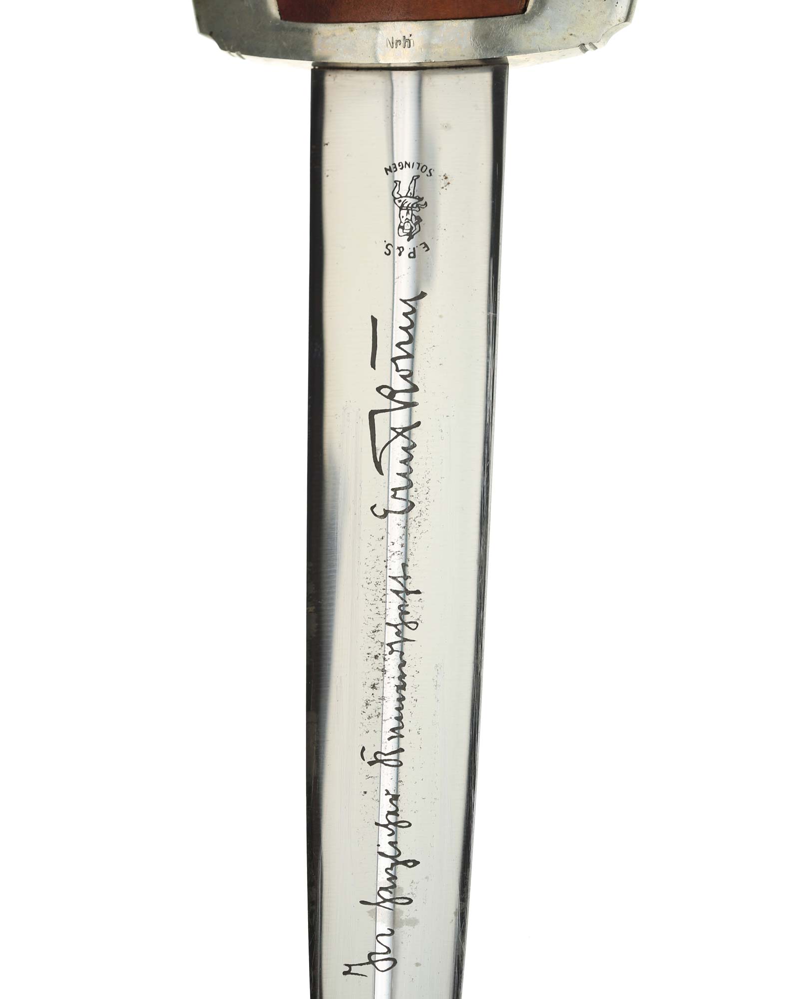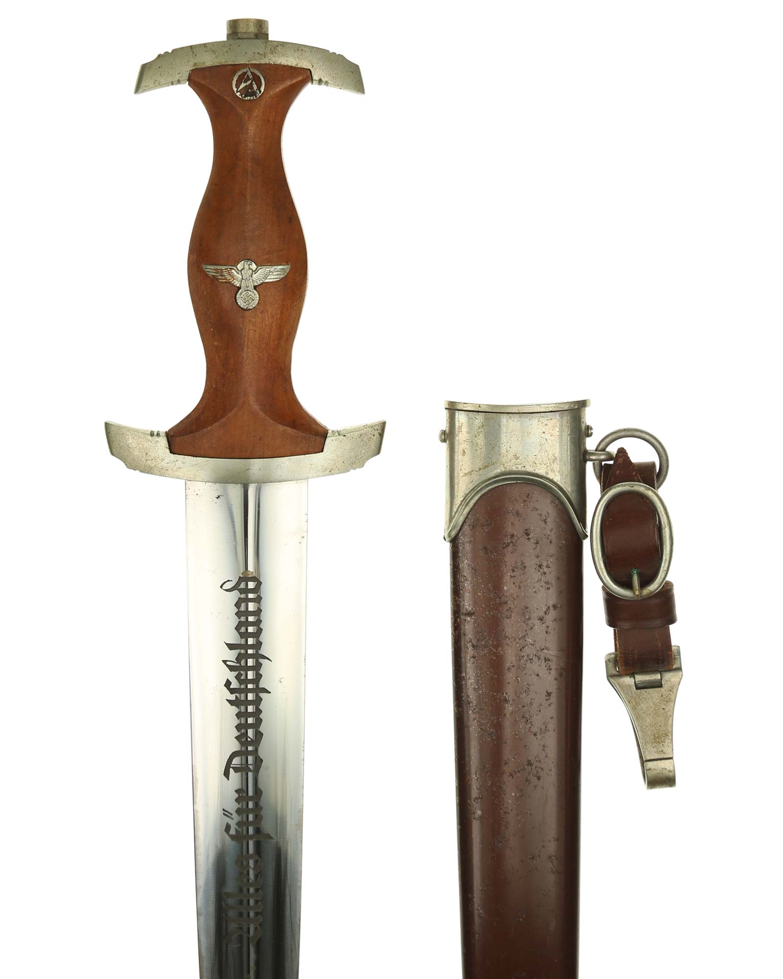 This SA [Sturmabteilung] Honor Dagger in Near Mint condition. Model 1933. The total length is 37.1 cm. Early Nickel fittings, lower guard with "Nrh" stamp. The Dagger has the full rohm inscription: In herzlicher Kameradschaft Ernst Rohm. Maker mark on the blade: E.P.&S. in Solingen.