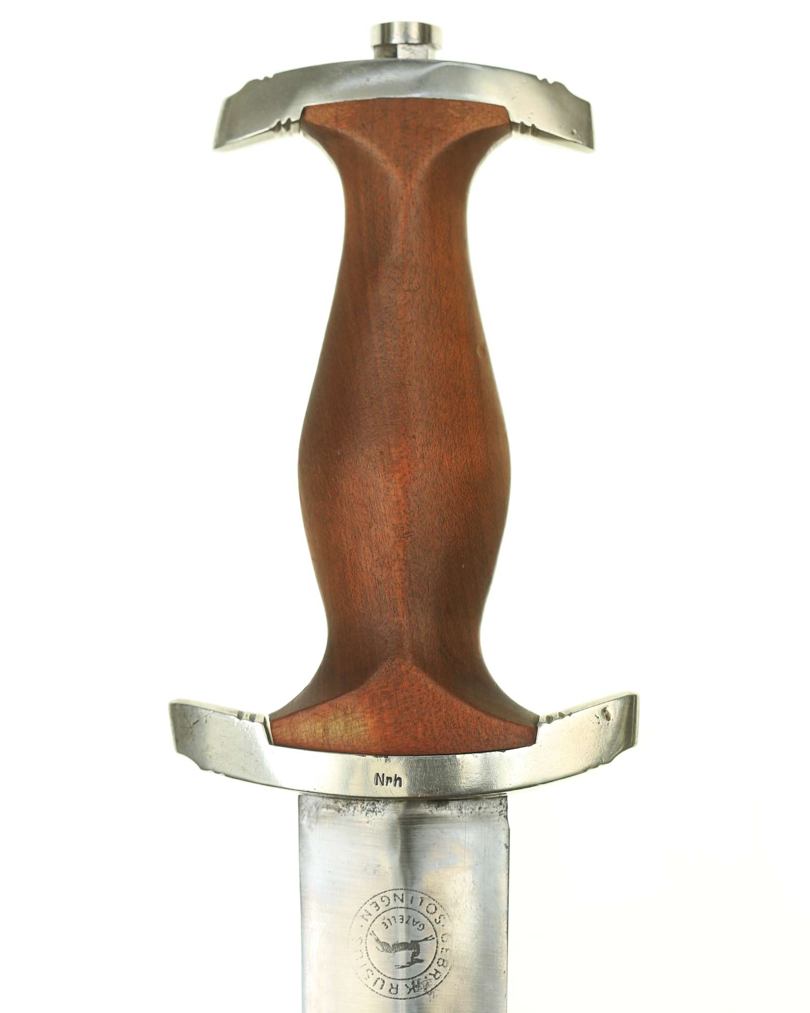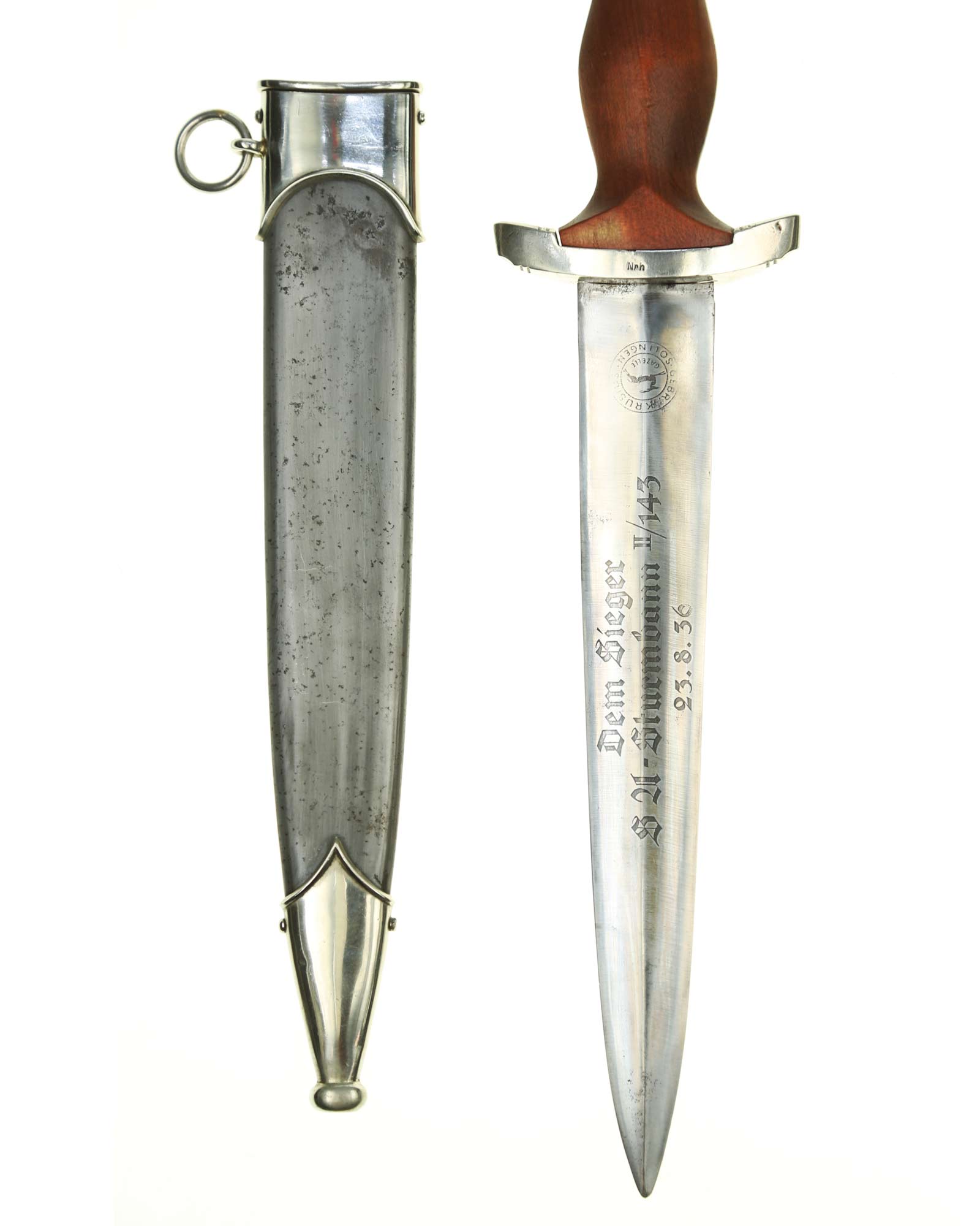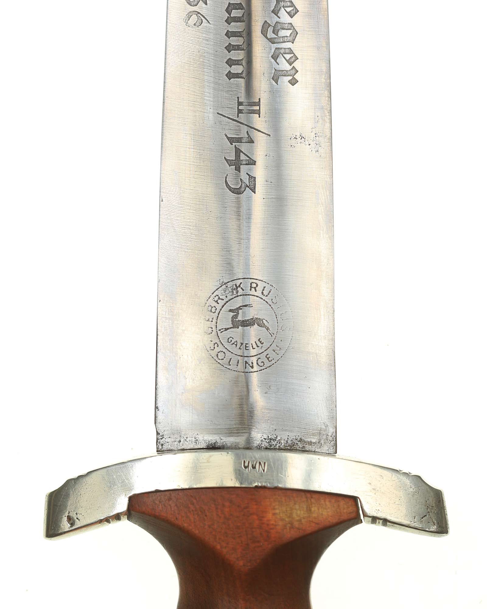 Blade: The blade is in fine condition. The reverse ricasso is etched with the firm's name and location, “Gebr. Krusius (GAZELLE) Solingen” contained with ovals and the inscription: Dem Sieger SA-Sturmbann II/143, 23.8.36 (To the victor SA-Sturmbann II/143, 23.8.36).