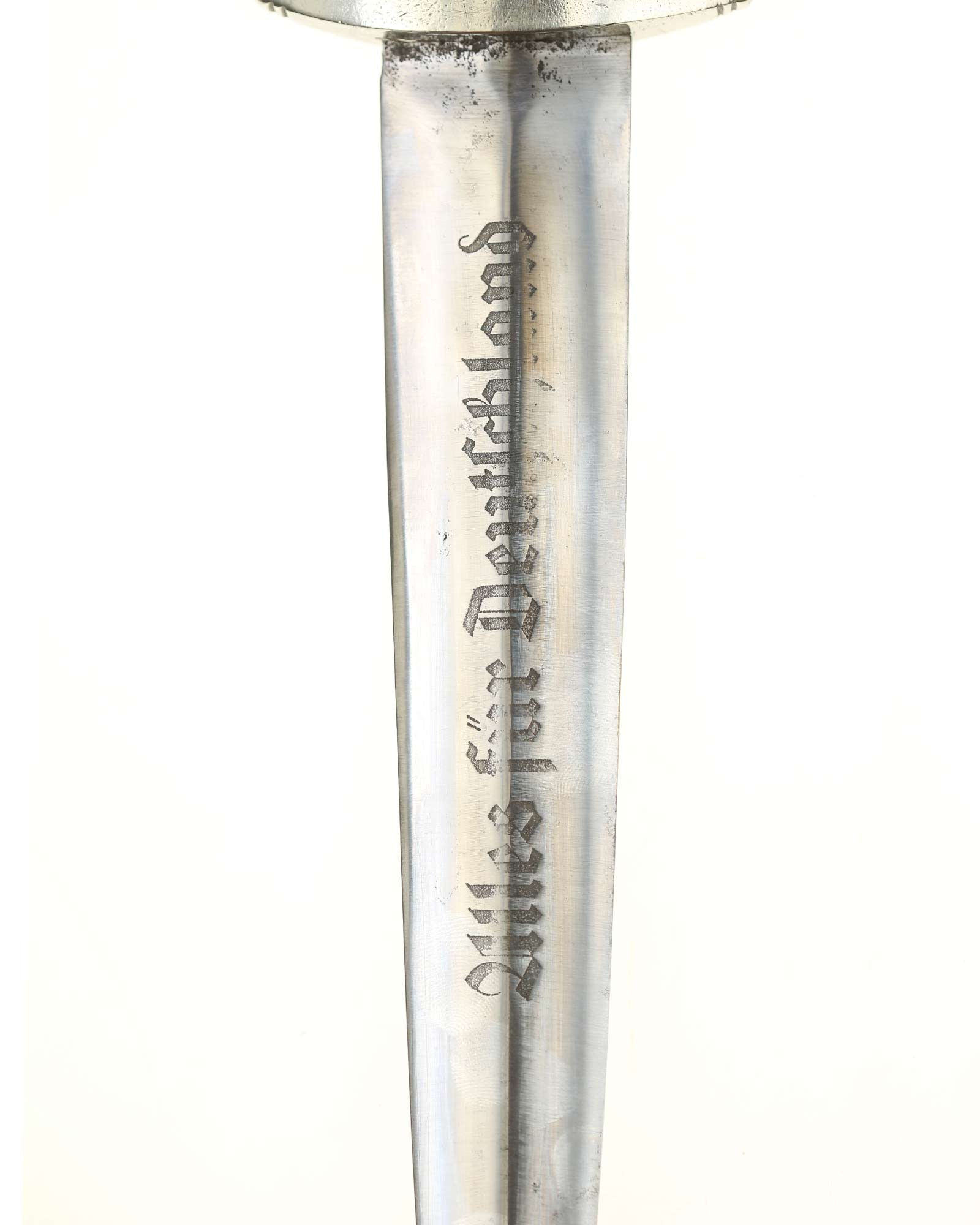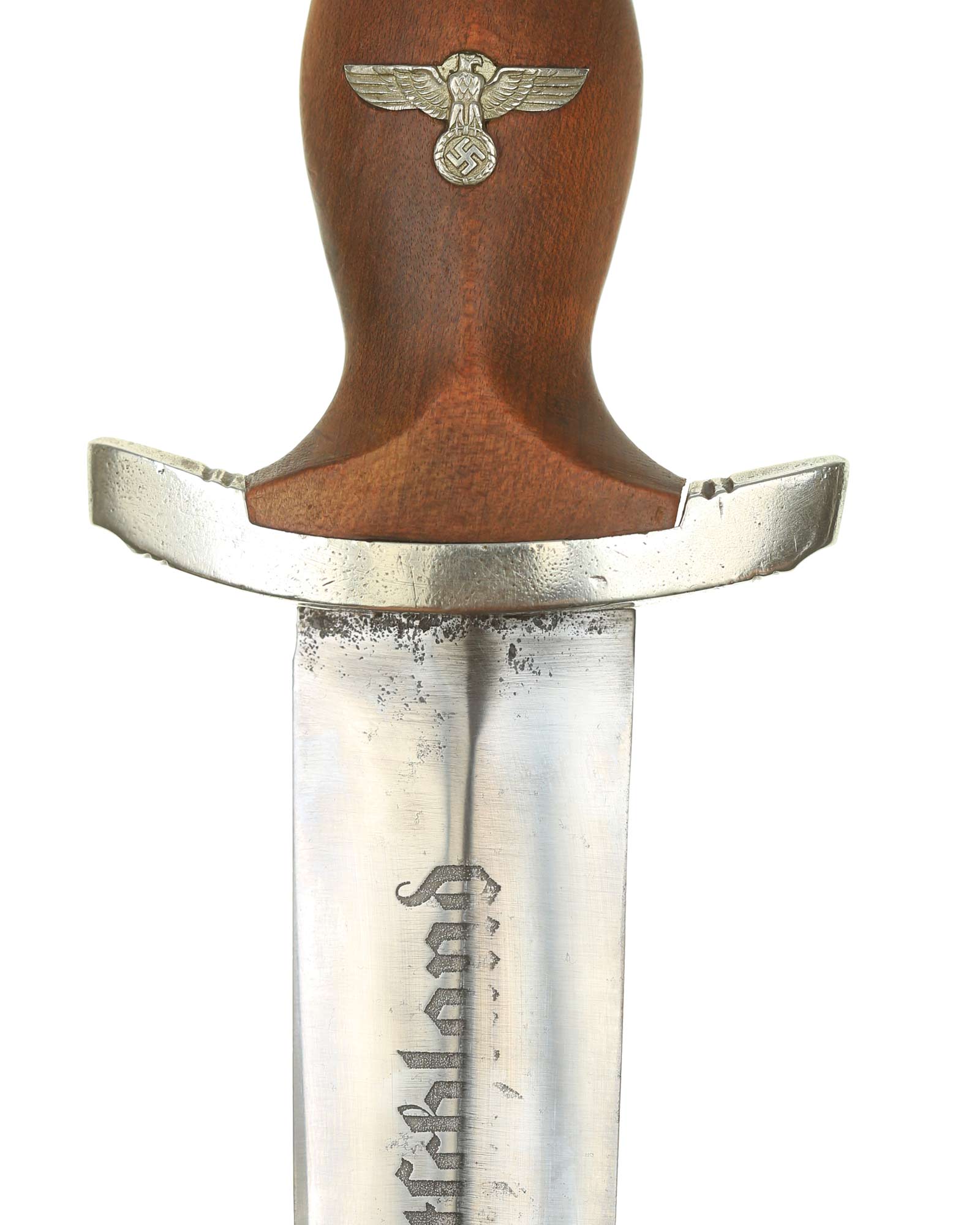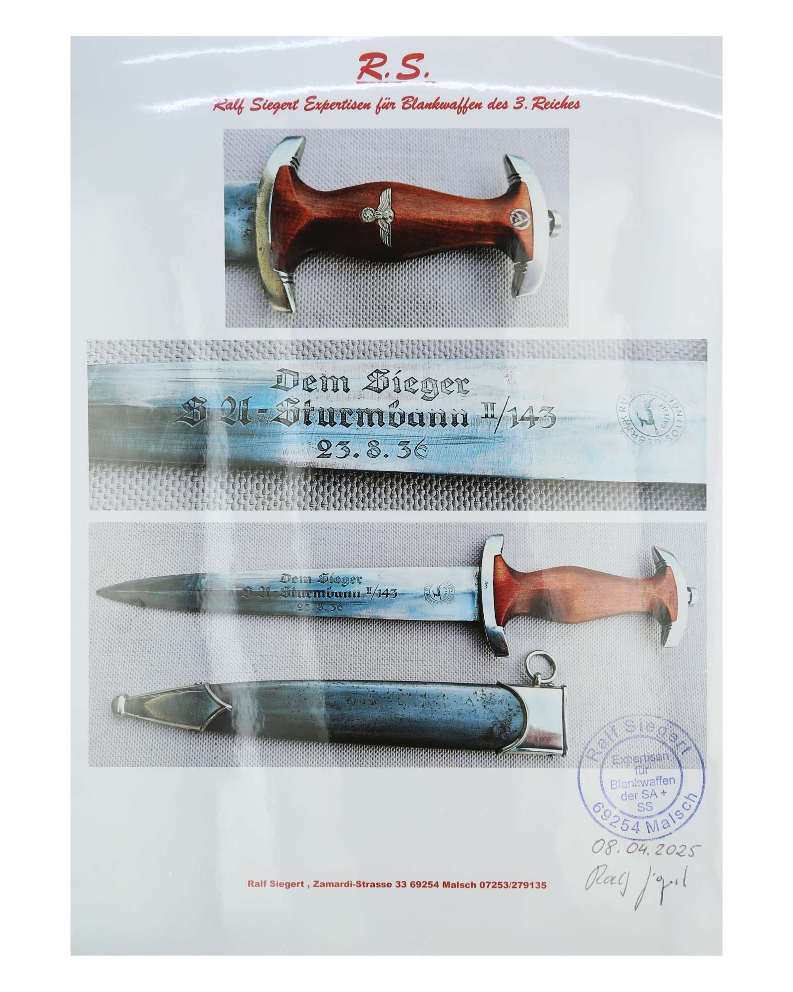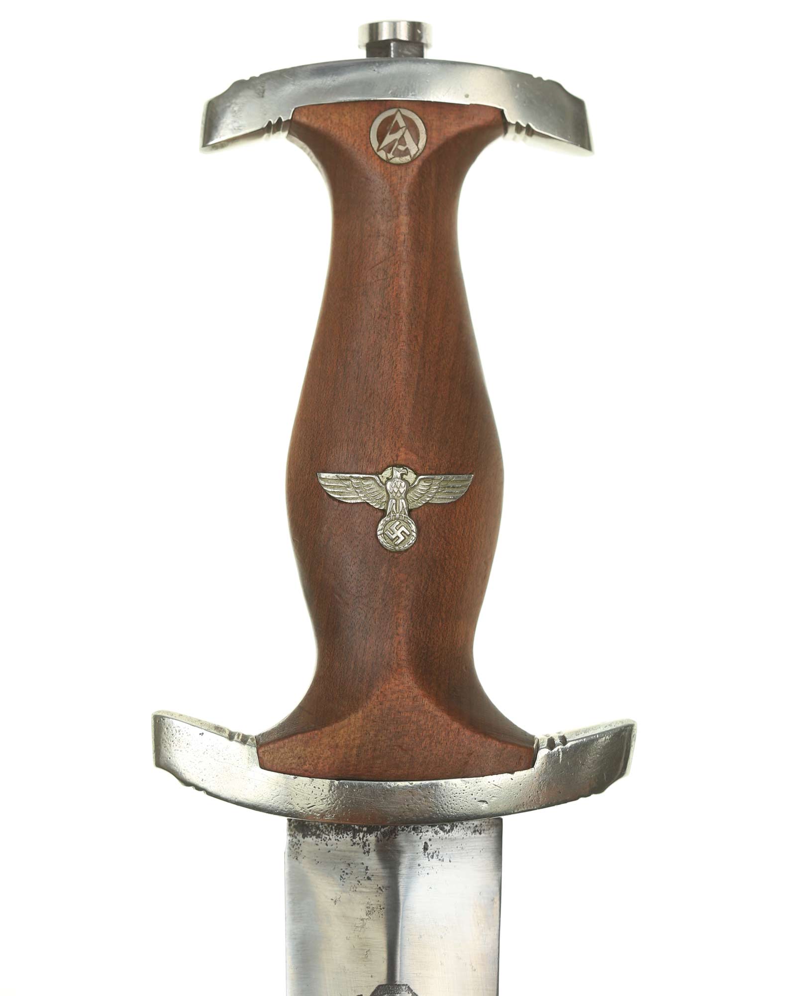 Blade: The blade is in fine condition. The reverse ricasso is etched with the firm's name and location, “Gebr. Krusius (GAZELLE) Solingen” contained with ovals and the inscription: Dem Sieger SA-Sturmbann II/143, 23.8.36 (To the victor SA-Sturmbann II/143, 23.8.36).