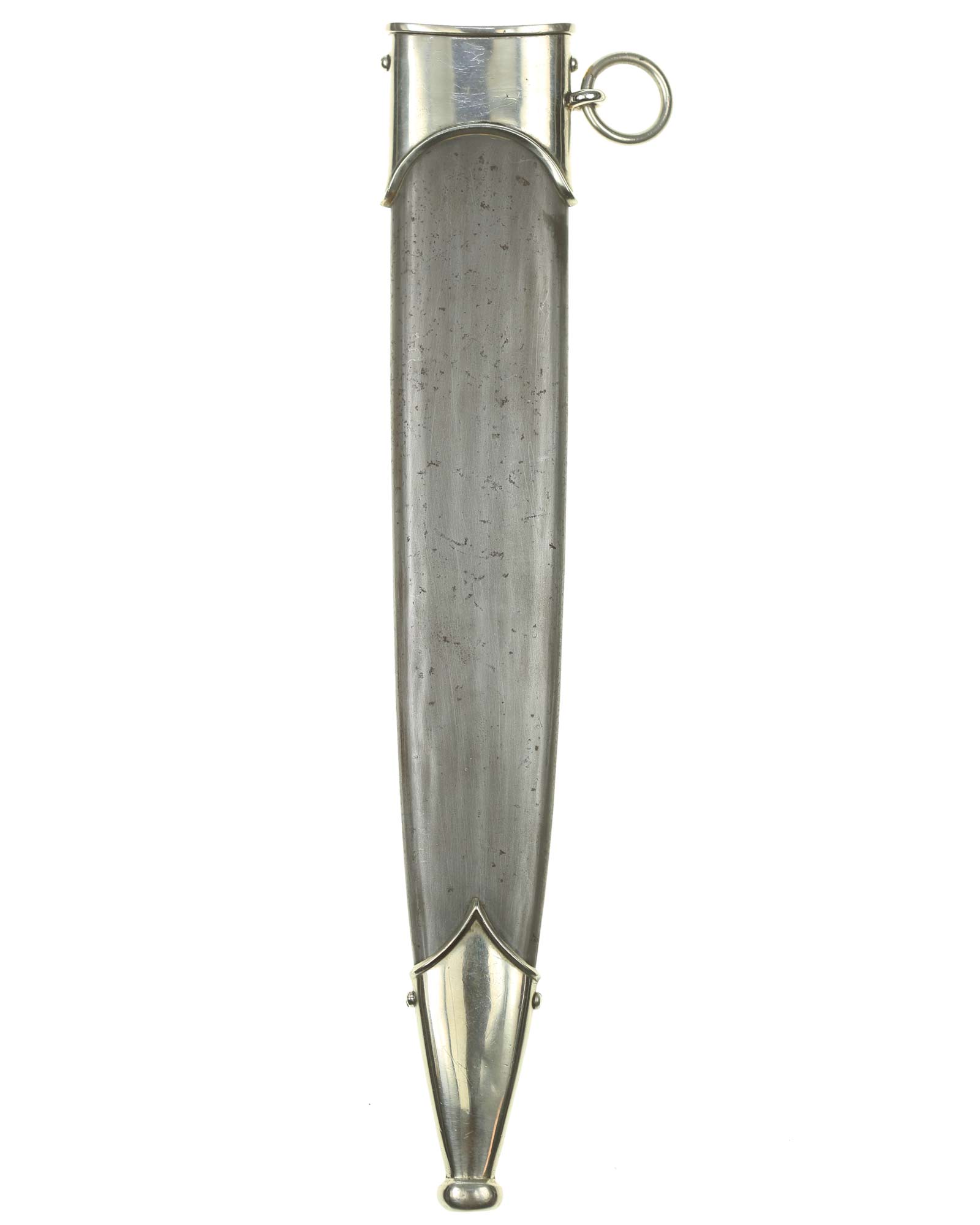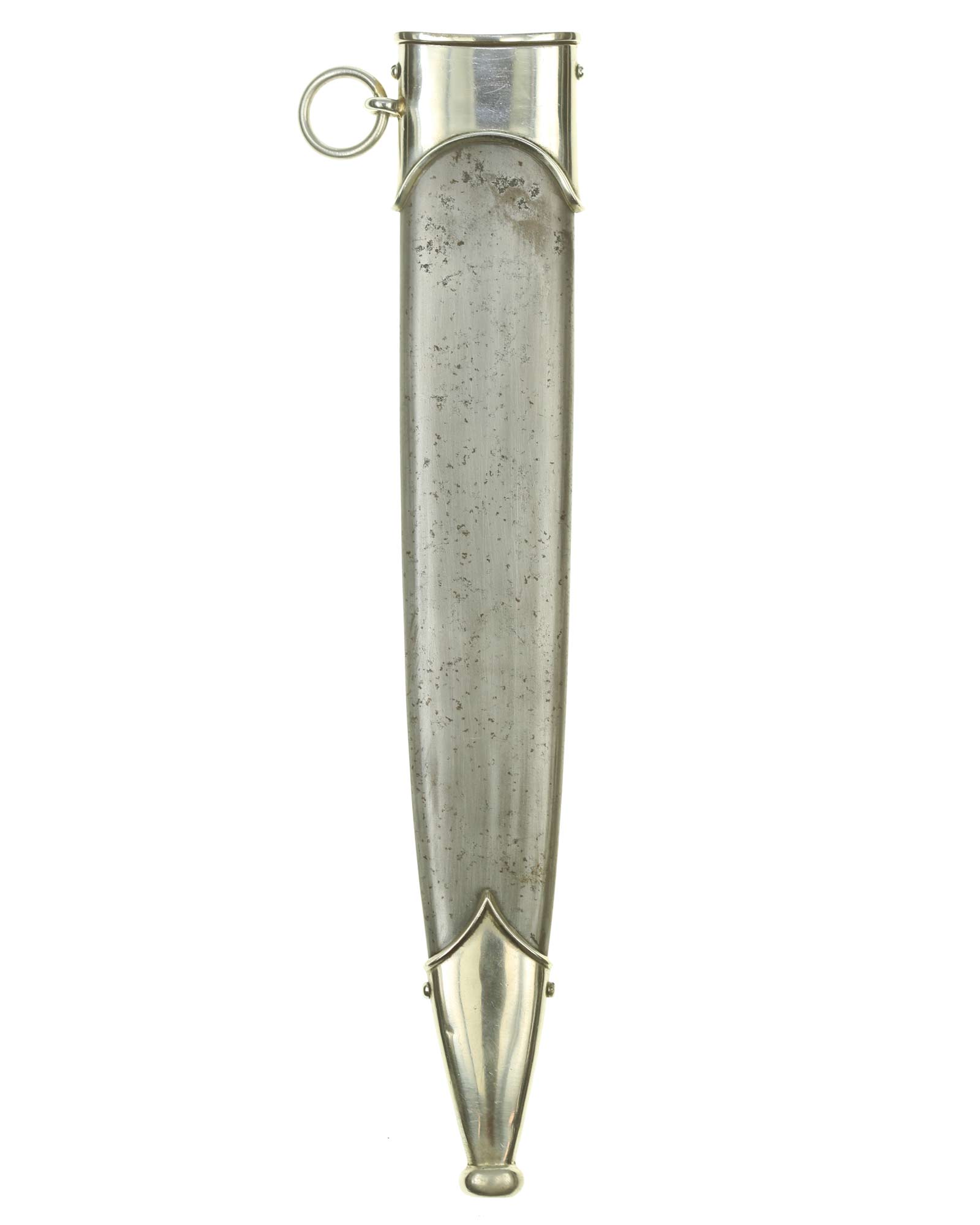 Scabbard: The scabbard shell is a fine example. There is also some original lacquer scattered around the scabbard. A few minor age spots are visible in the finish, but overall it is a pretty nice example. The scabbard mounts are of solid matching nickel, in good condition.