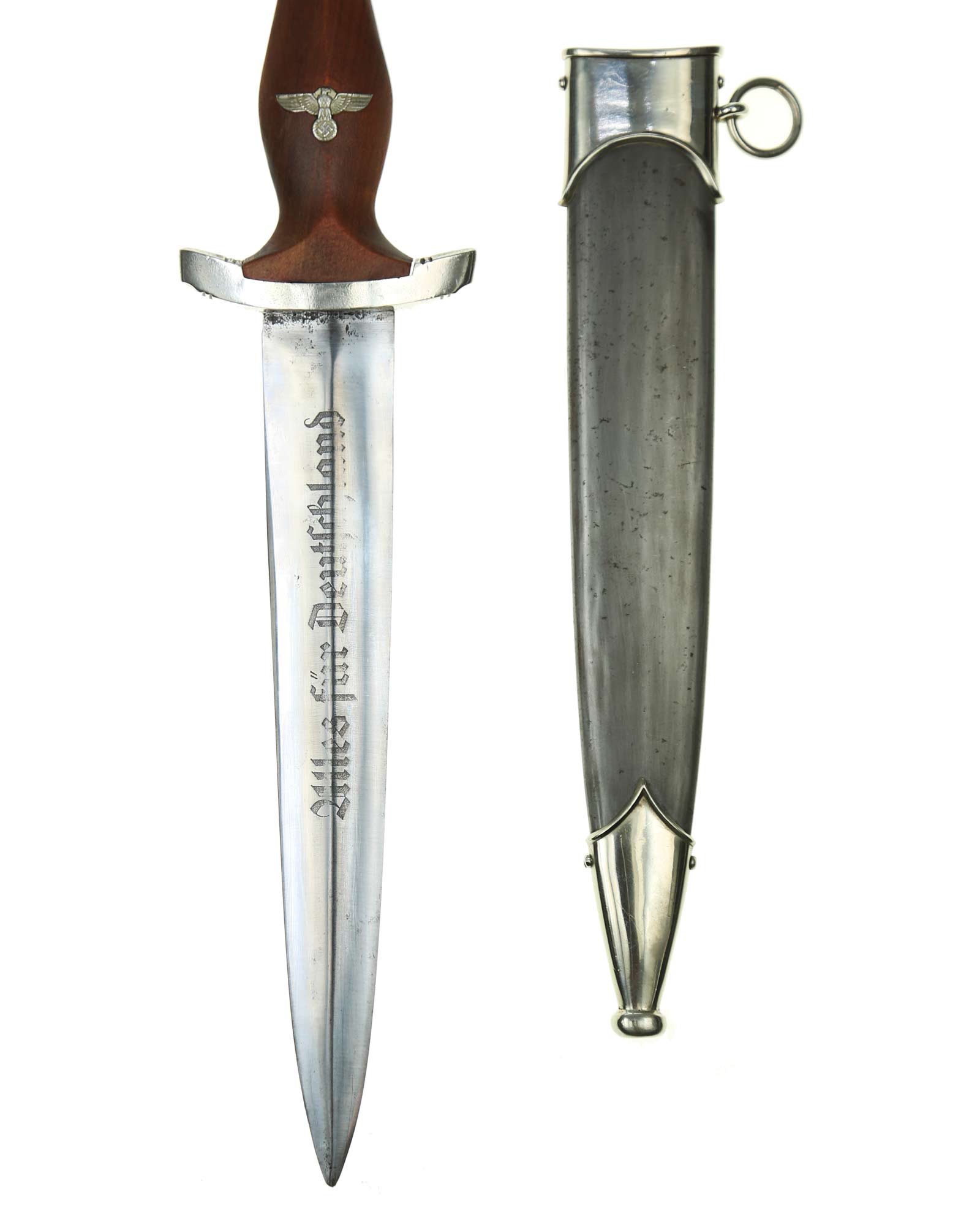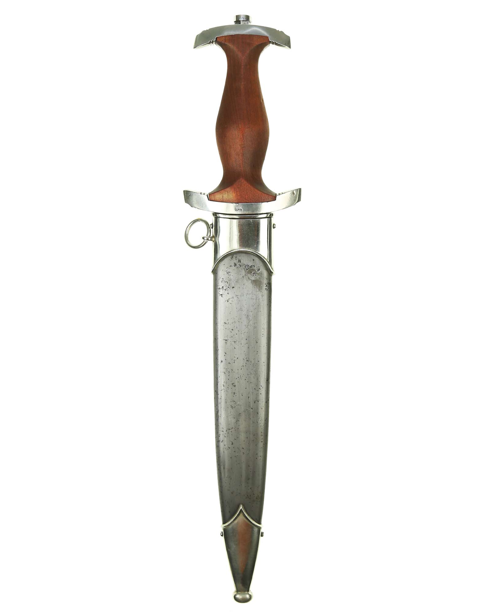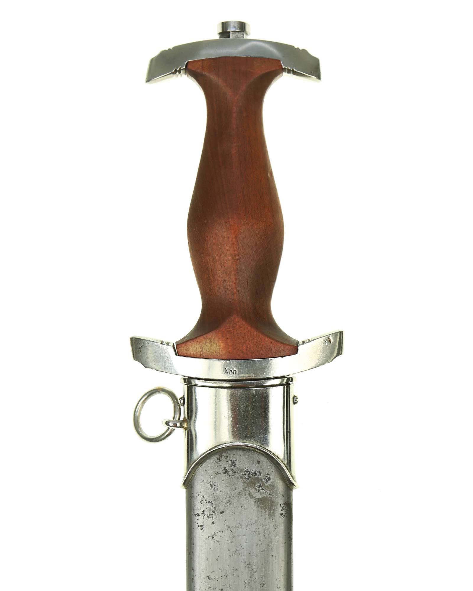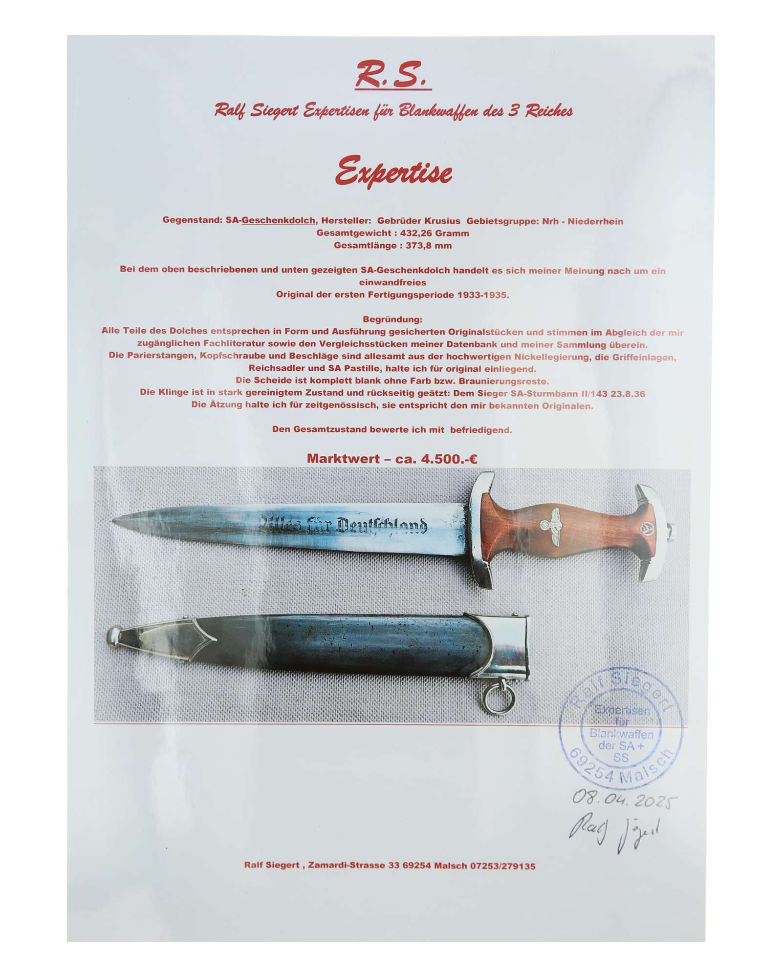 This SA [Sturmabteilung] Honor Dagger is in EXC+ condition. Model 1933. The total length is 37.4 cm. Early Nickel fittings. Maker mark on the blade: Gebr. Krusius (GAZELLE) Solingen.