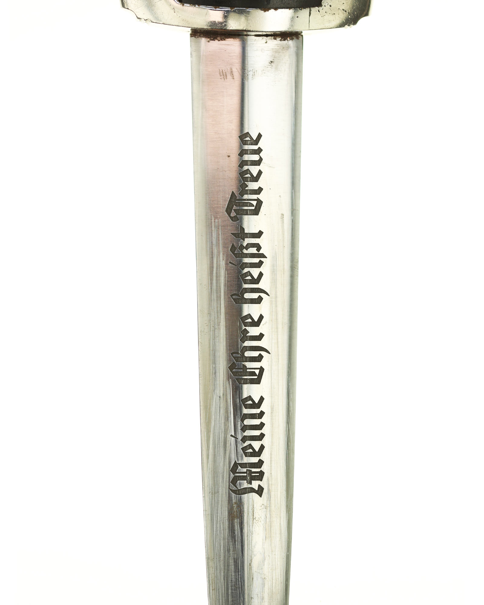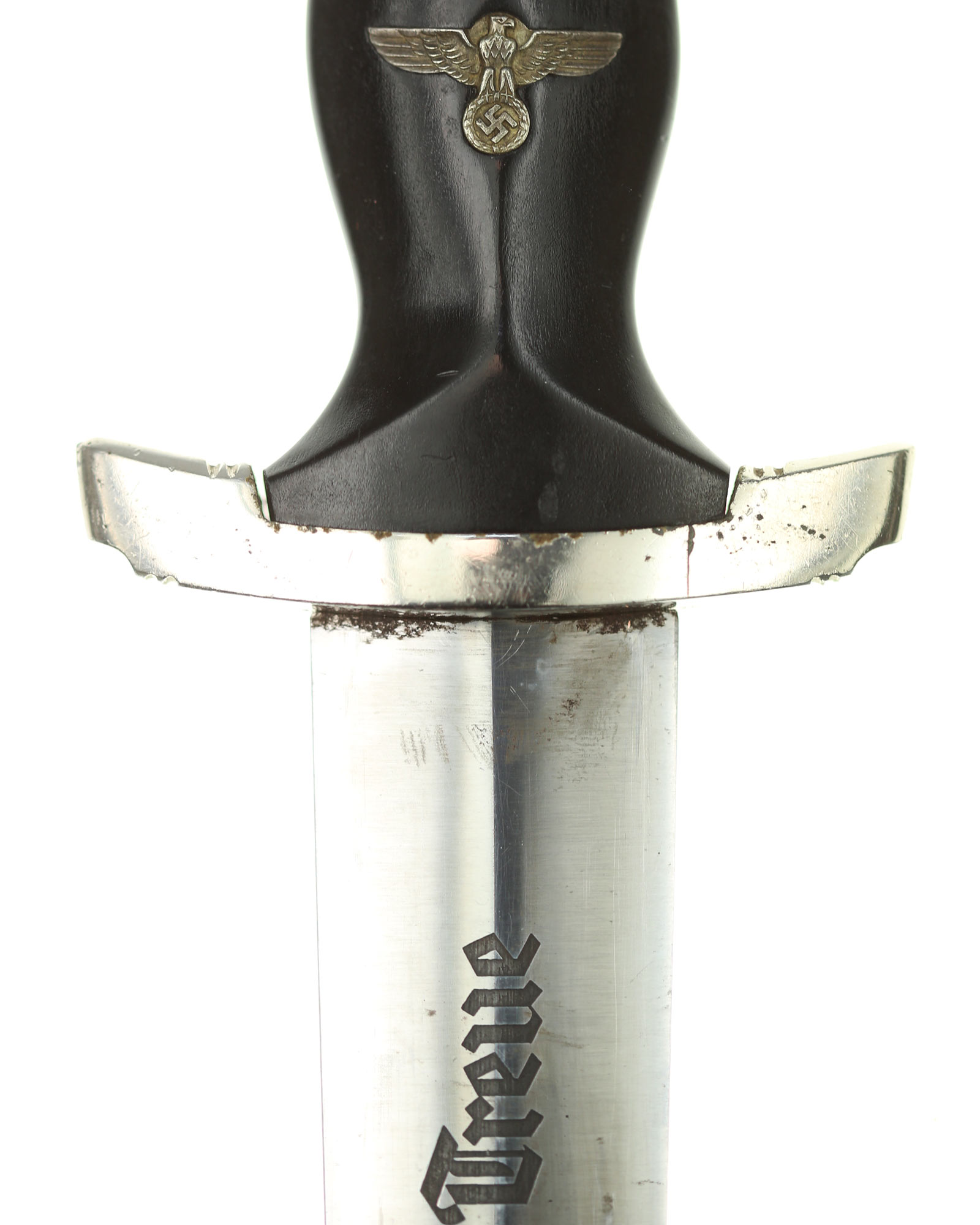 Blade: The unmarked blade is a EXC example. The dark, acid etched “Meine Ehre heisst Treue” motto is nice. The tip comes to a perfect point and the fit is tight and set right against the crossguard.