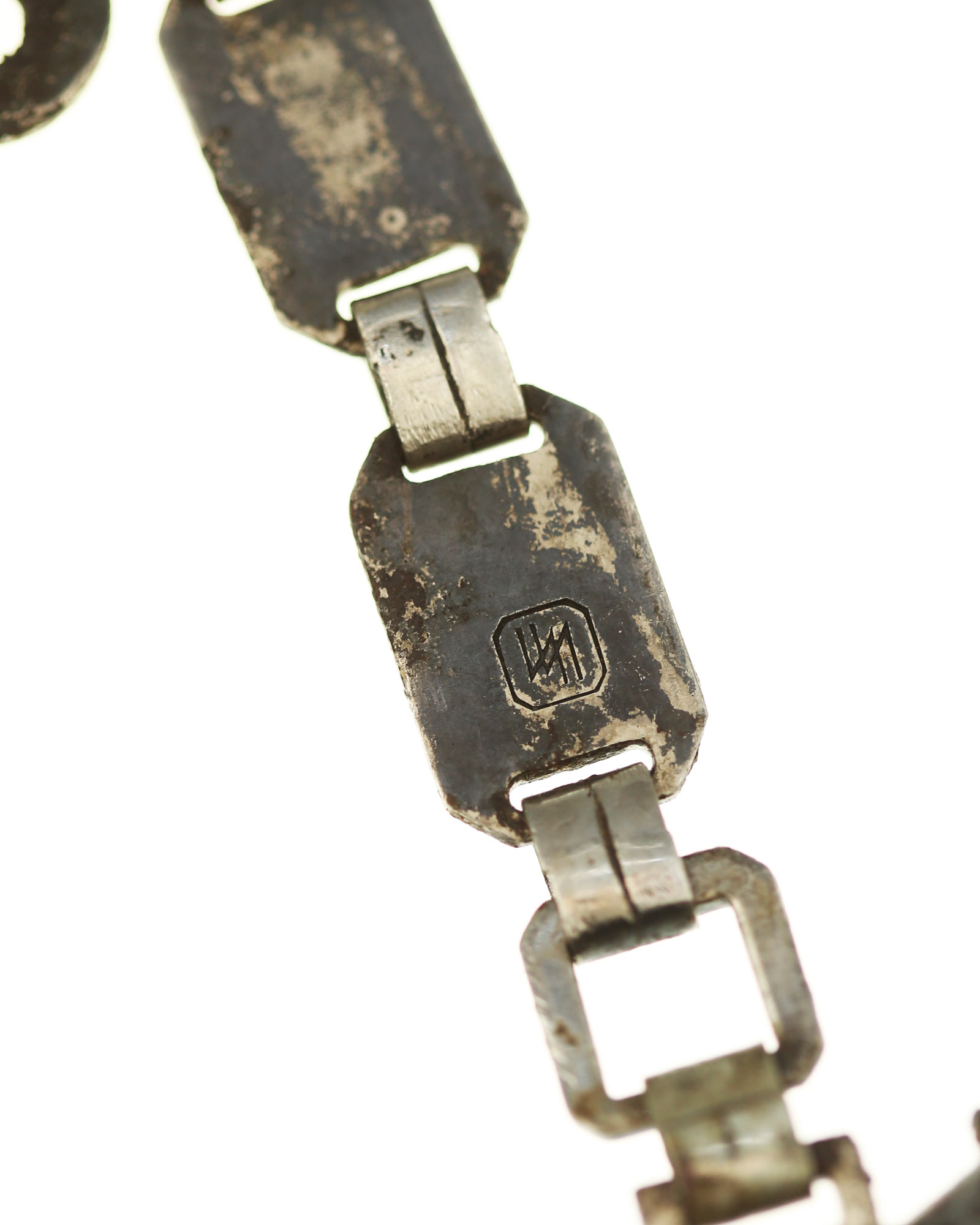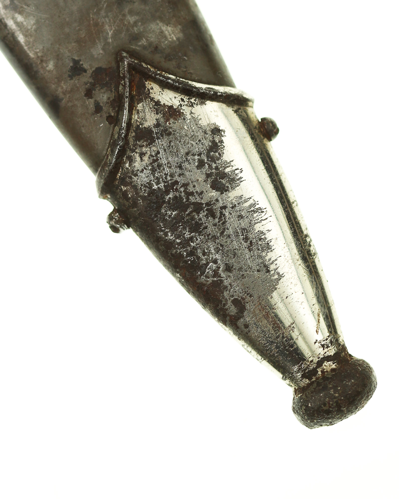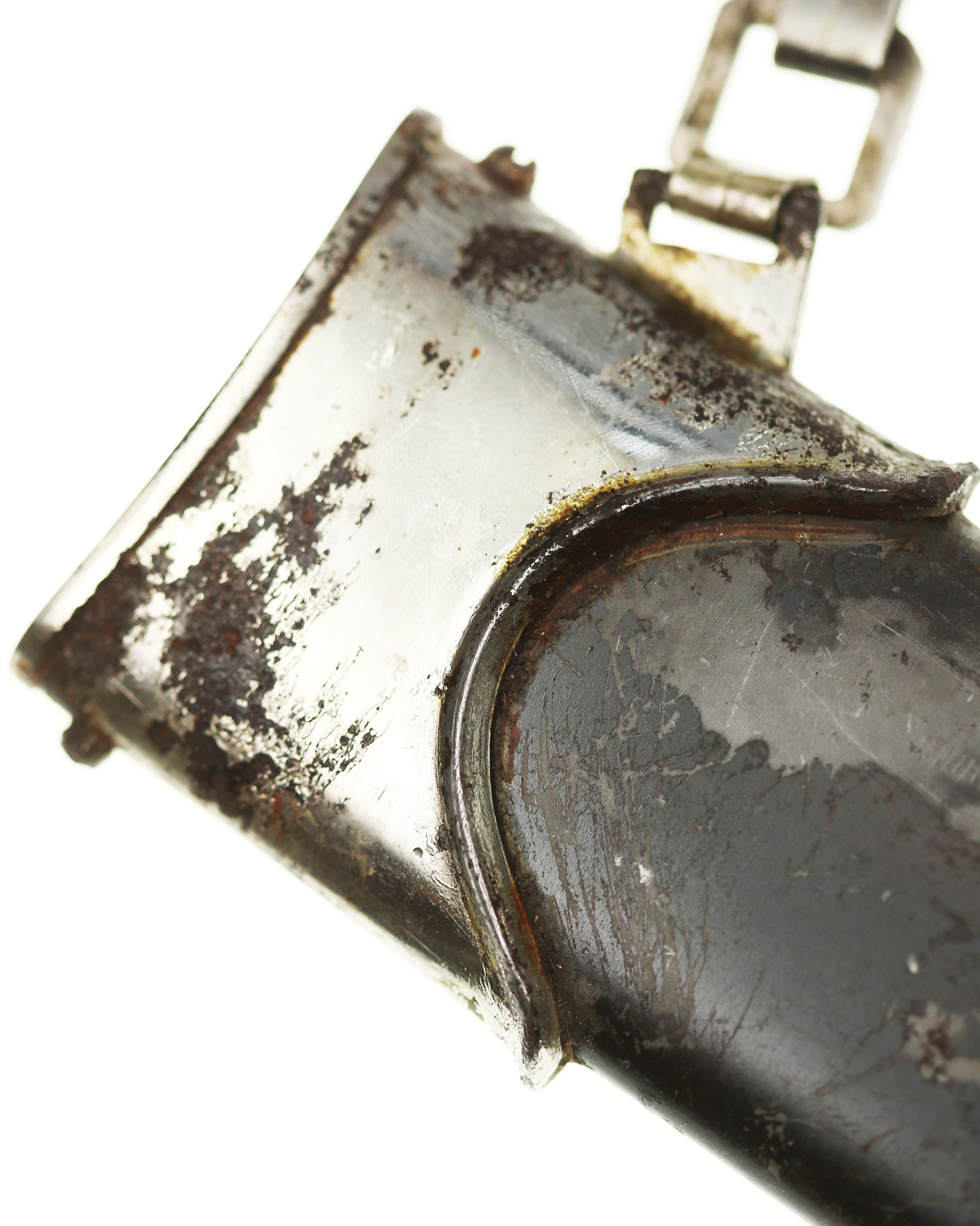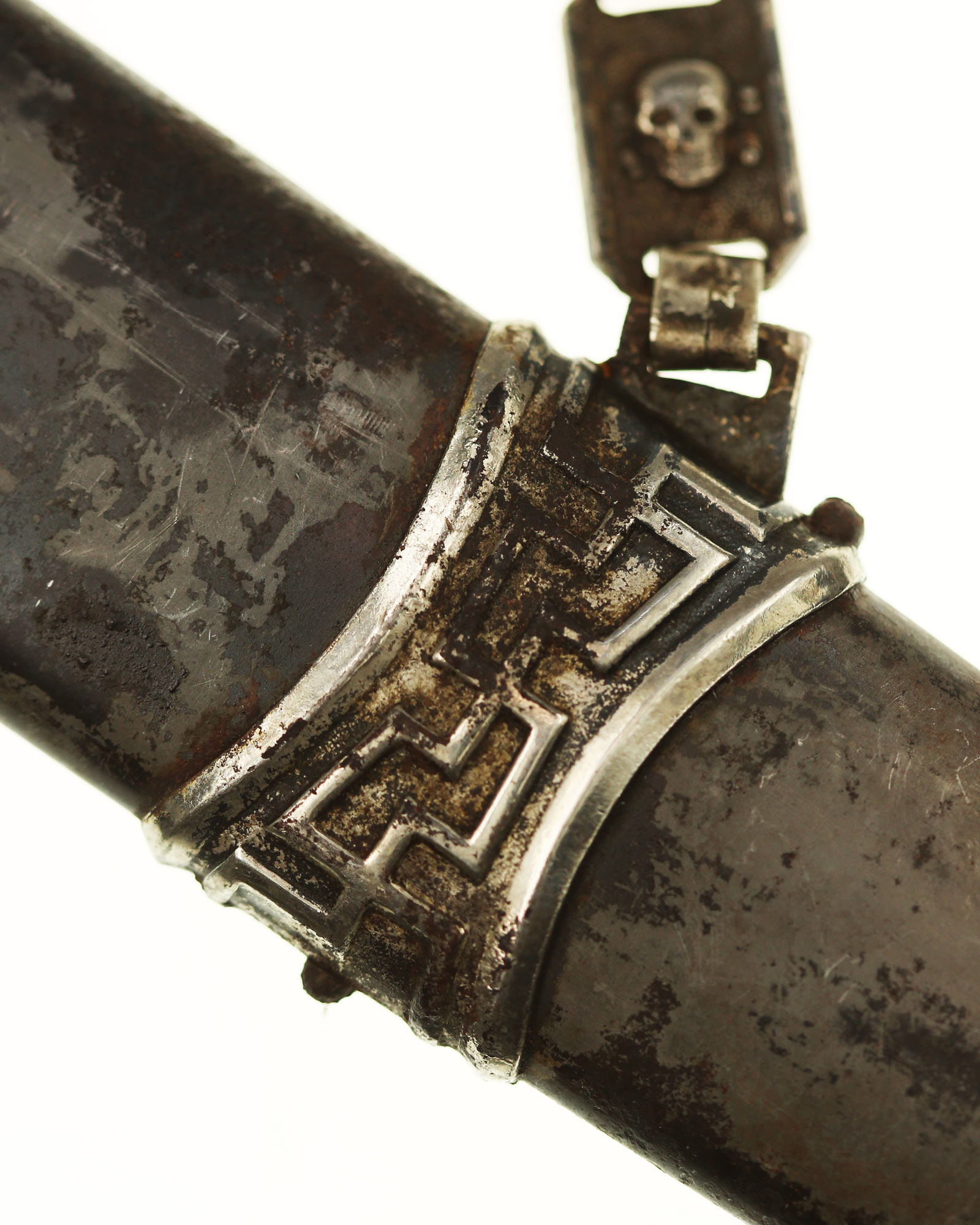 Scabbard: The scabbard shell is straight throughout. It has an excellent anodized finish. The solid nickel scabbard fittings look great matching the crossguards in color, patina and age wear. All five screws remain intact. The chain is the early Type II - T. Wittmann or B2 - R. Siegert nickel based version featuring all of the correct attributes. The chain links show wonderful detail to the skulls and SS runes. The correct first upper link is clearly “SS” proof marked.