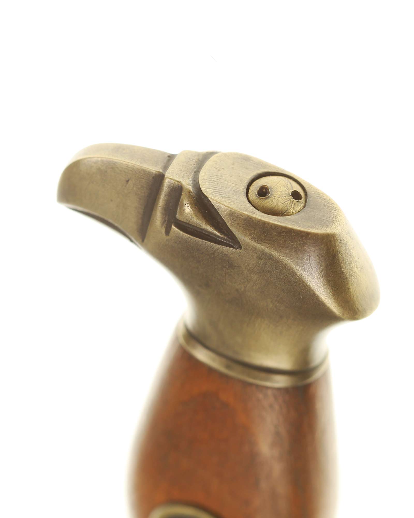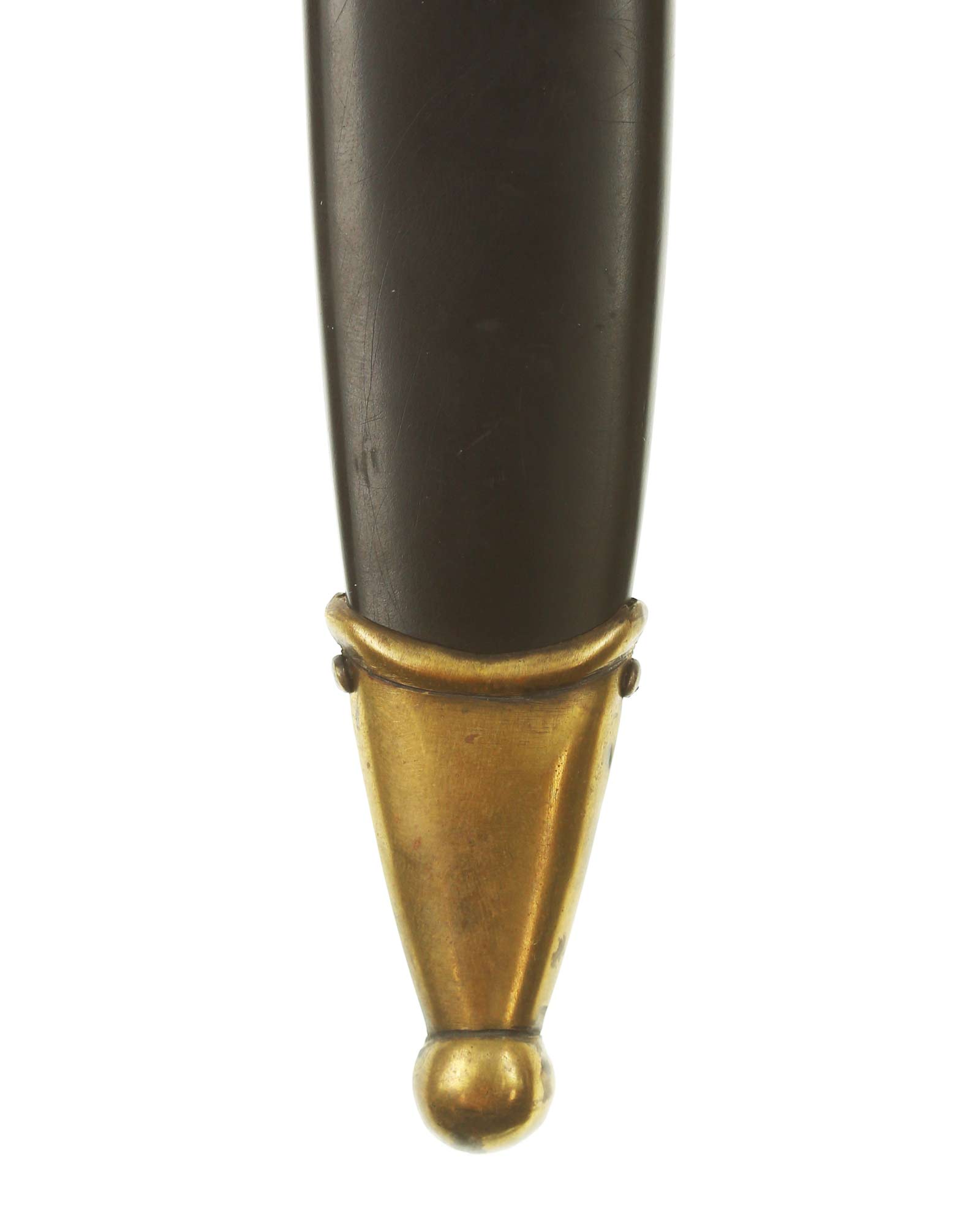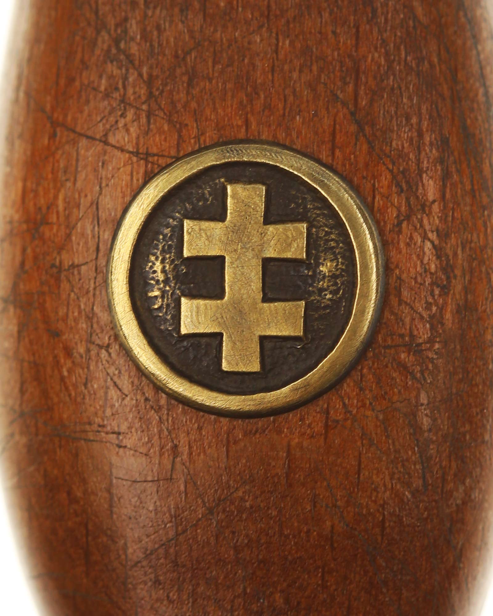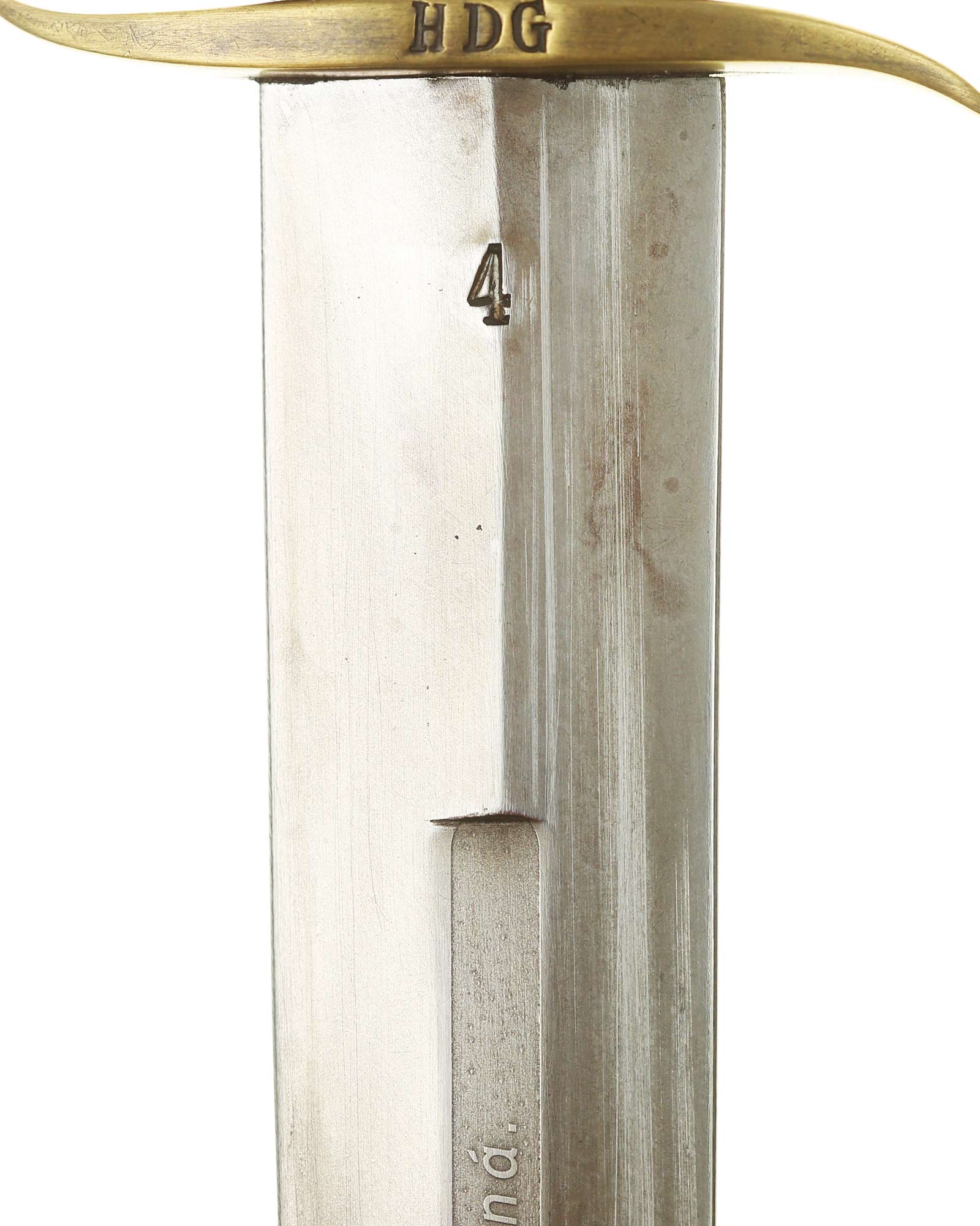 Grip: Hilt fittings in fine condition, lower crossguard marked, “HDG”. Medium brown, wooden grip shows light surface wear with no hairline cracks, chips or damage.