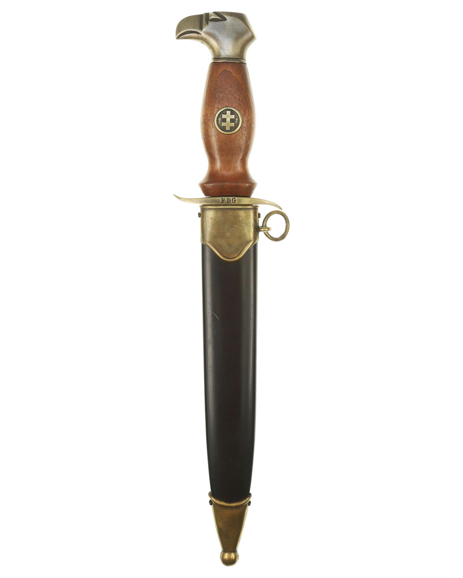 This Hlinka Guard [HG] Dagger is in EXC++ condition. Model 1939. The total length is 36.8 cm. Lower guard with "HDG" stamp. The Dagger is stamped with "4" on the blade.