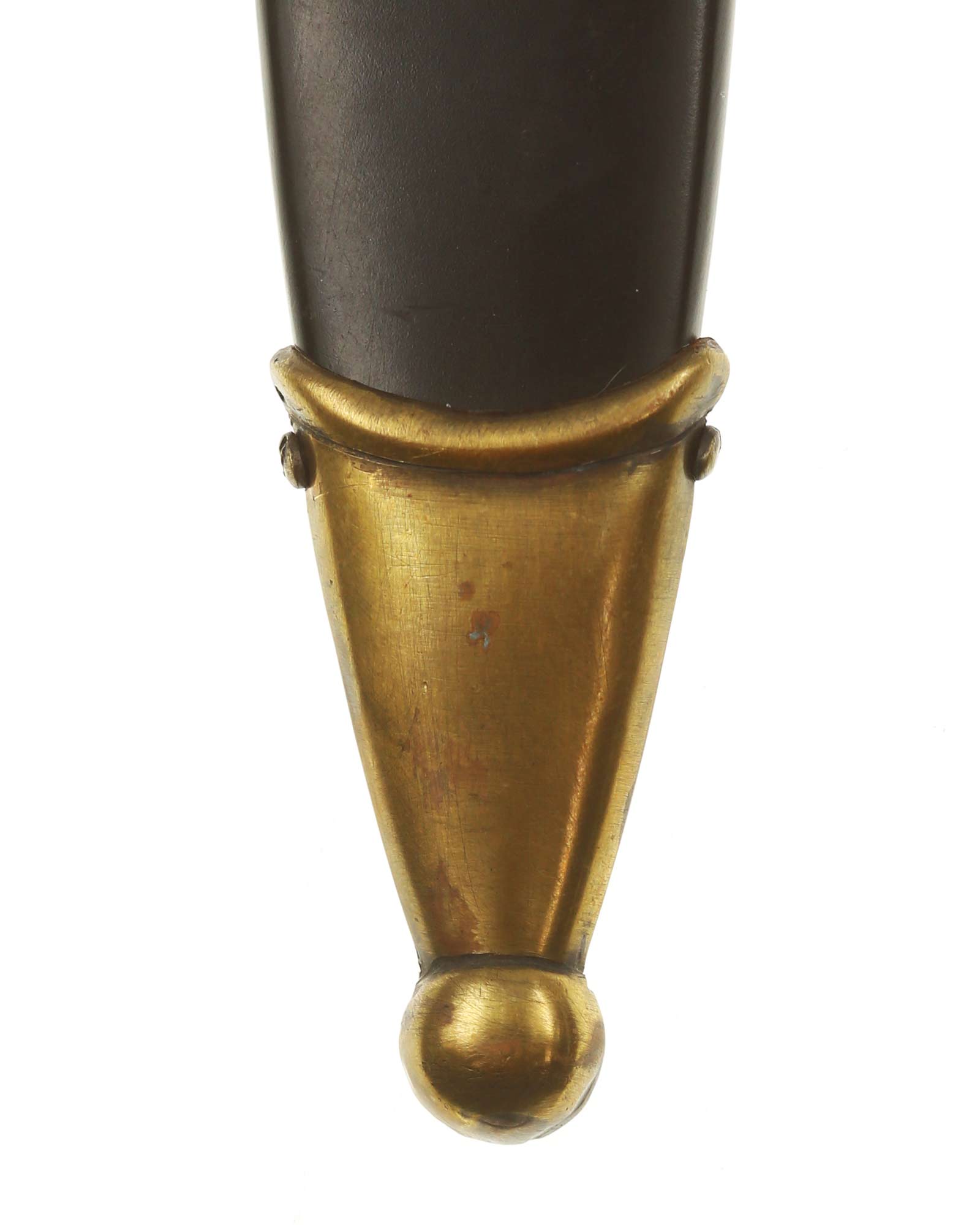 Scabbard: The scabbard shell is straight throughout. The black painted body has a gloss finish, magnetic, exhibiting moderate contact marks and surface wear in the paint from active use. They exactly match the patination of the crossguards, and are retained by screws.