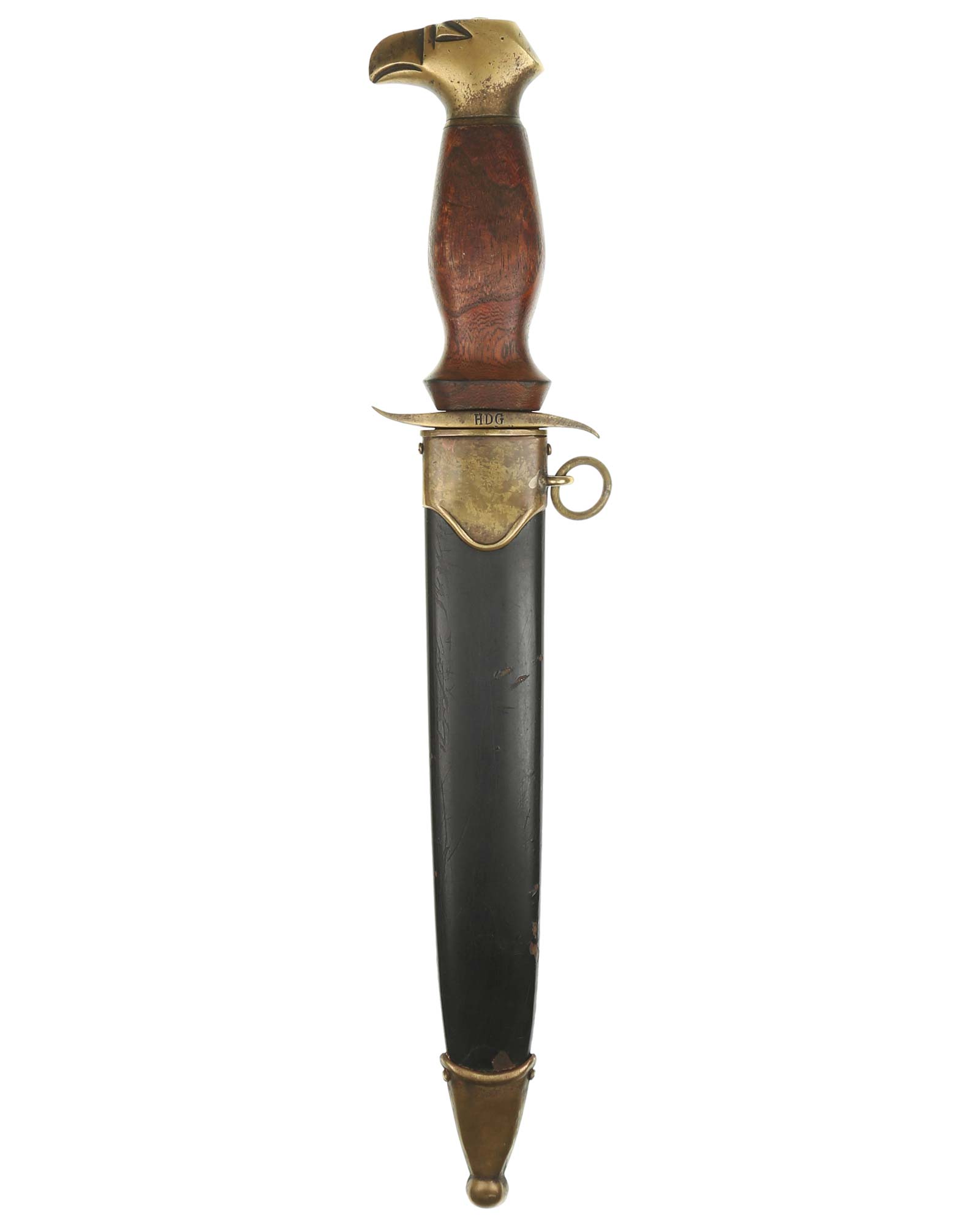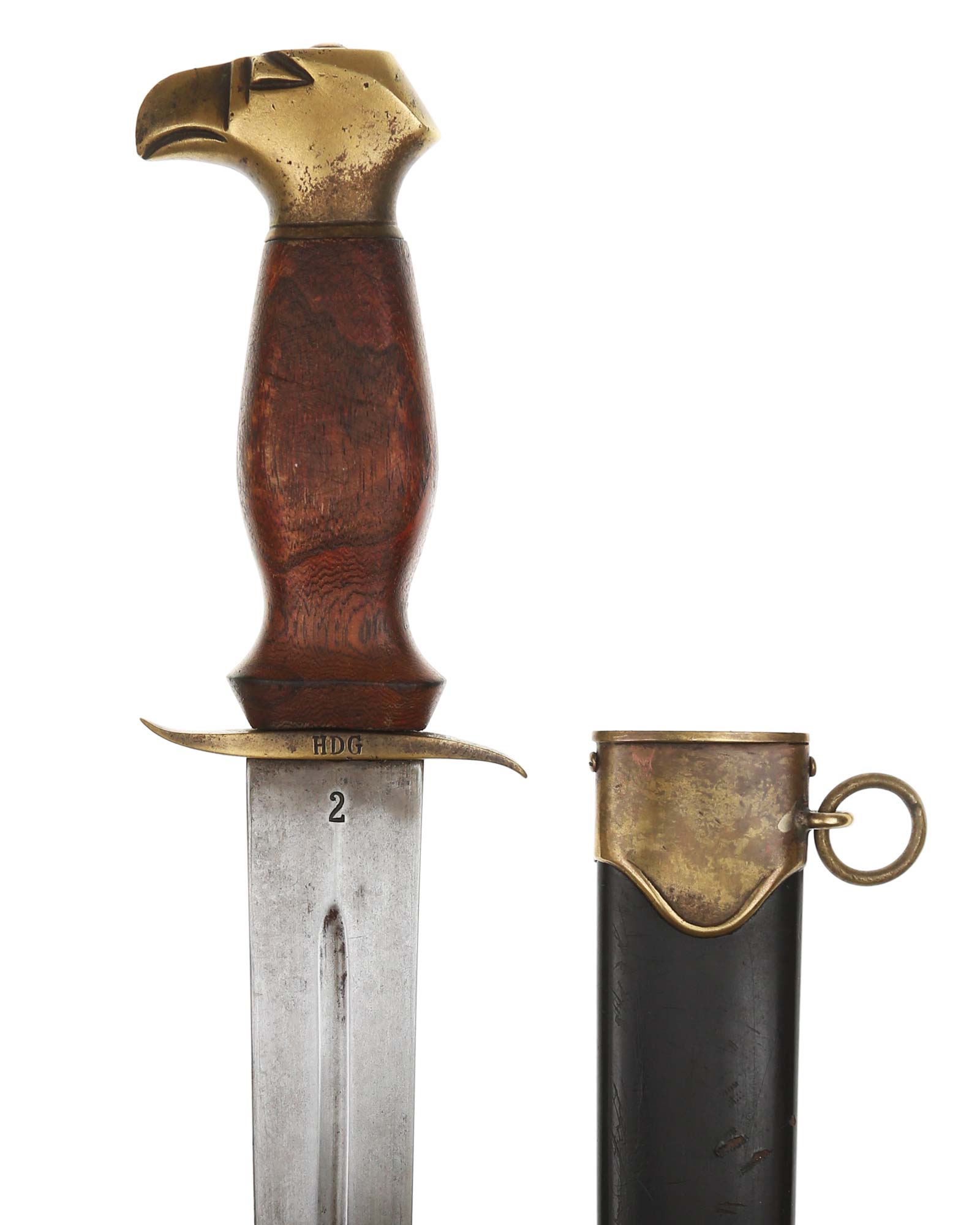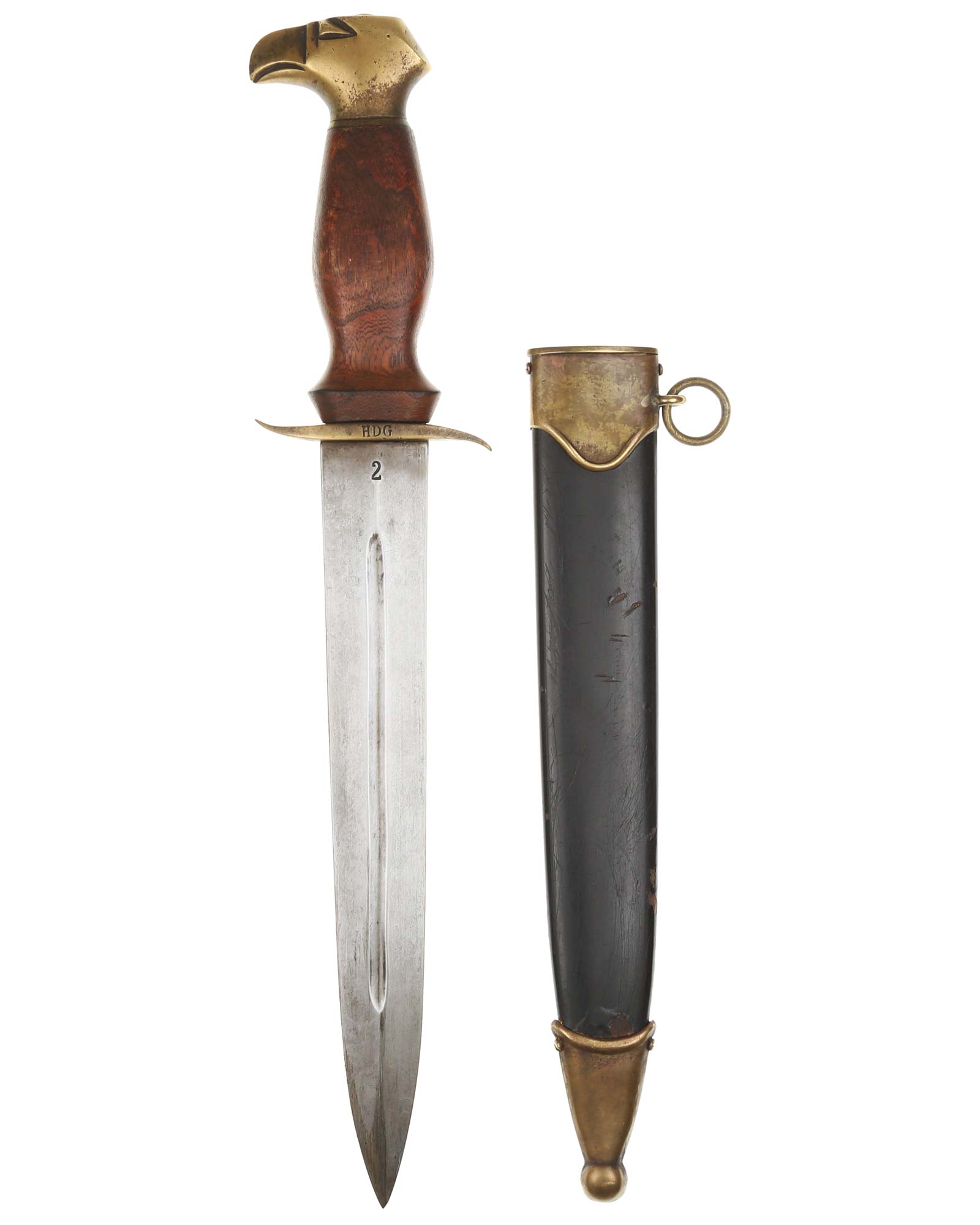 This Hlinka Guard [HG] Dagger is in EXC+ condition. Model 1939. The total length is 37.3 cm. Lower guard with "HG" stamp. The Dagger is stamped with 2 on the blade.