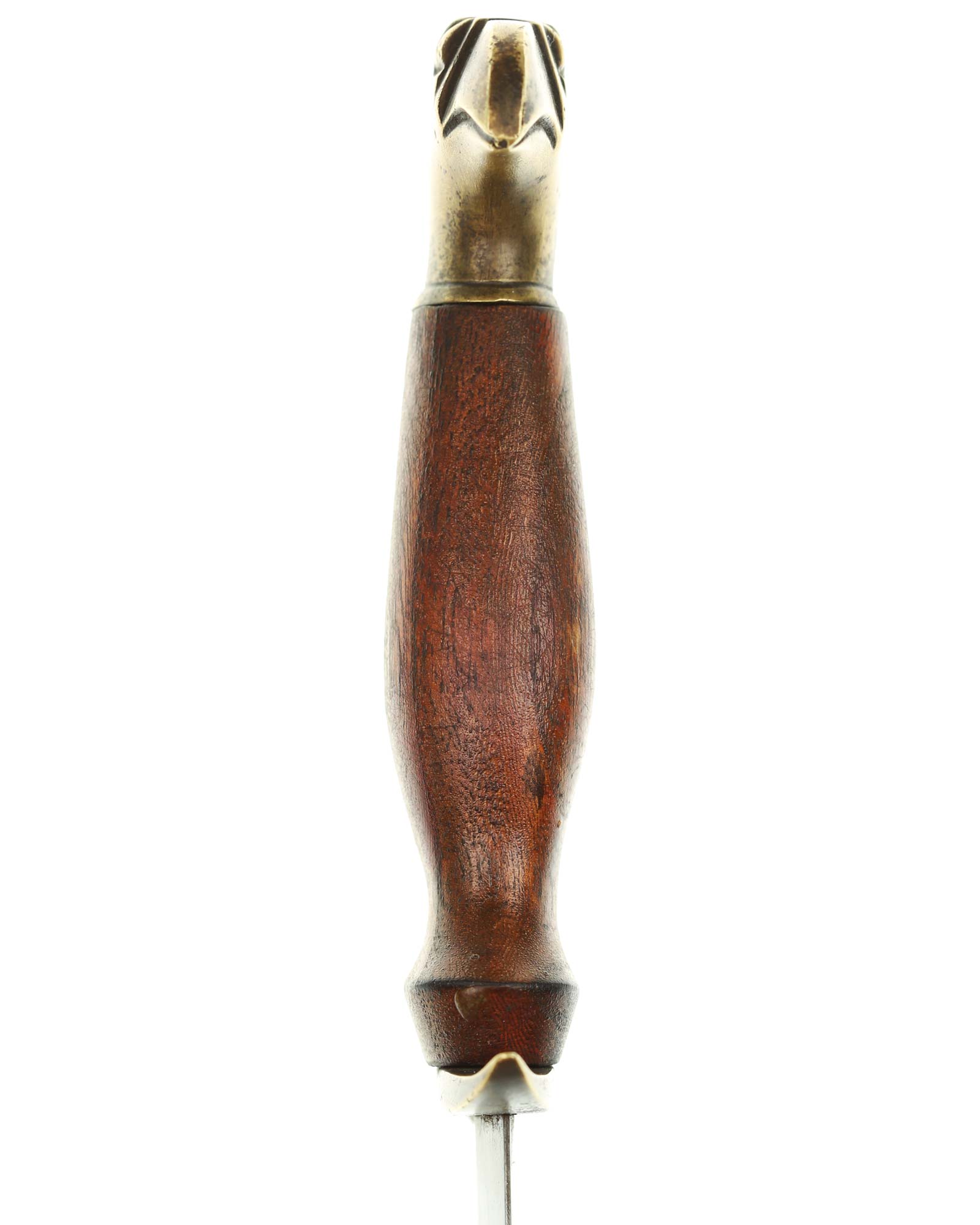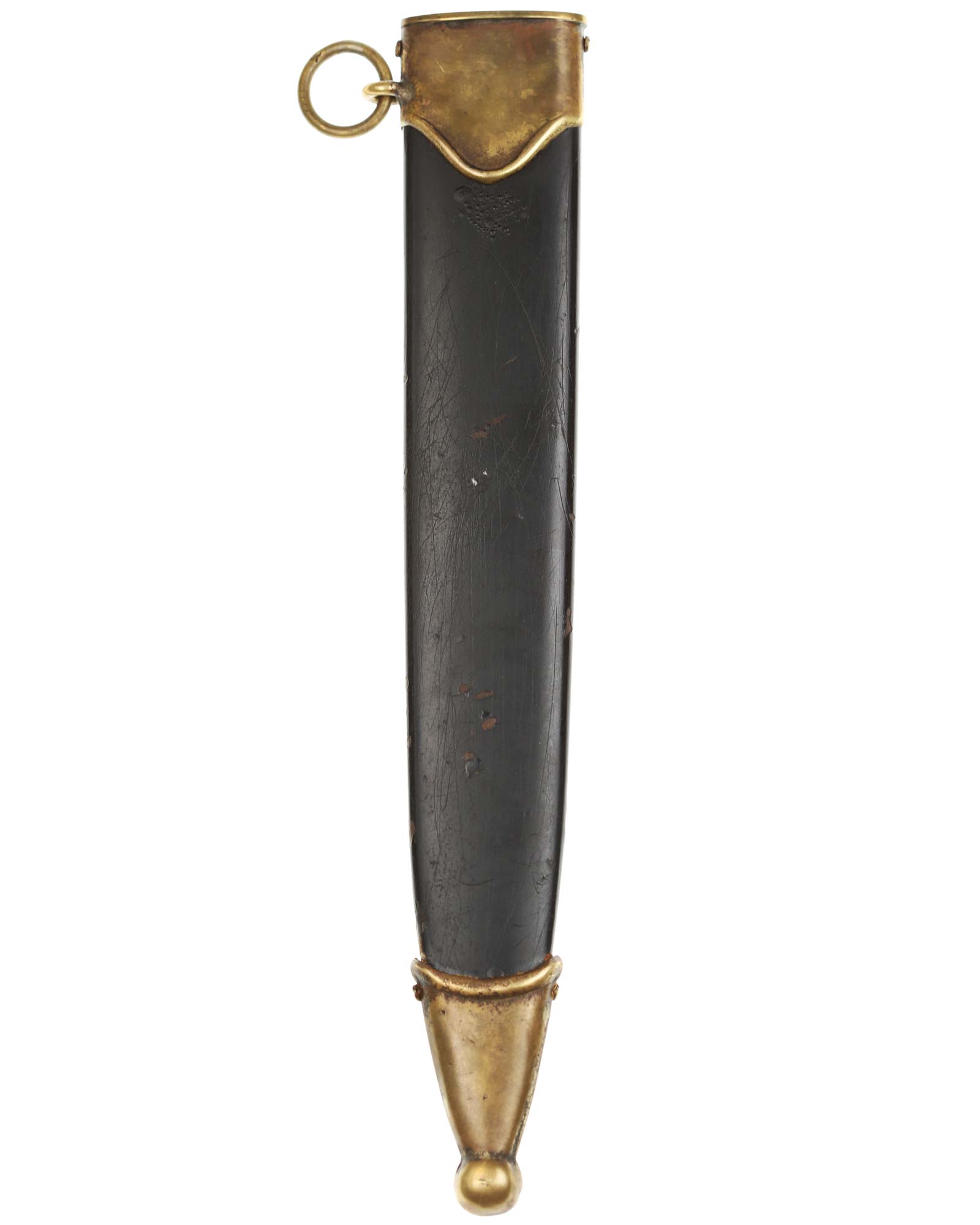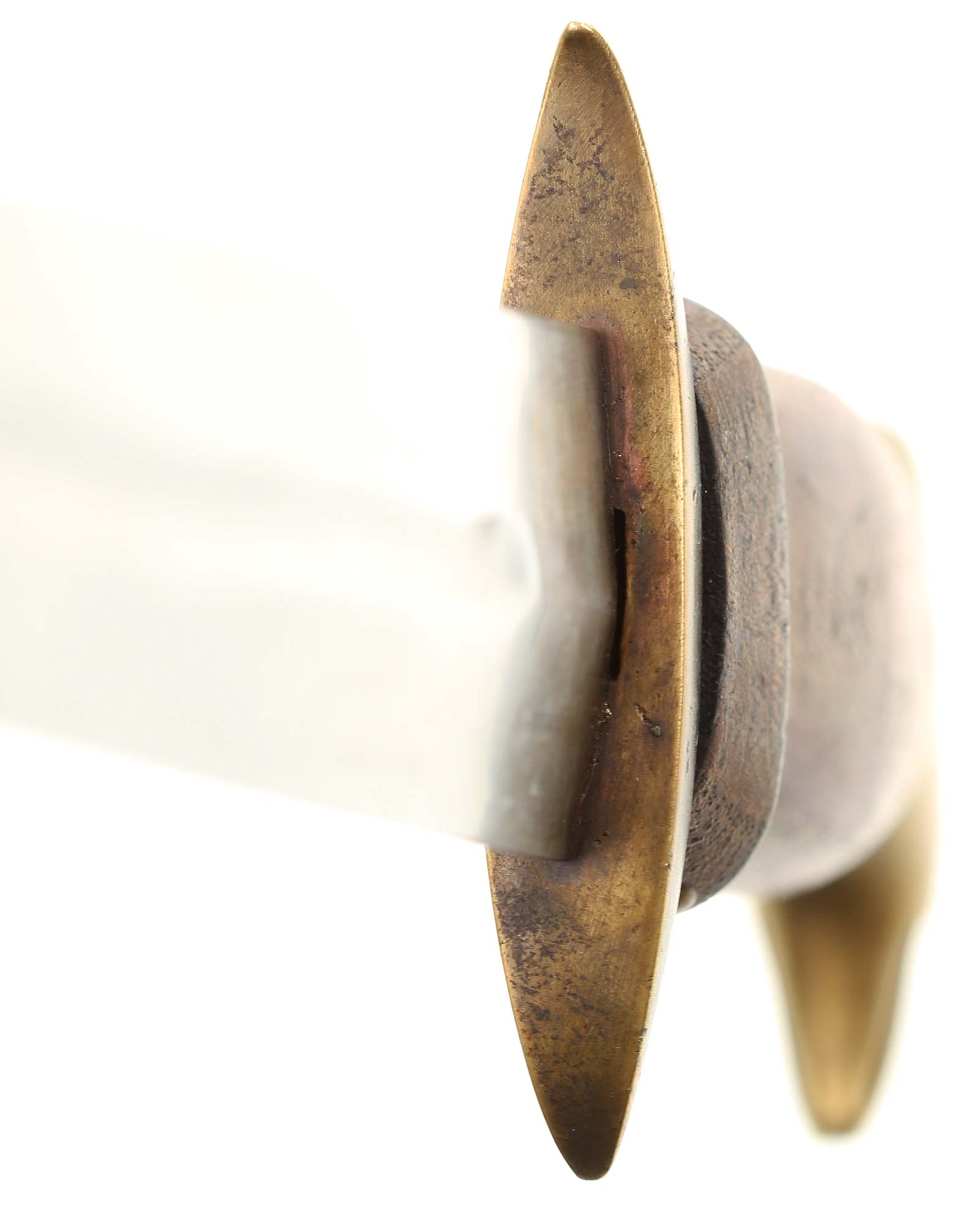 Grip: Hilt fittings in fine condition, lower crossguard marked, “HG”. Medium brown, wooden grip shows light surface wear with no hairline cracks, chips or damage.