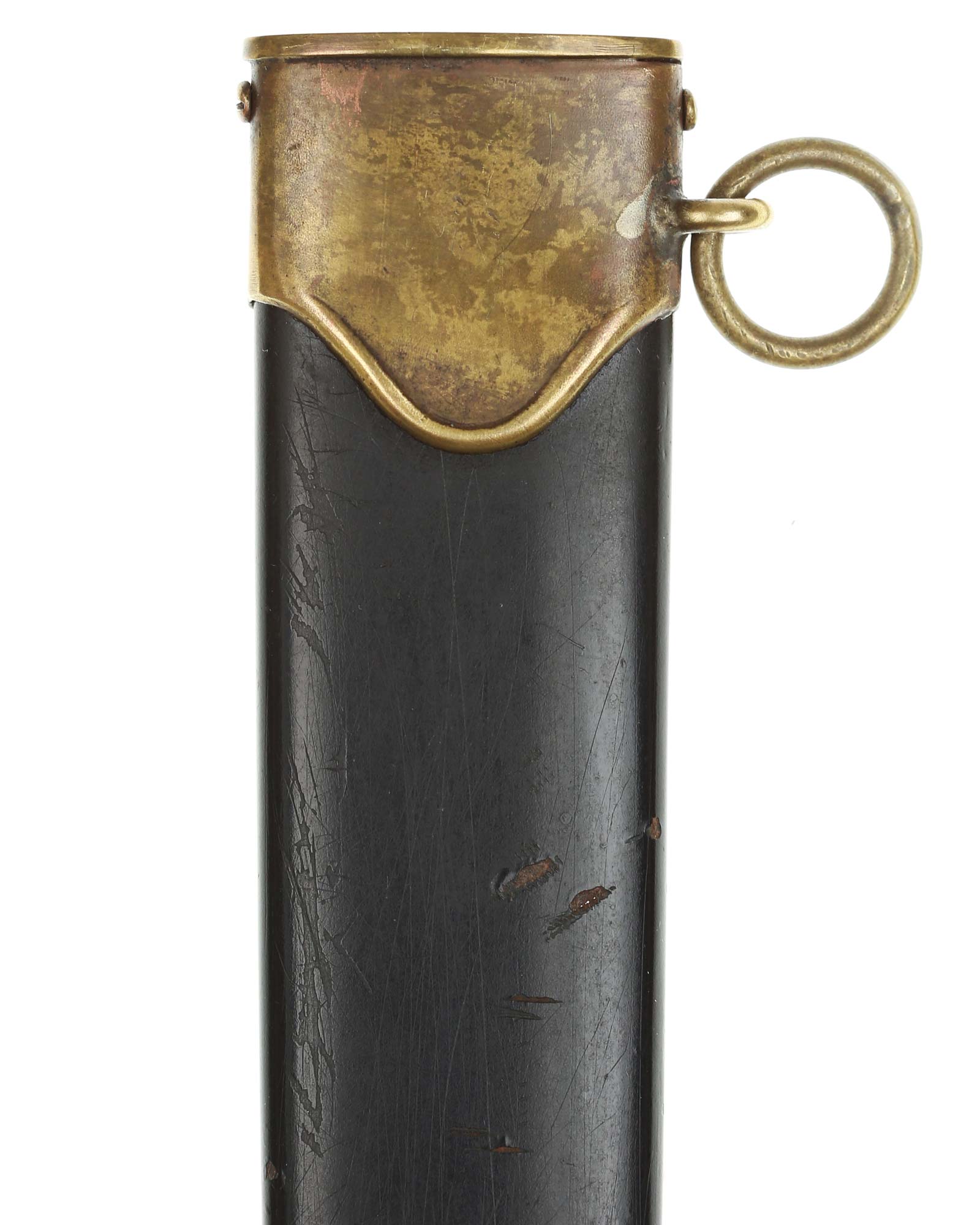Scabbard: The scabbard shell is straight throughout. The black painted body has a gloss finish, magnetic, exhibiting moderate contact marks and surface wear in the paint from active use. They exactly match the patination of the crossguards, and are retained by screws.