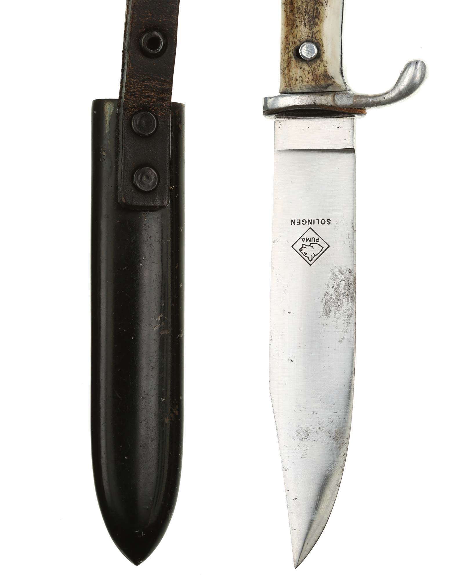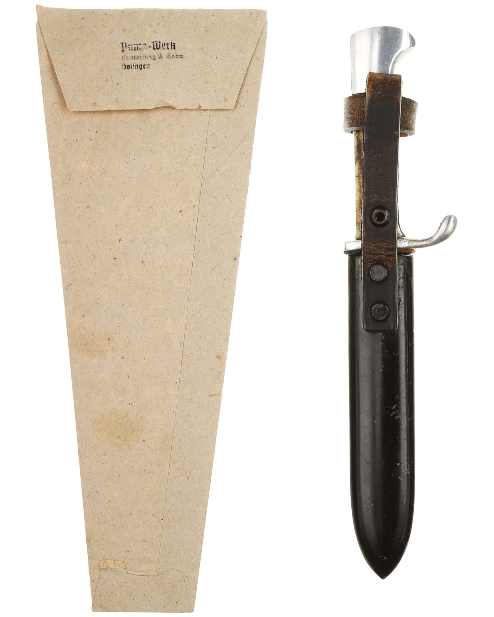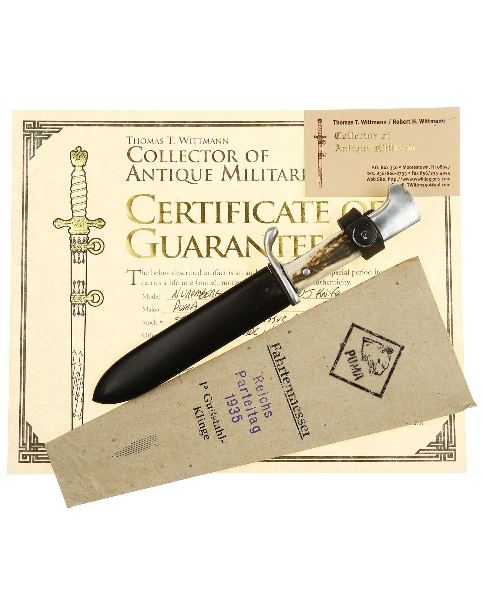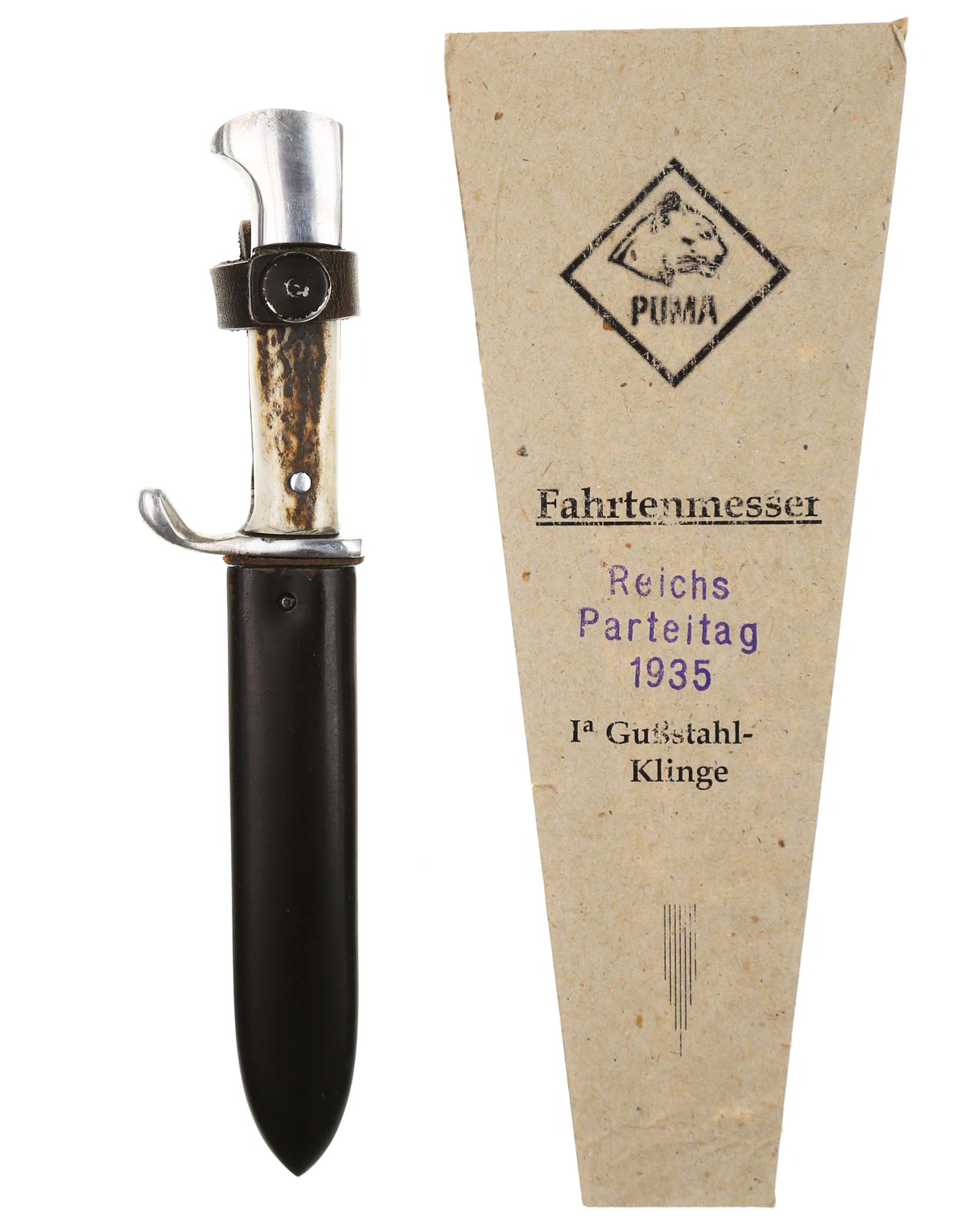 This Fahrtenmesser «Reichsparteitag Nürnberg 1935» with Original Paper Sack by Puma Solingen. Model 1935. The total length is 21,1 cm.