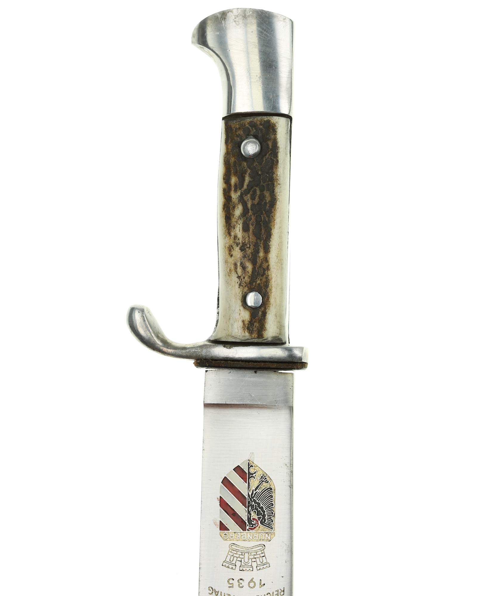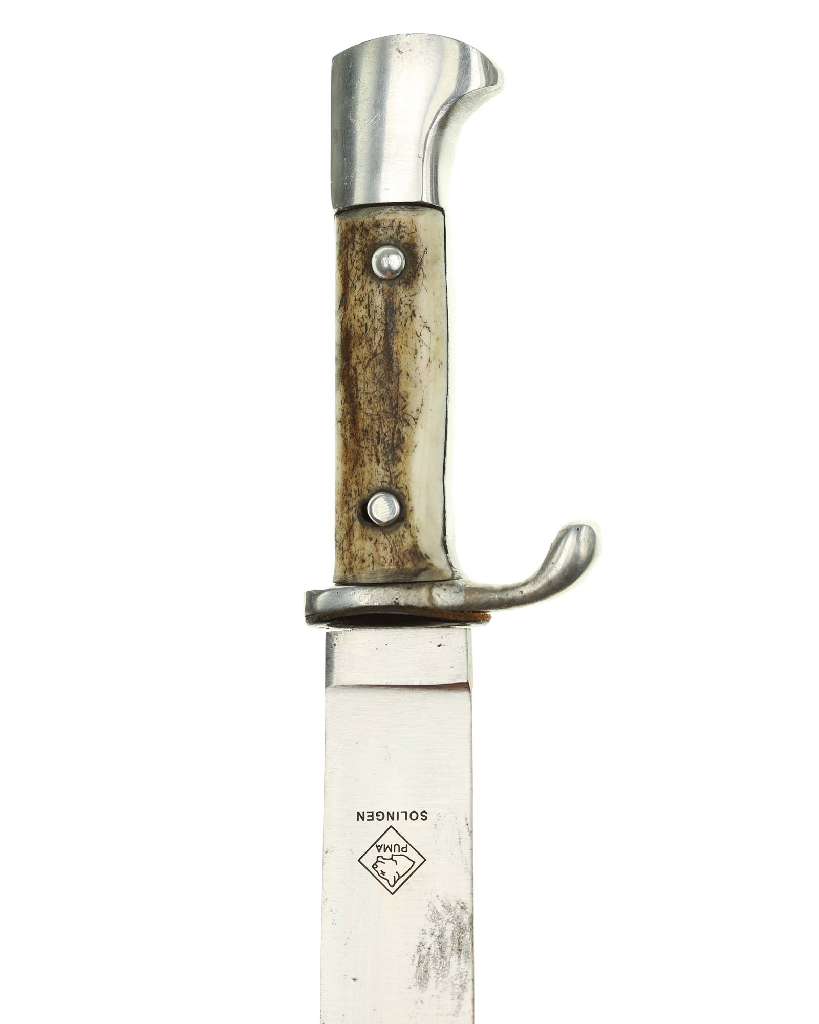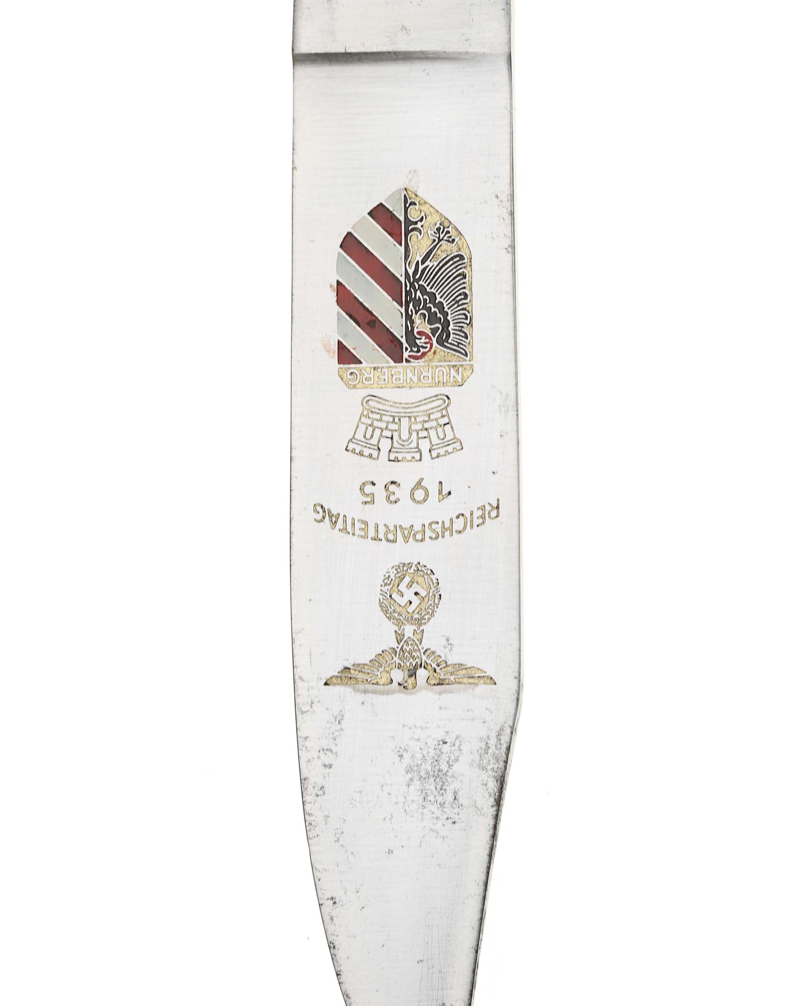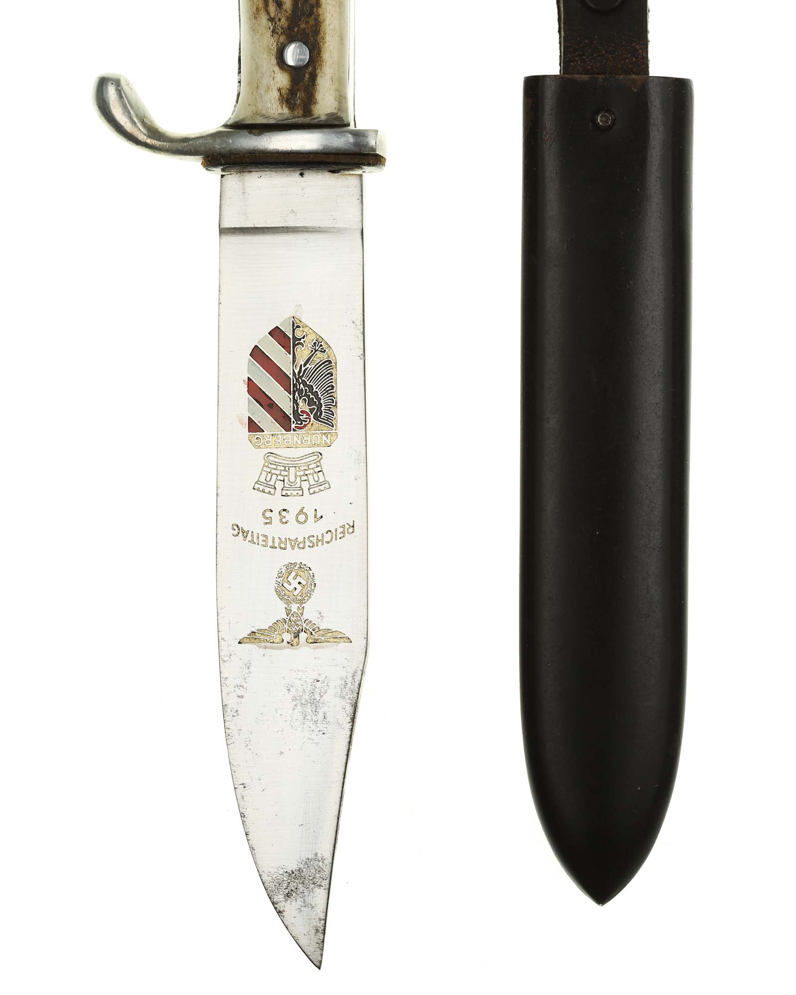 Blade: The blade is a typical DJ type, having short ricasso and single edge with false edge at the end. The blade is virtually in near mint condition. The blade constructed of brushed steel (magnetic), with a sharpened blade that is marked “Reichsparteitag Nürnberg 1935” with a national eagle and the coat of arms of Nürnberg; the reverse of the blade is marked Puma Solingen.