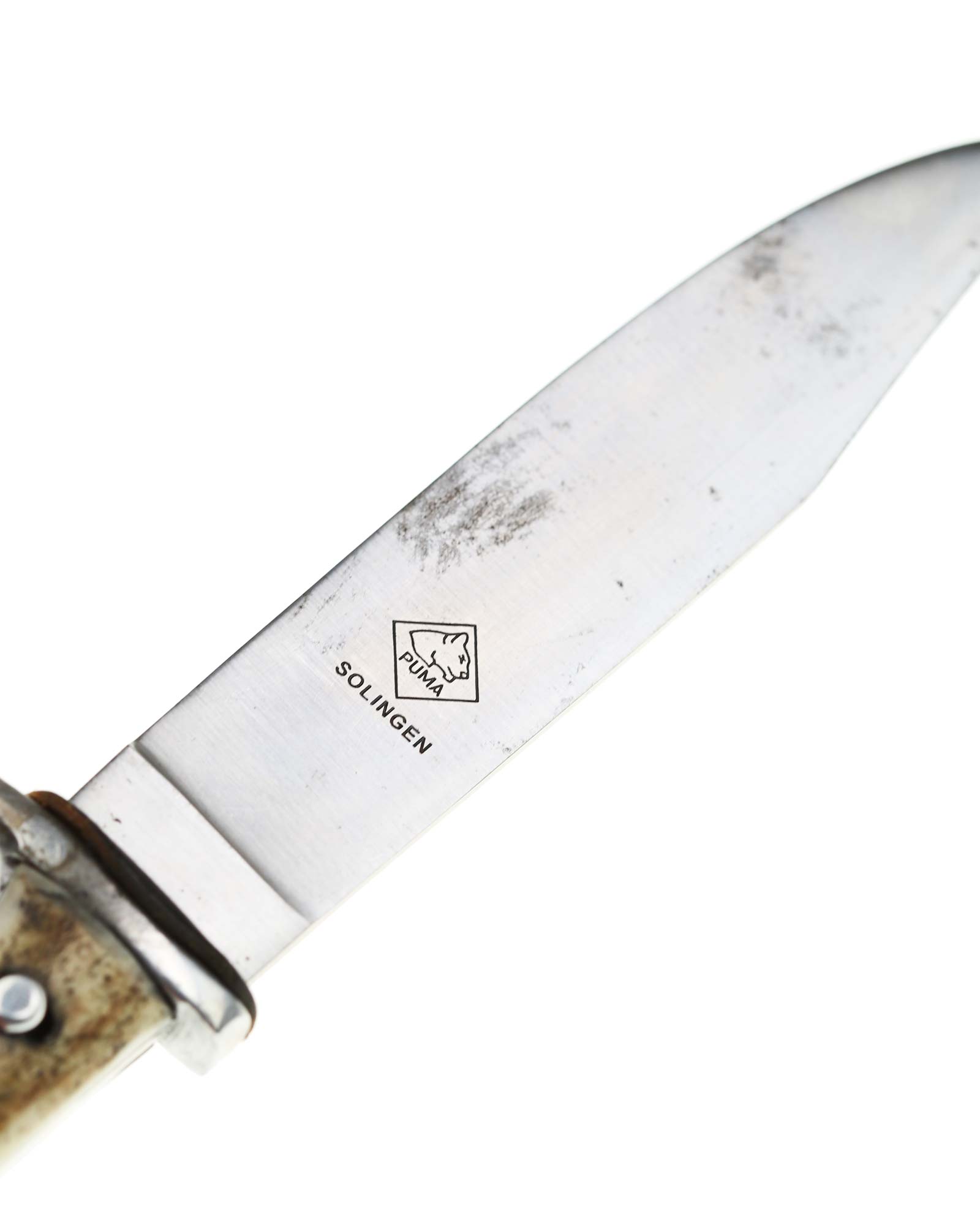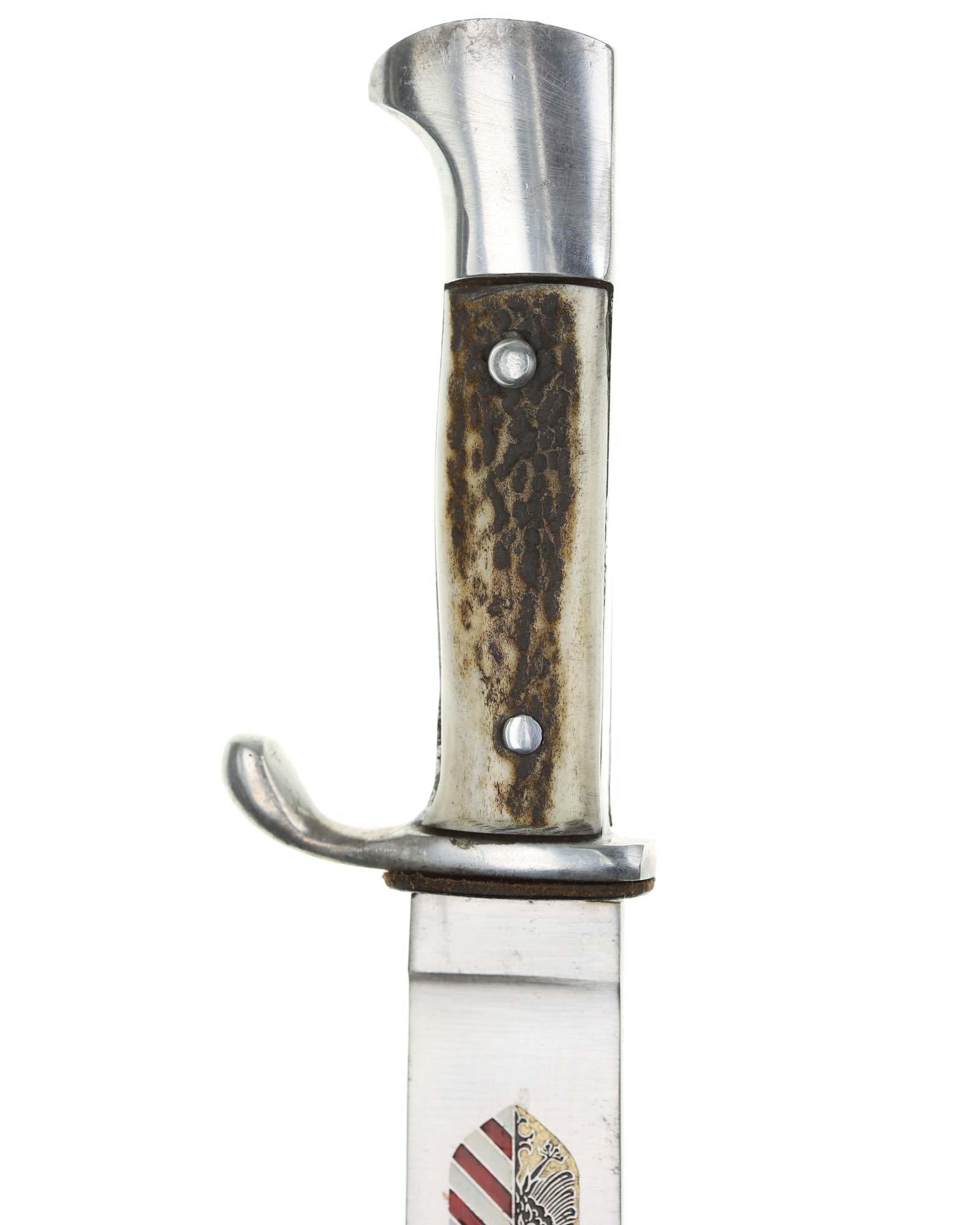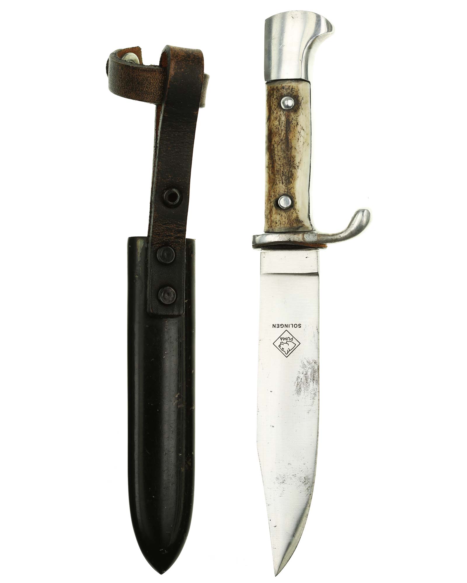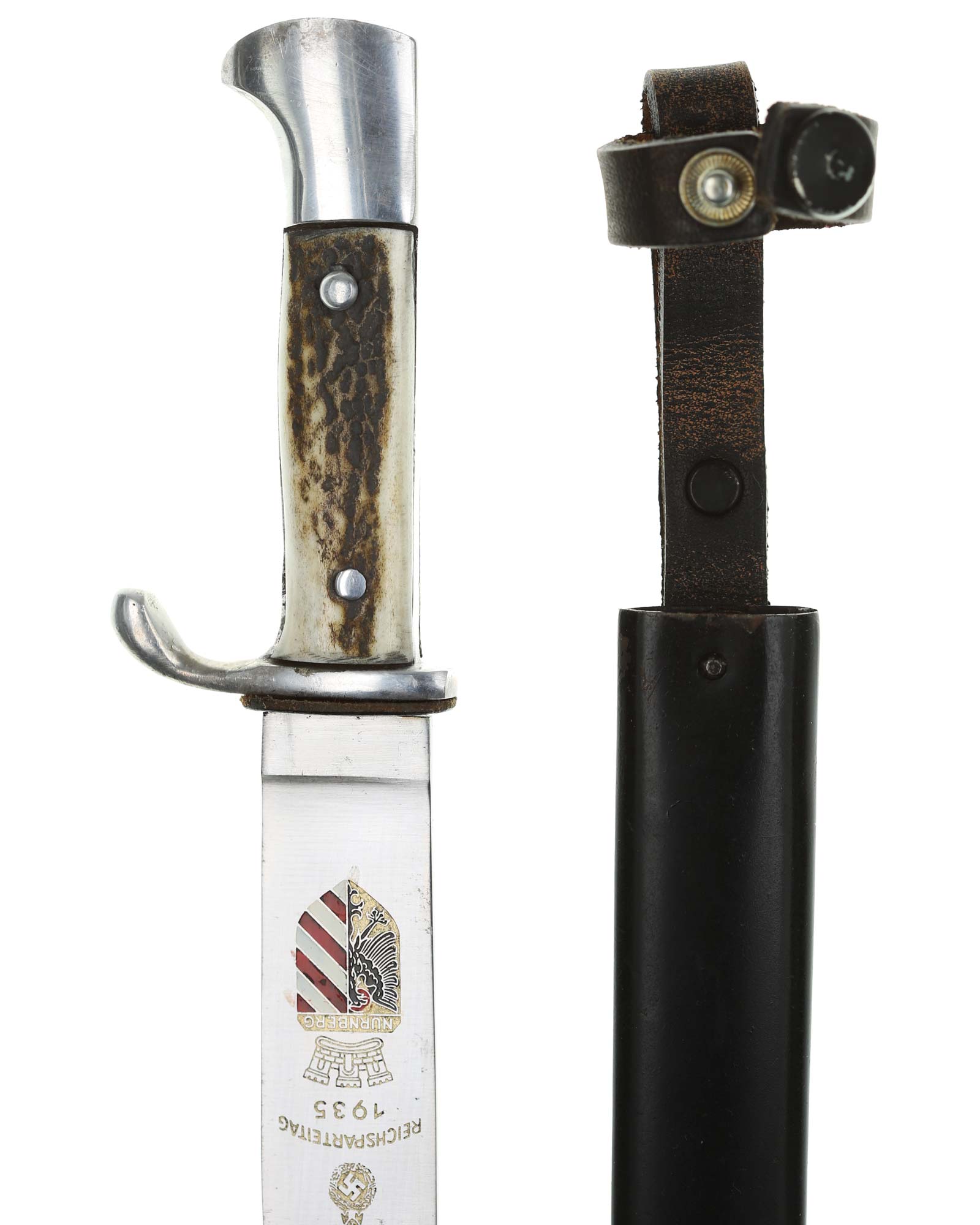 Blade: The blade is a typical DJ type, having short ricasso and single edge with false edge at the end. The blade is virtually in near mint condition. The blade constructed of brushed steel (magnetic), with a sharpened blade that is marked “Reichsparteitag Nürnberg 1935” with a national eagle and the coat of arms of Nürnberg; the reverse of the blade is marked Puma Solingen.
