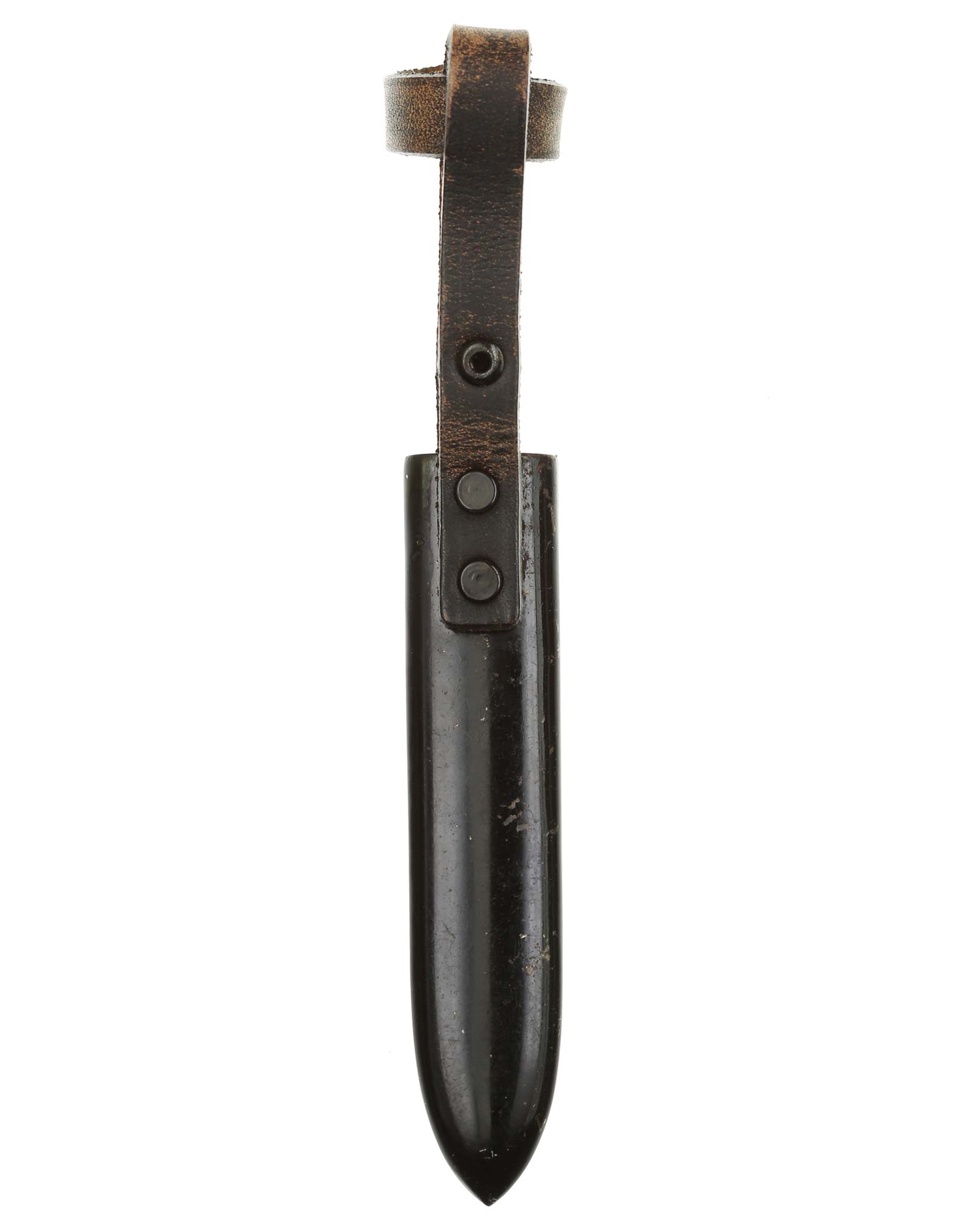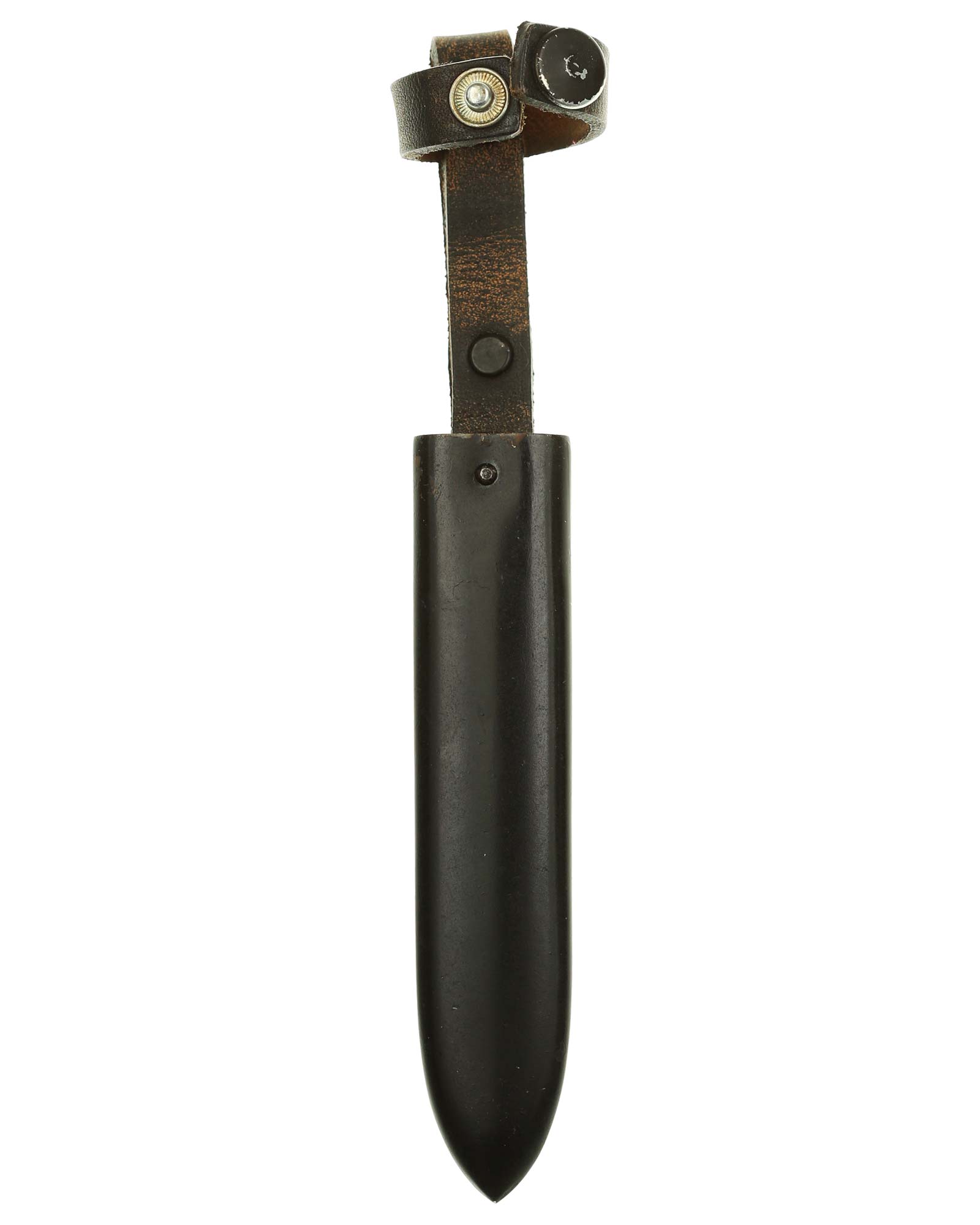 Scabbard: The scabbard remains straight throughout. The original paint has dulled some from age, but it still remains in mint condition. The scabbard is equipped with a black leather belt loop and grip retainer loop with working snap. The strap is retained by two rivets through the top of the reverse scabbard.