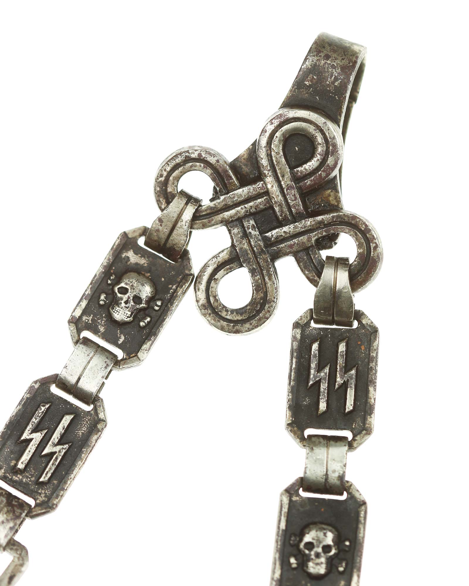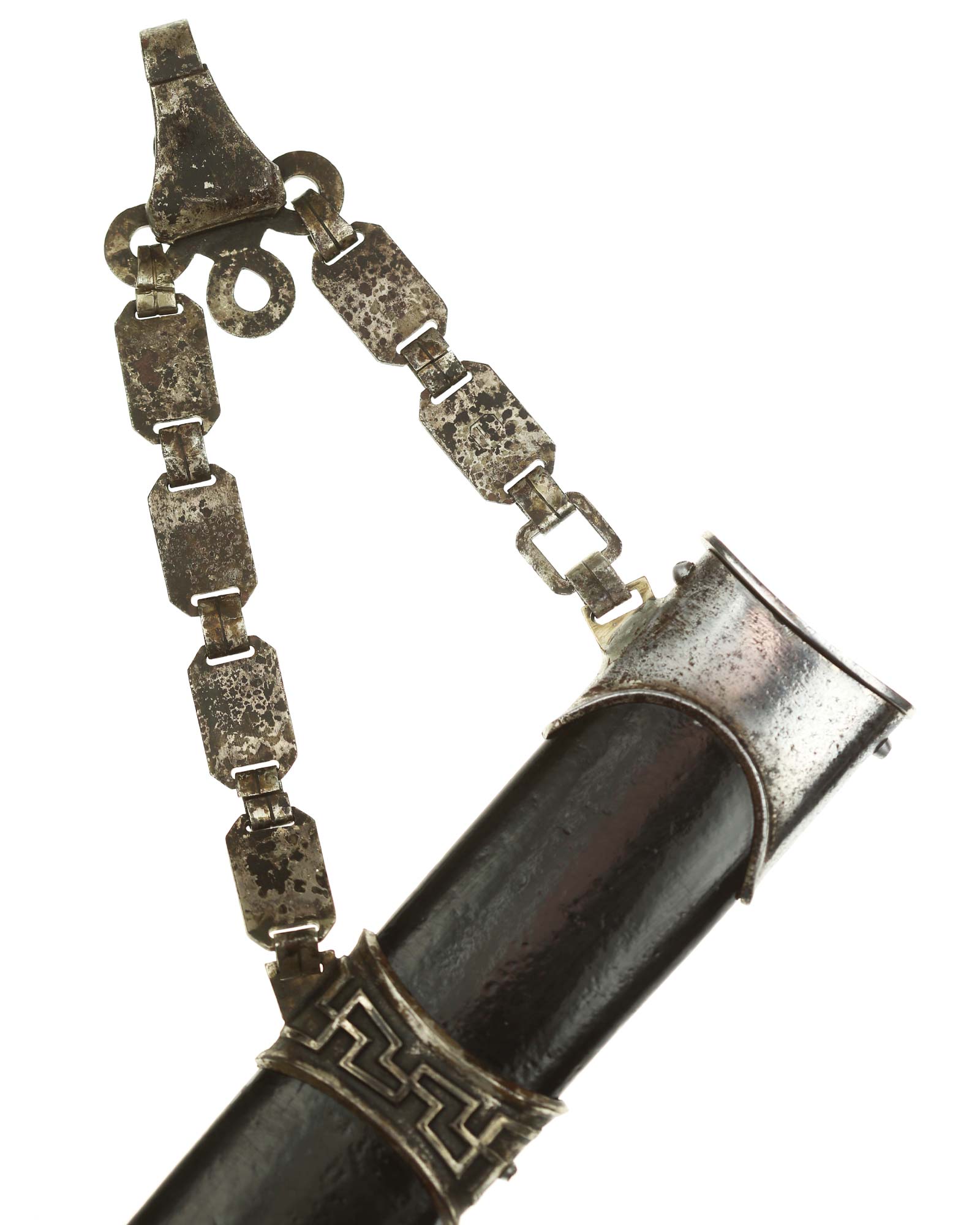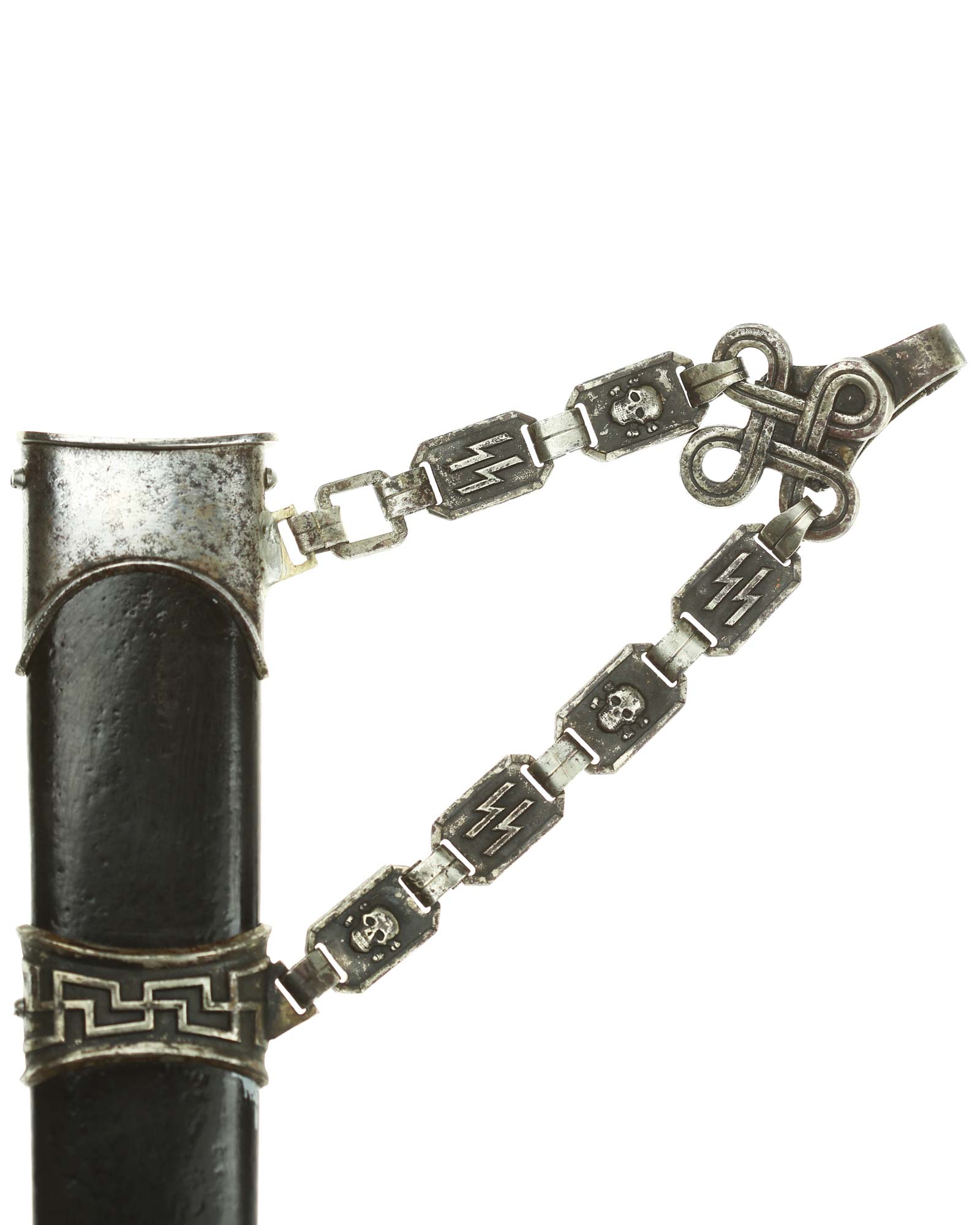 Scabbard: The scabbard shell is straight throughout and repainted. All five screws remain intact. The chain is the early Type II - T. Wittmann or B1 - R. Siegert nickel based version featuring all of the correct attributes. The chain links show wonderful detail to the skulls and SS runes. The correct first upper link is clearly “SS” proof marked.