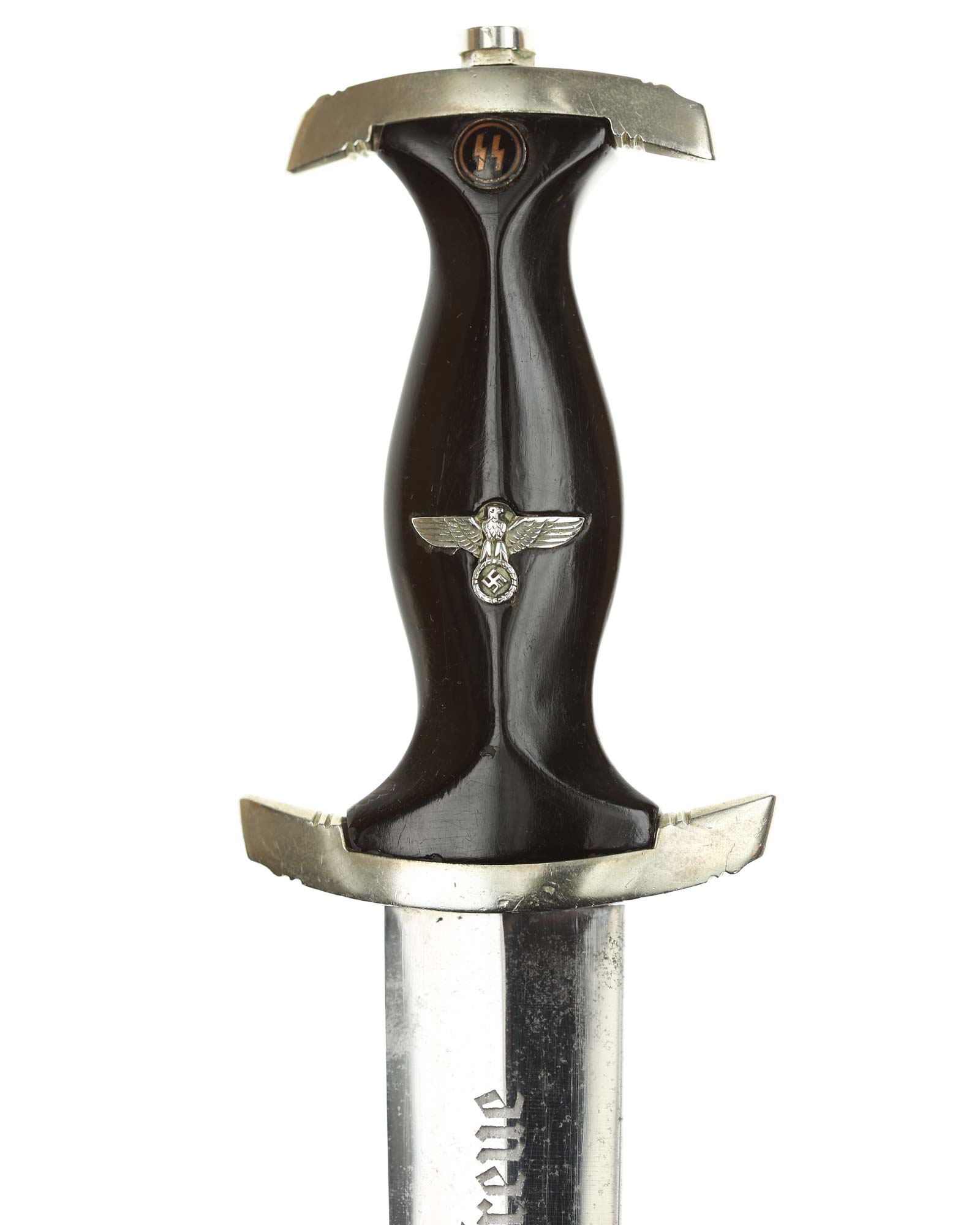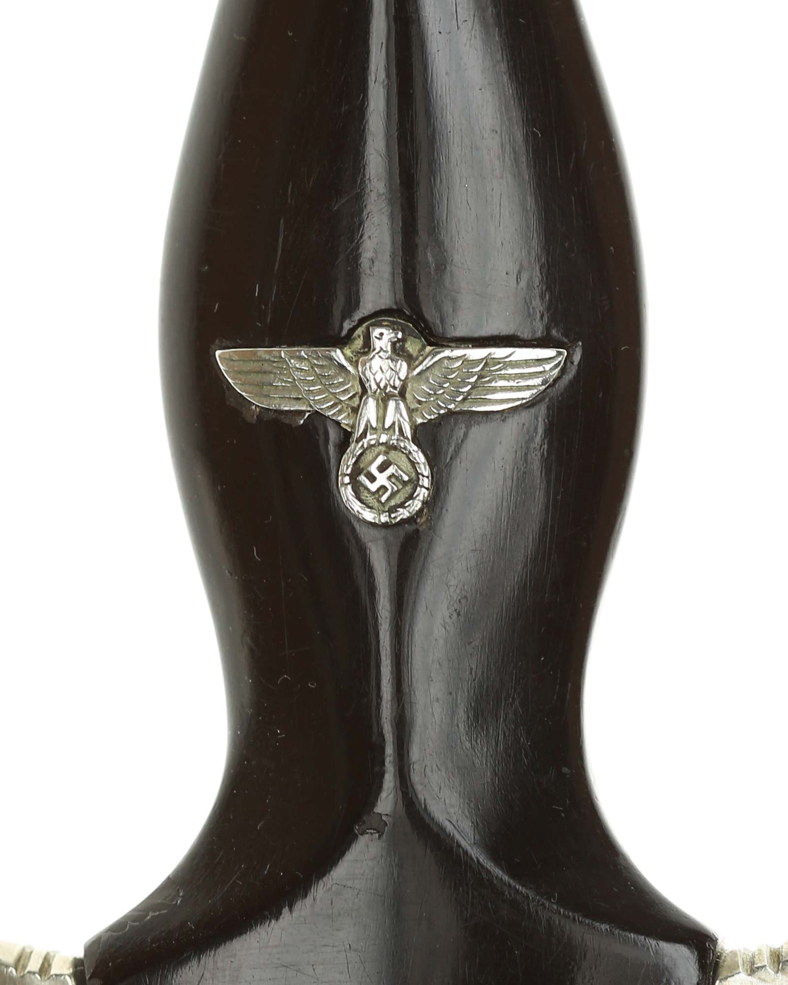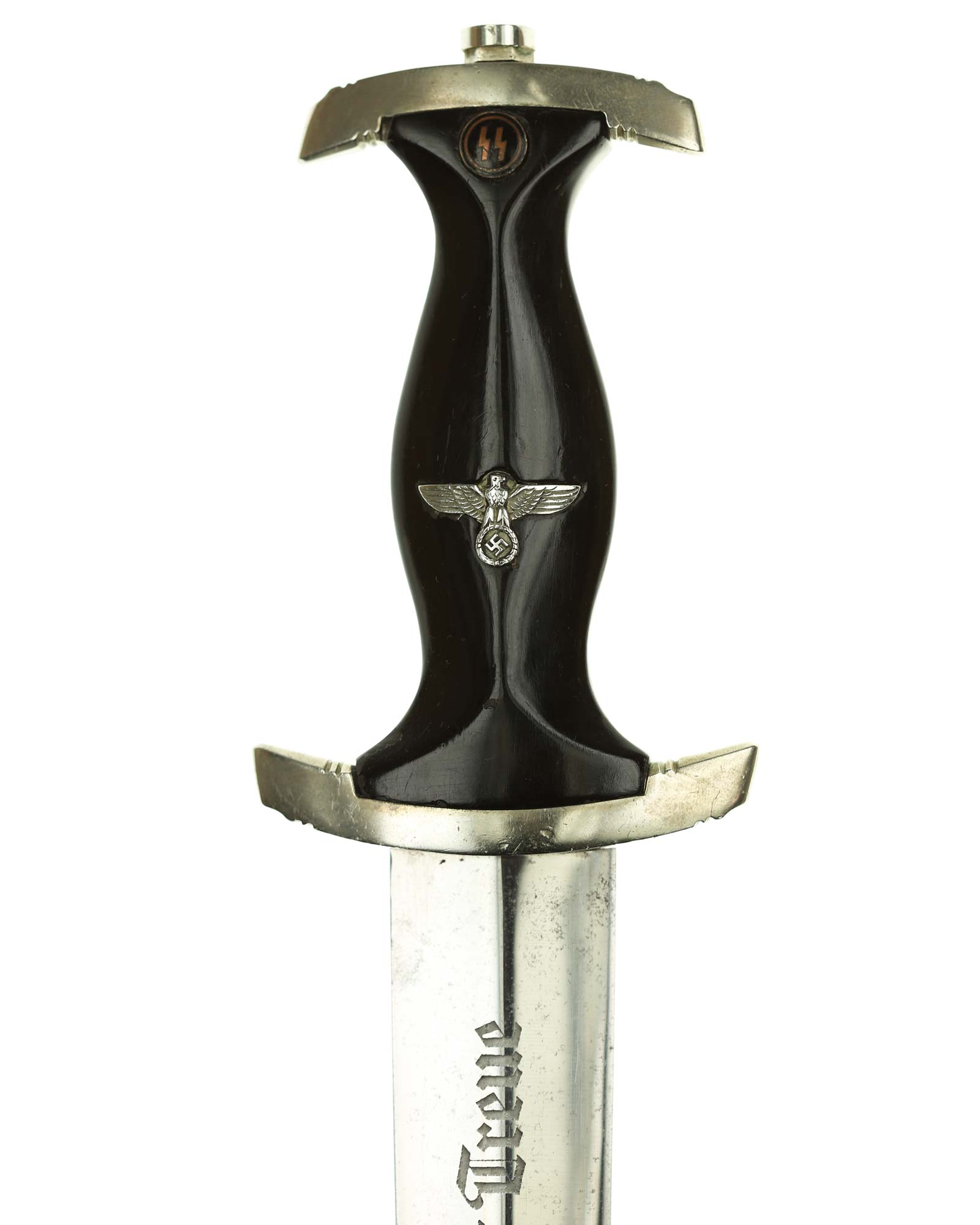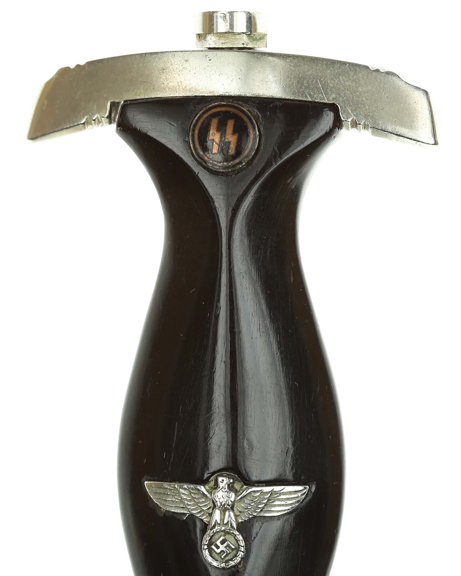 Grip: This grip fits the crossguards. The dagger having solid nickel cross guards. The reverse lower cross guard is district marked with the Roman numeral, "III" for Berlin. The guards are nice and smooth throughout. The ebony grip is in good condition. The SS runes are nice and silvery, with matching double circles around them. The wood of the SS Dagger’s grip has retained all of its deep black color.