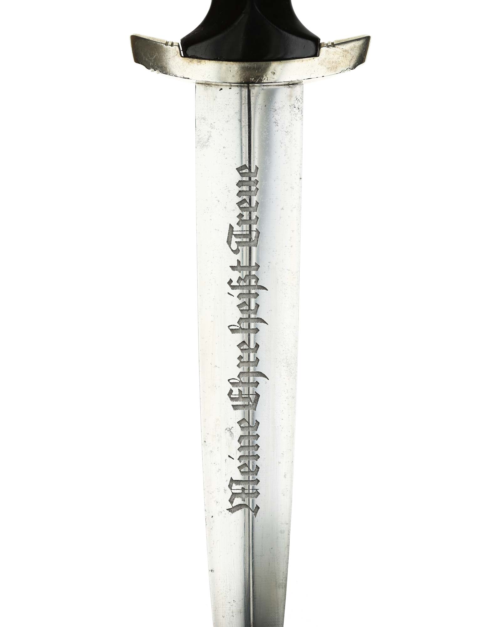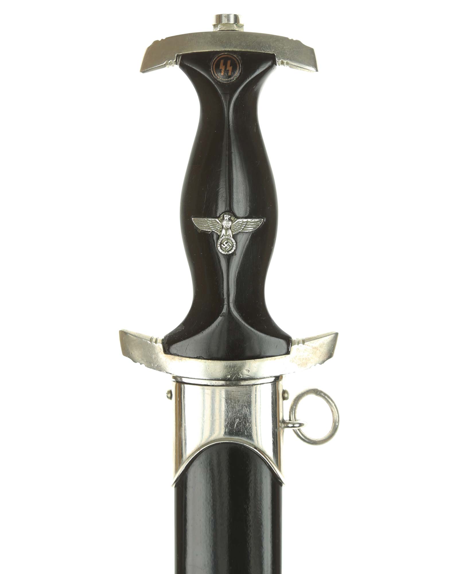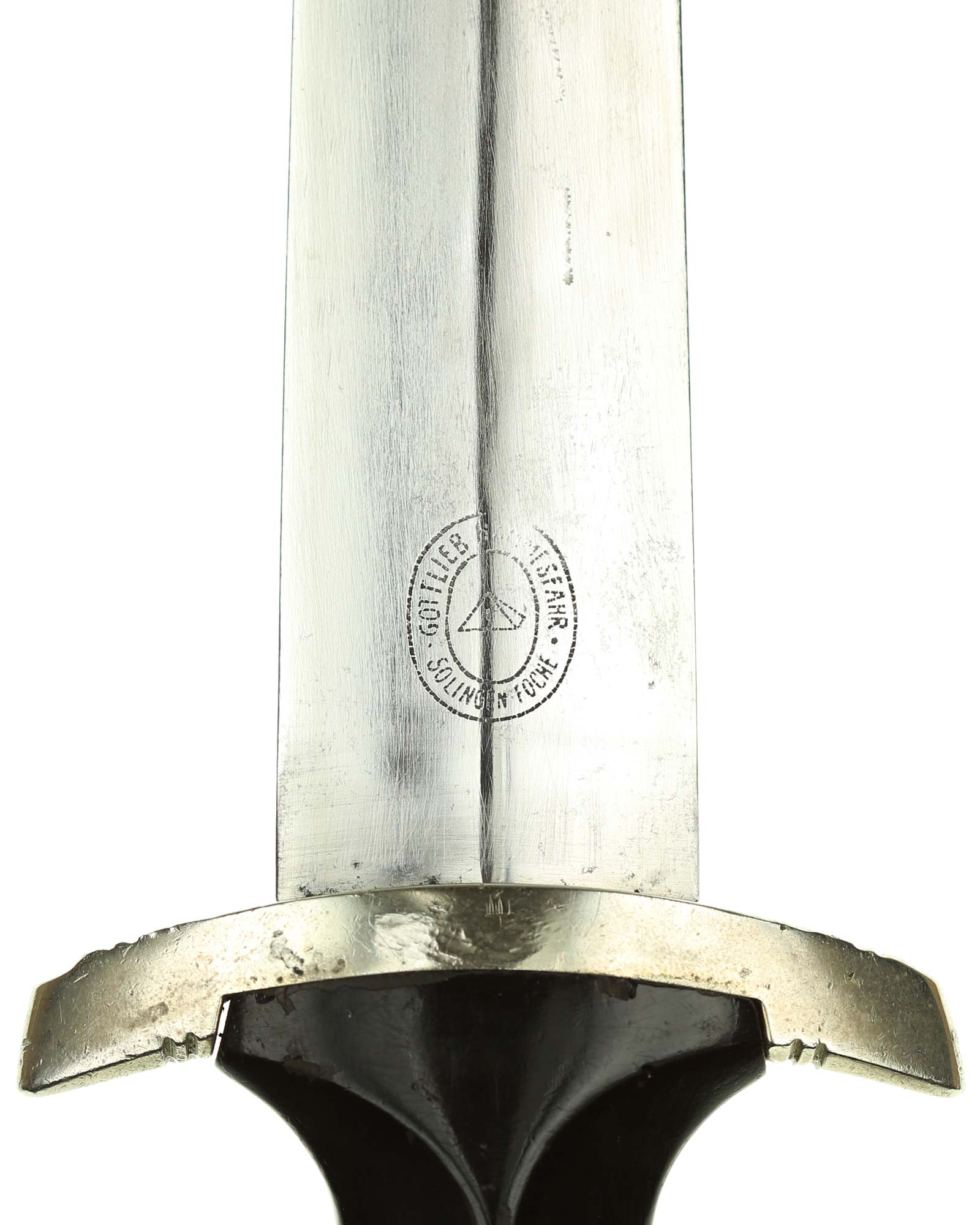Grip: This grip fits the crossguards. The dagger having solid nickel cross guards. The reverse lower cross guard is district marked with the Roman numeral, "III" for Berlin. The guards are nice and smooth throughout. The ebony grip is in good condition. The SS runes are nice and silvery, with matching double circles around them. The wood of the SS Dagger’s grip has retained all of its deep black color.