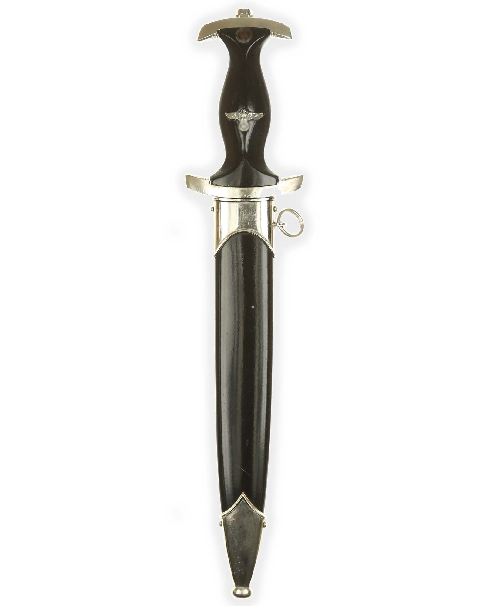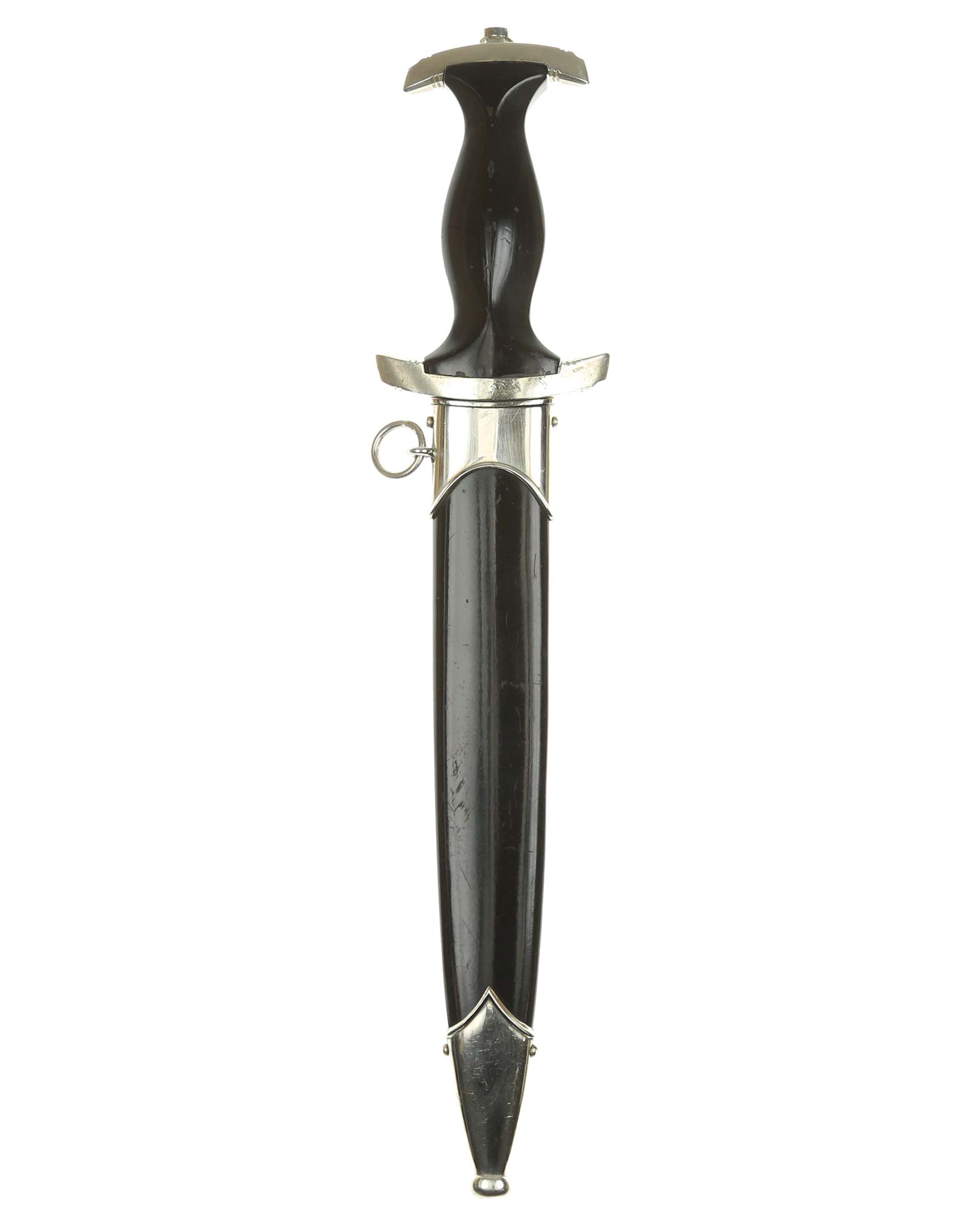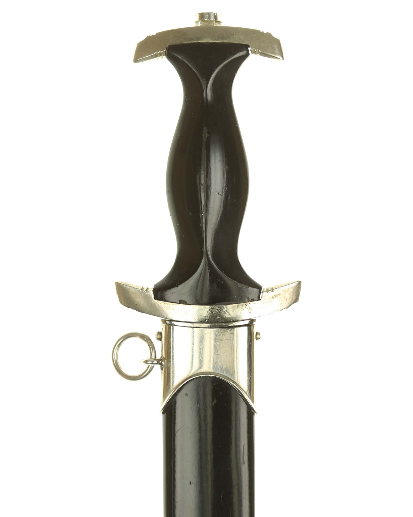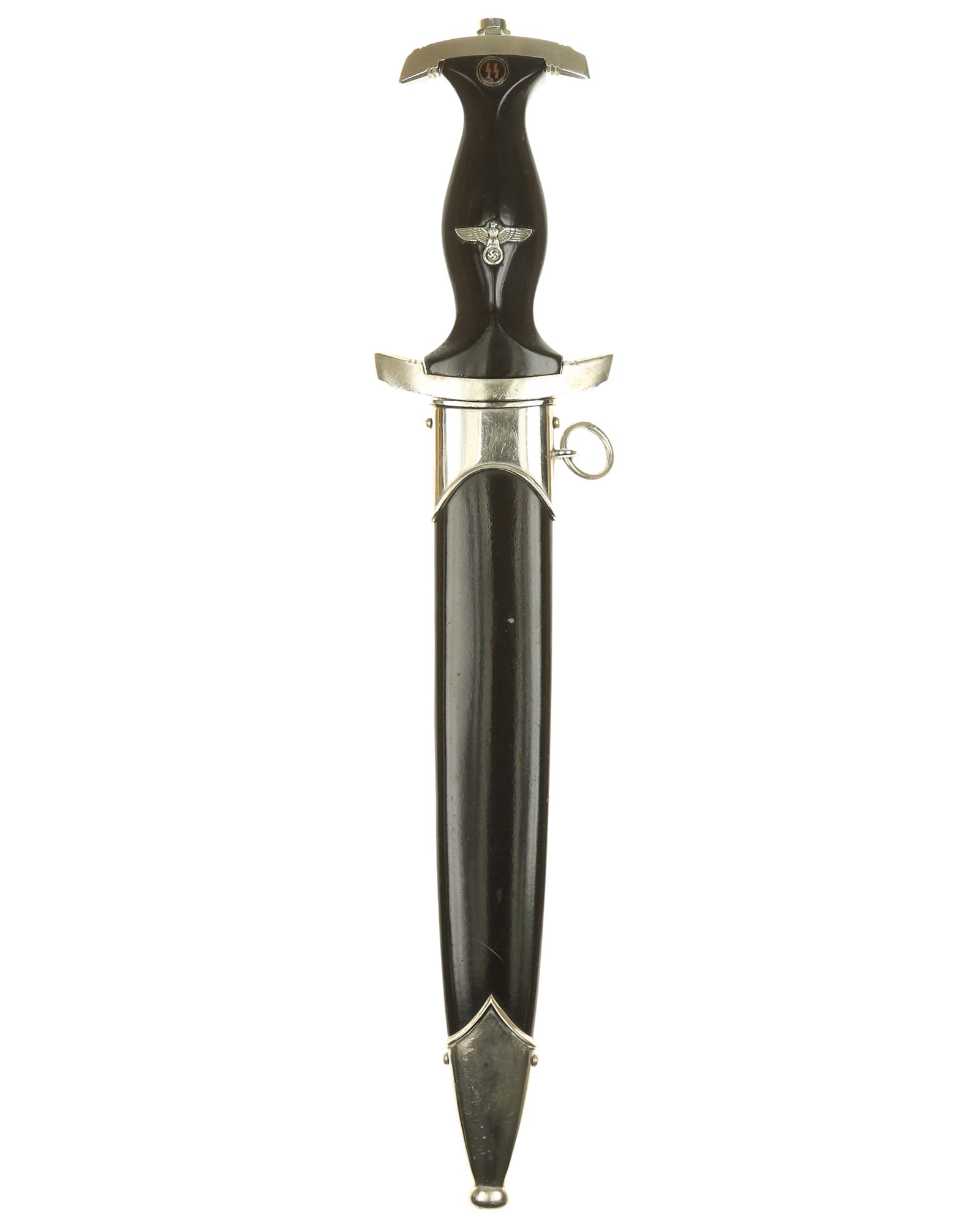 Grip: This grip fits the crossguards. The dagger having solid nickel cross guards. The reverse lower cross guard is district marked with the Roman numeral, "III" for Berlin. The guards are nice and smooth throughout. The ebony grip is in good condition. The SS runes are nice and silvery, with matching double circles around them. The wood of the SS Dagger’s grip has retained all of its deep black color.