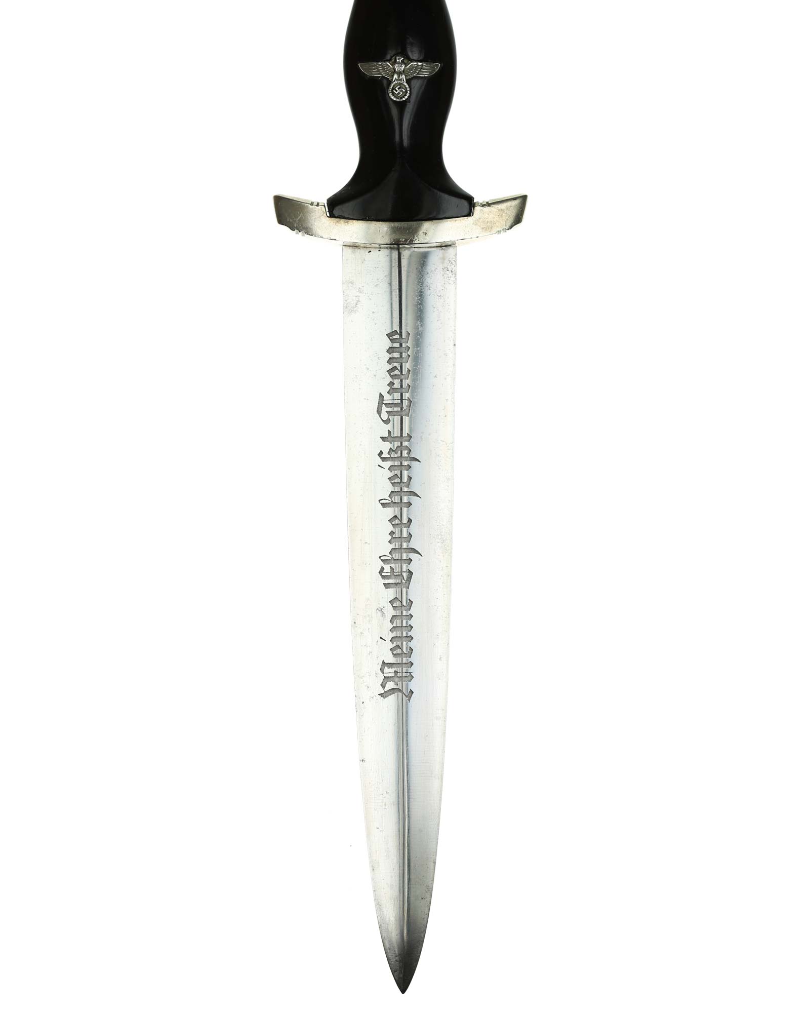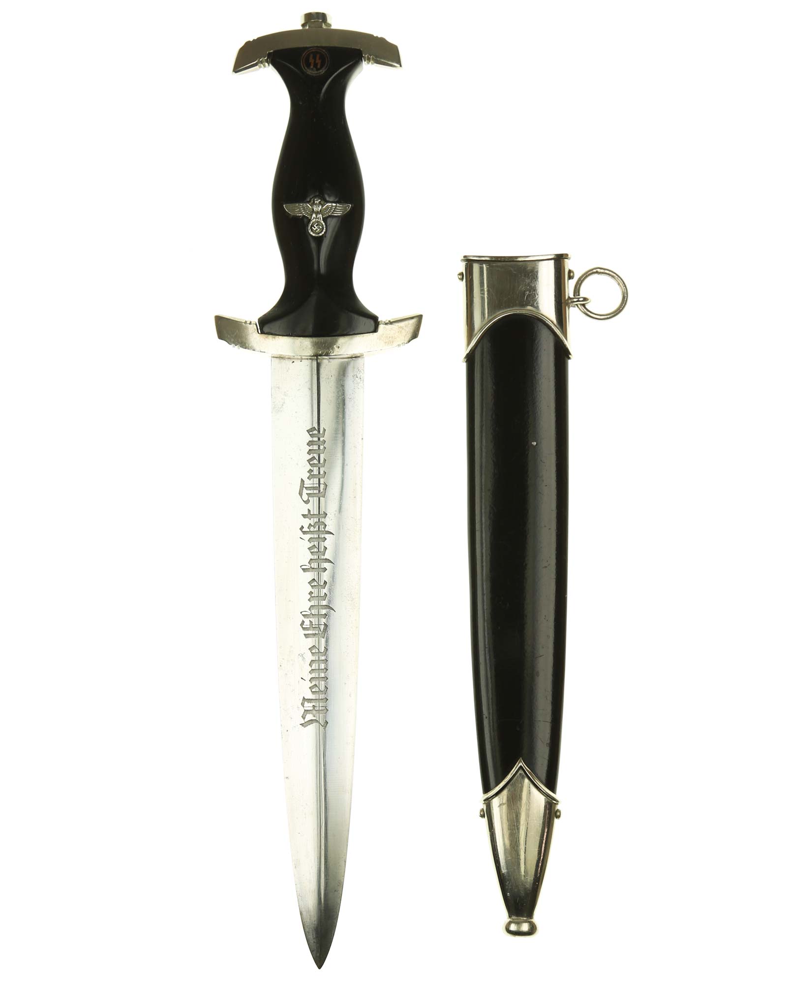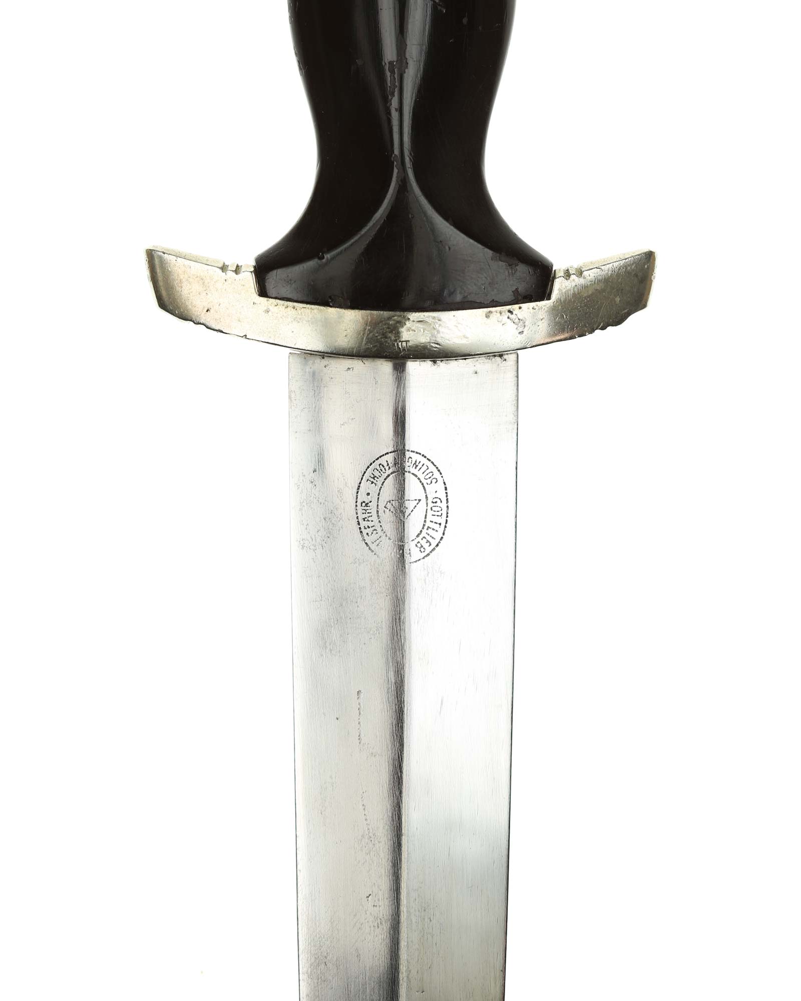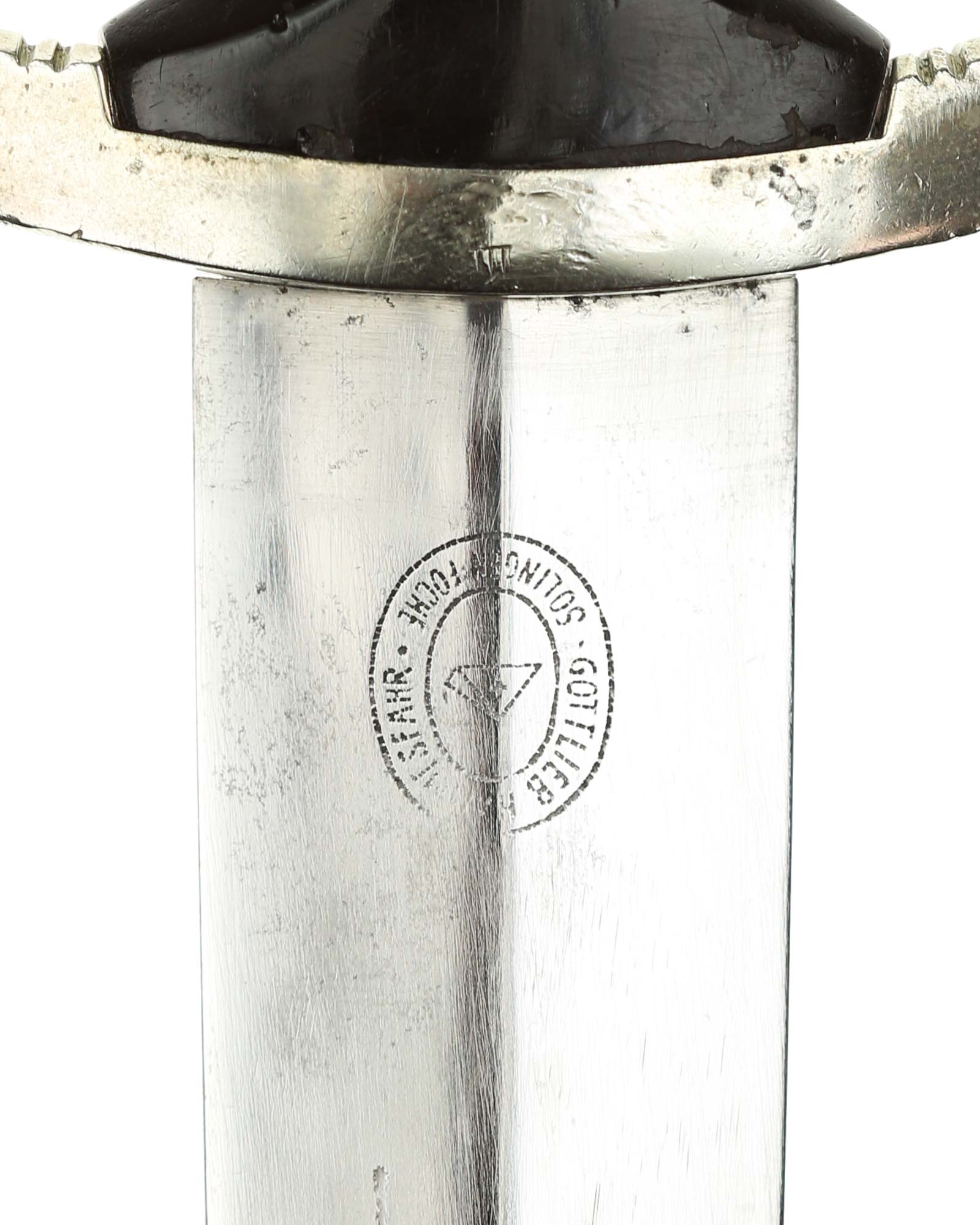 Blade: The blade of this example is still in EXC+ condition. The motto Meine Ehre heißt Treue «My honor is loyalty» is crisp and deep. The reverse ricasso is marked with the Gottlieb Hammesfahr Solingen logo. The blade shoulders perfectly meet the lower cross guard.