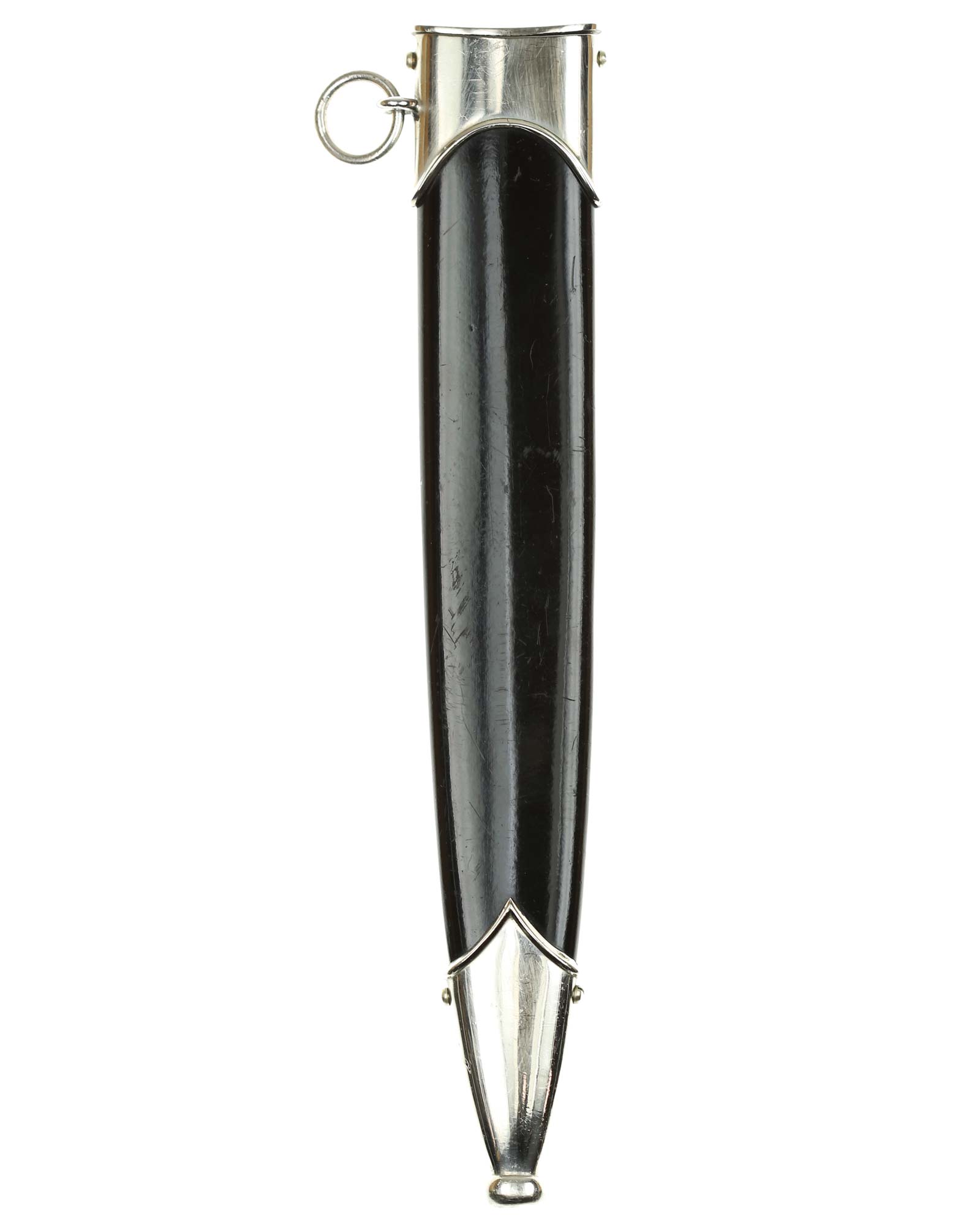 Scabbard: The scabbard shell is also an nice example; it is straight as an arrow, with “anodized” finish. The matching nickel mounts are in fine condition. The mounts are retained by four nickel screws.