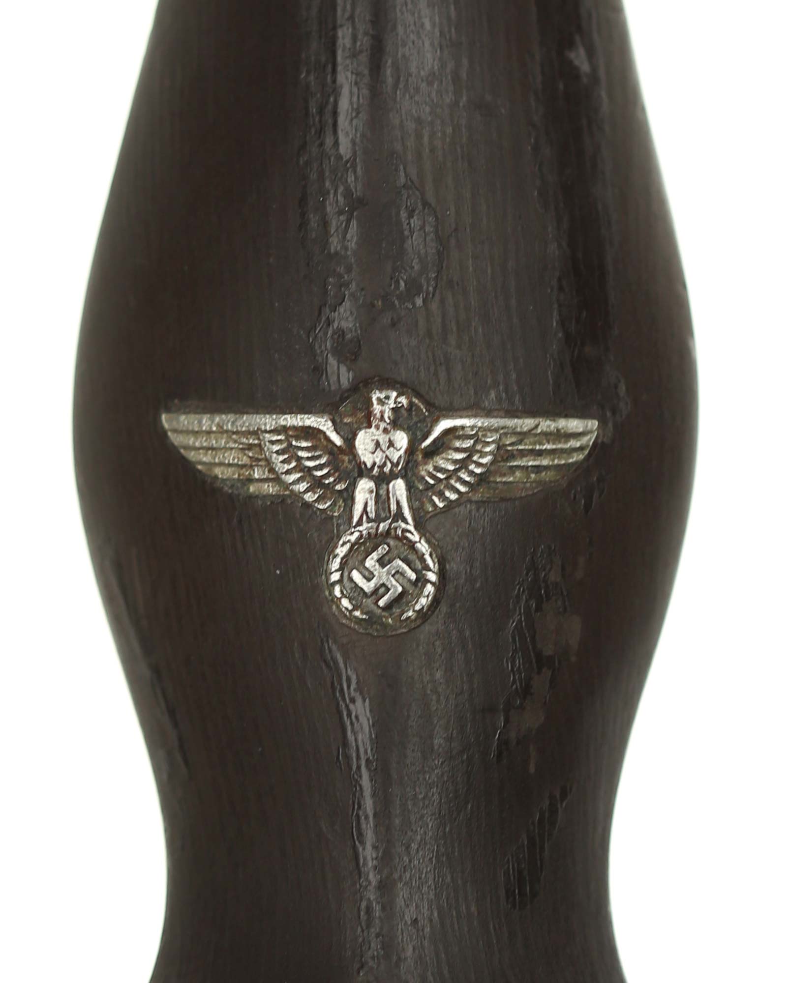 Grip: This grip shows no repairs, and fits the crossguards. There are some indications of wear on this grip. The runes displays good enamel, and the silvering to the runes and double-circled borders nicely match. The grip eagle is the early, “High Necked” variety. All the details are visible throughout the bird's feathering, talons, wreath, and mobile swastika. This early dagger is equipped with nickel crossguards and tang nut. These guards are in good shape. The guards are still in good condition, showing an average amount of wear from use.
