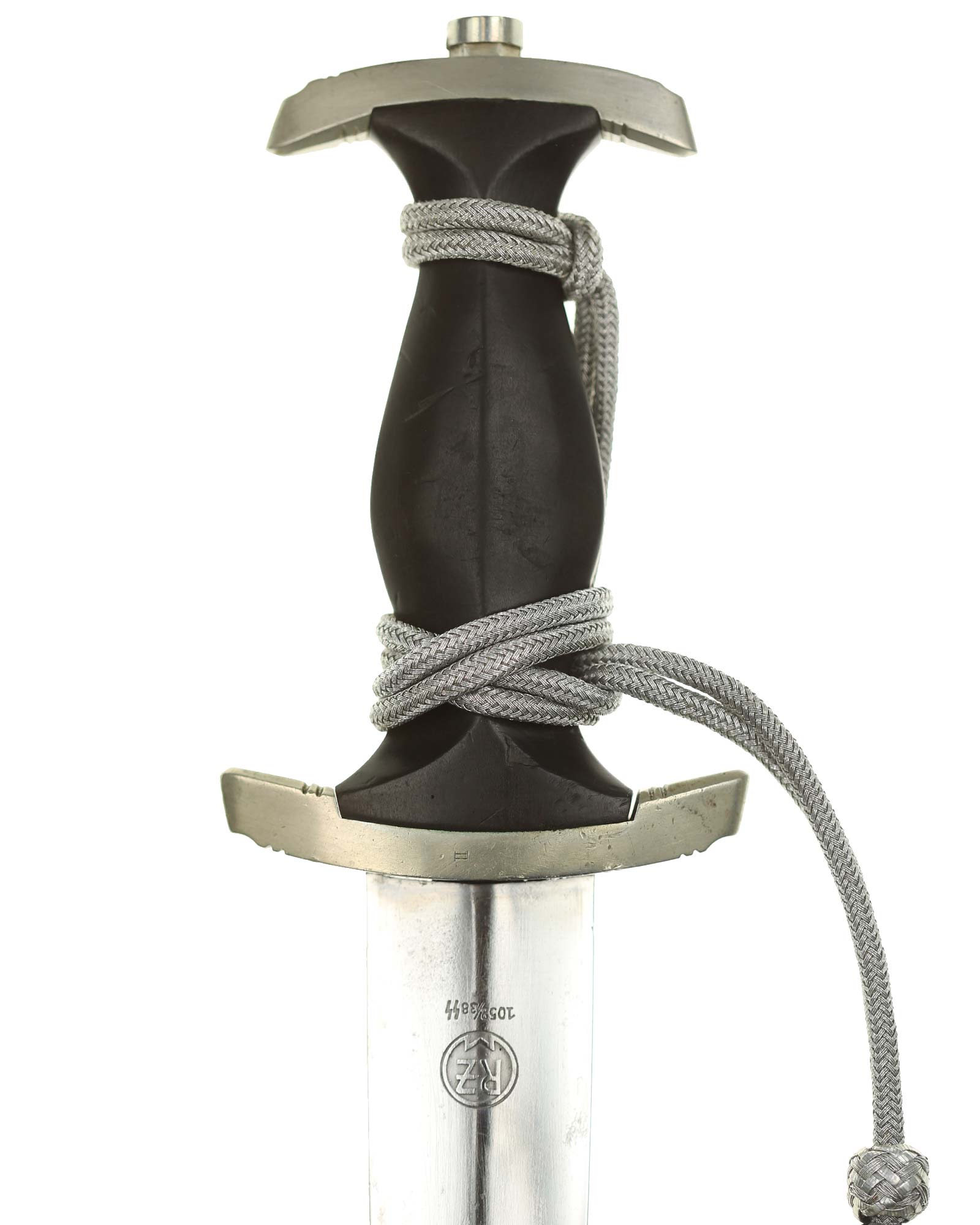 Grip: This grip shows no repairs, and fits the crossguards. The dagger having solid nickel cross guards. The reverse lower cross guard is district marked with the Roman numeral, "II". The guards are nice and smooth throughout. The ebony grip is in nice condition. The SS runes are nice and silvery, with matching double circles around them.