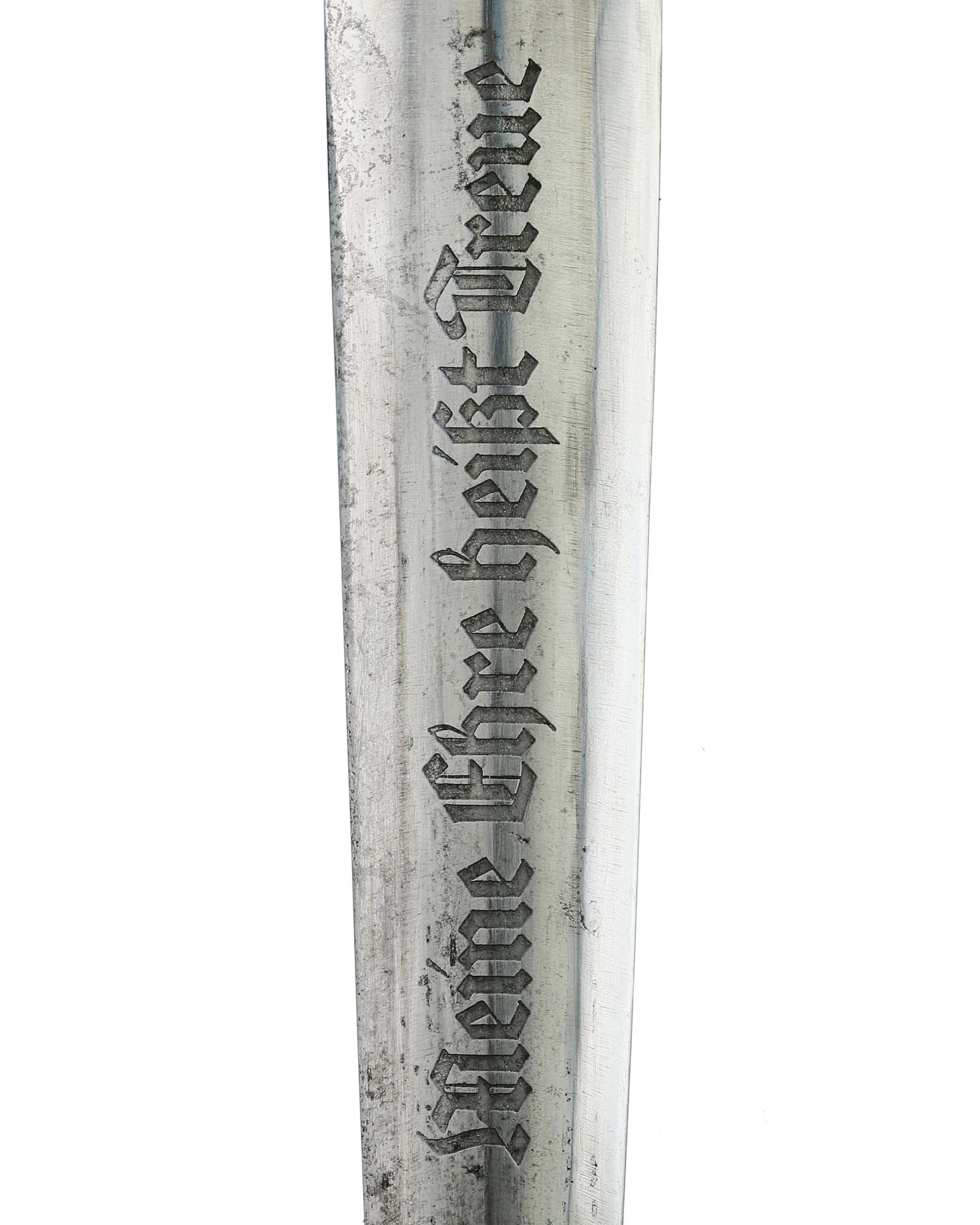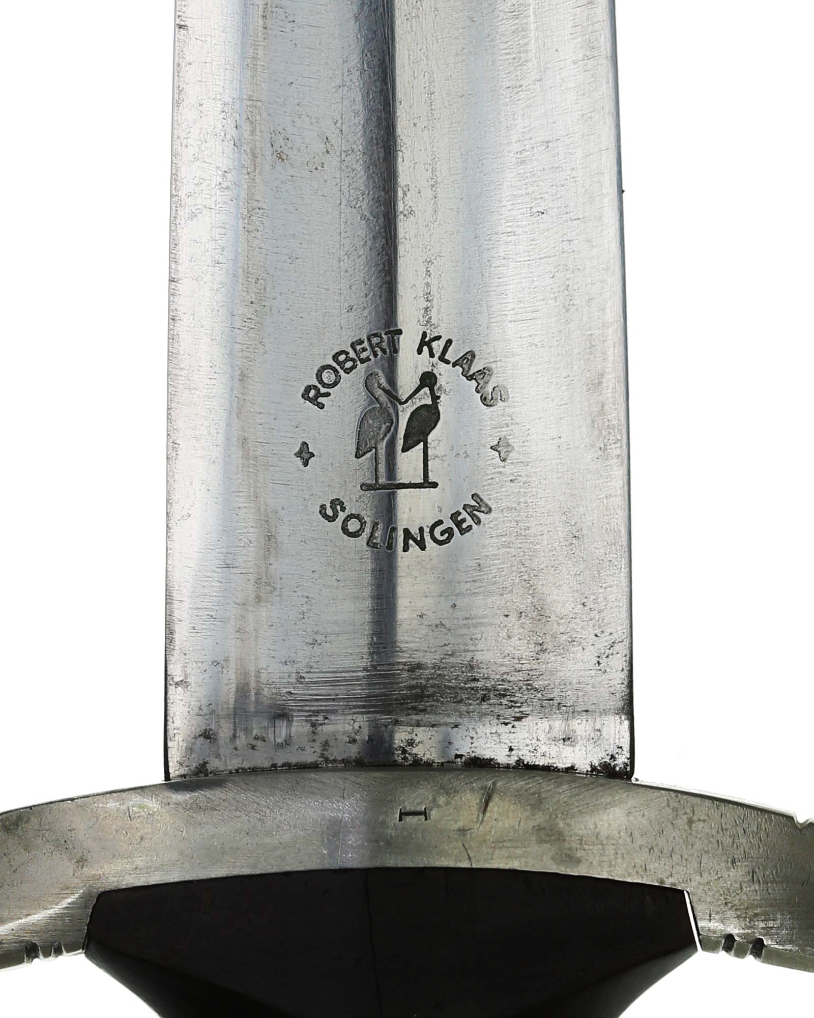 Blade: The blade of this example is still in EXC+ condition. The motto Meine Ehre heißt Treue «My honor is loyalty». The reverse ricasso of the blade is matching-etched with the circular design formed by the firm's name and location, “Robert Klass Solingen”. In the center is a pair of stylized kissing cranes. The blade shoulders perfectly meet the lower crossguard contour.