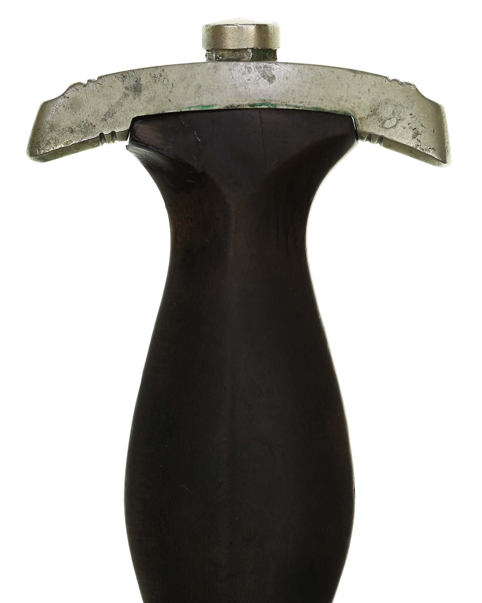 Grip: This grip shows some repairs, and fits the crossguards. The grip eagle is the early, “High Necked” variety. All the details are visible throughout the bird's feathering, talons, wreath, and mobile swastika. This early dagger is equipped with nickel crossguards and tang nut. These guards are in good shape. The guards are still in good condition, showing an average amount of wear from use. The lower reverse guard is with "I" [Munich] stamped.