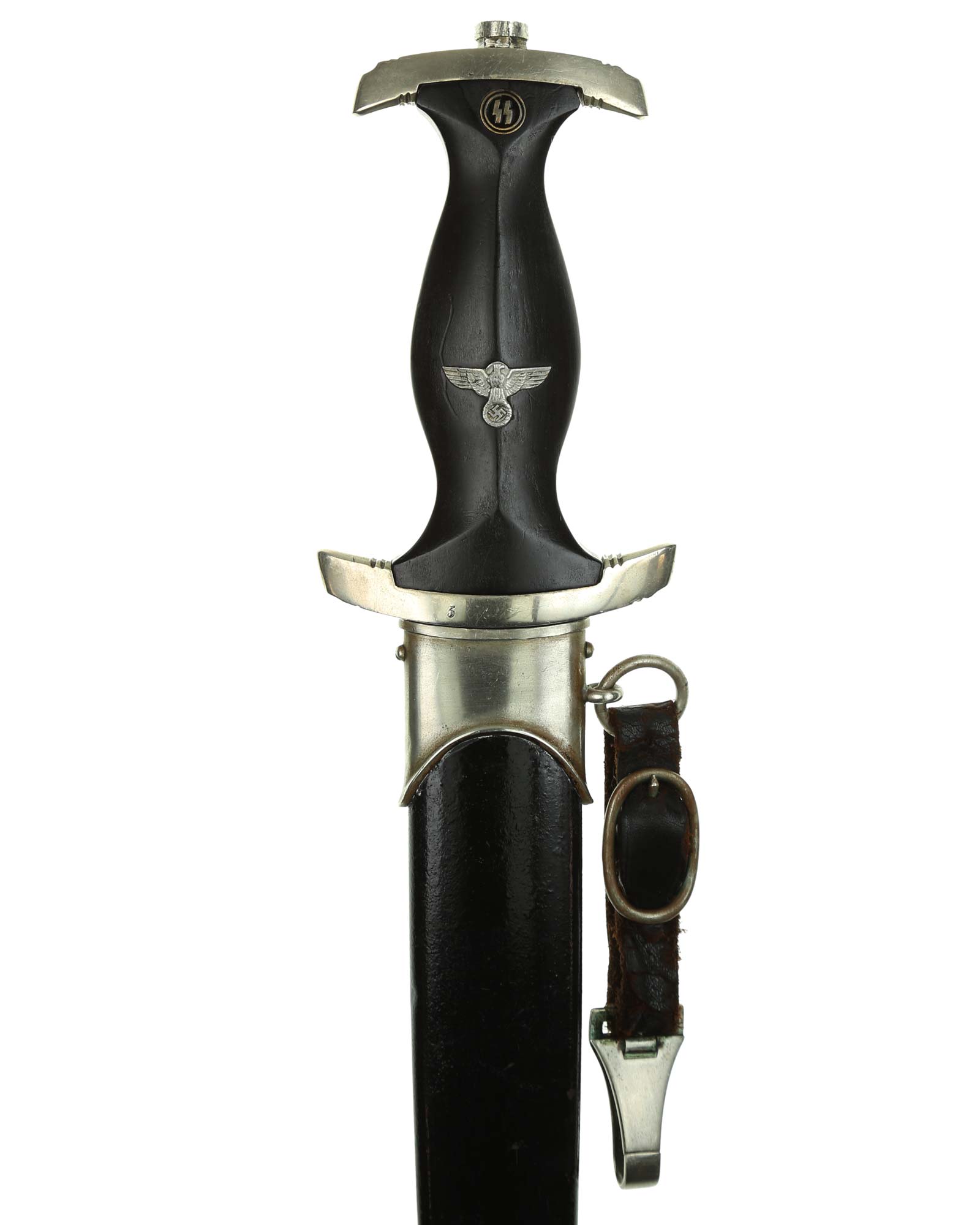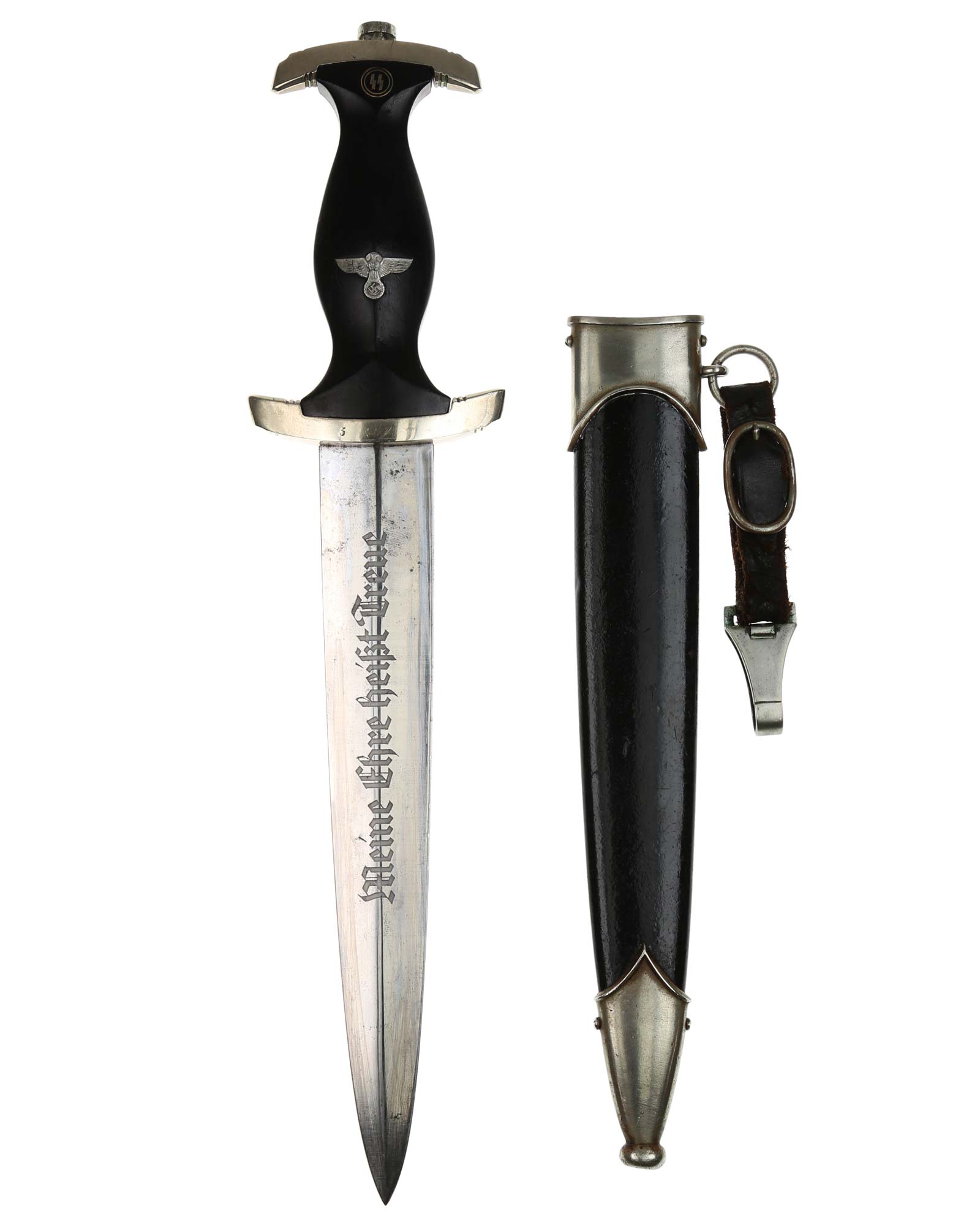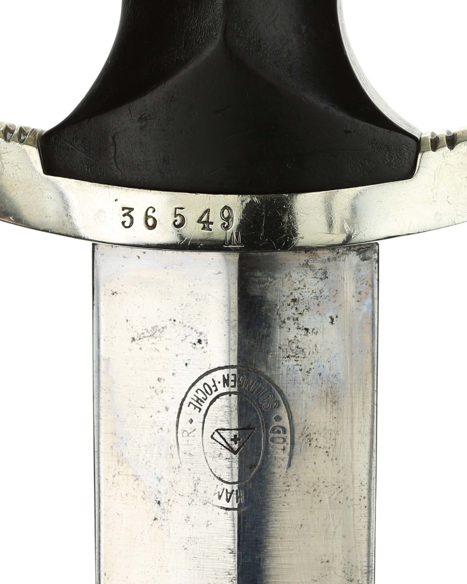 SS [Schutzstaffel] Dagger in early Version. Modell 1933. The dagger is in EXC++ condition throughout. This early SS Dagger is with the Maker Gottlieb Hammesfahr Solingen-Foche. A very nice factory ground Rohm SS dagger here, with SS mann serial number.