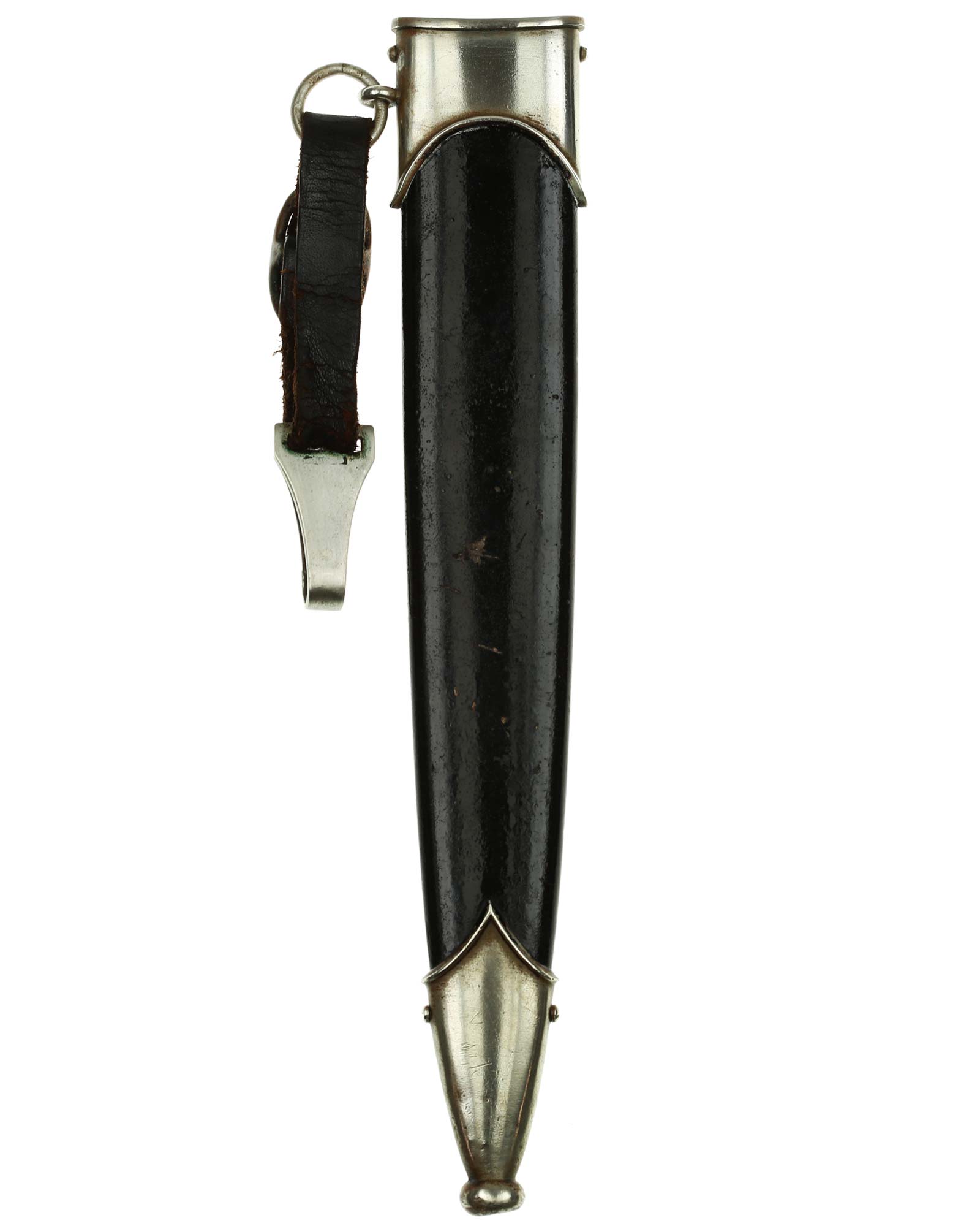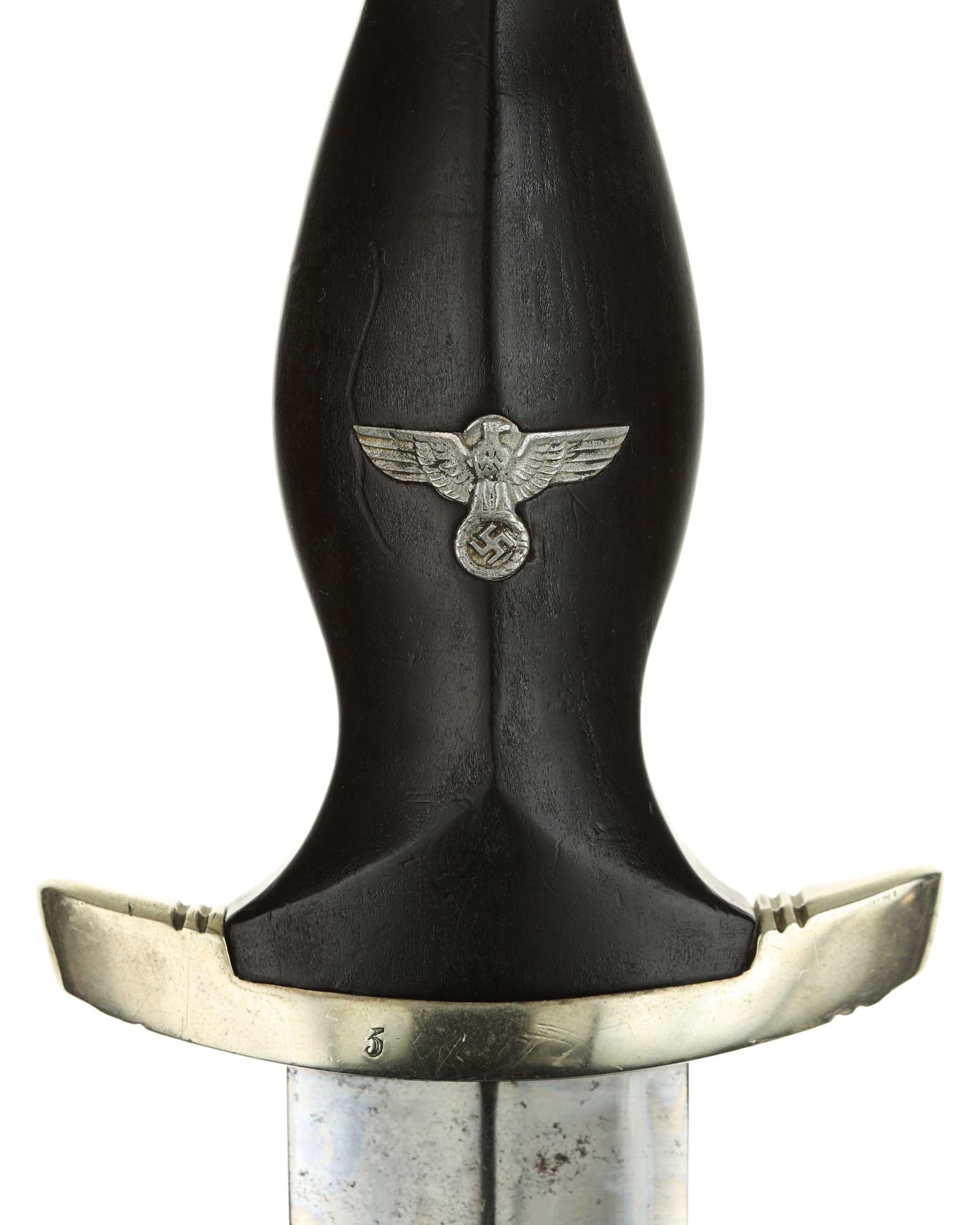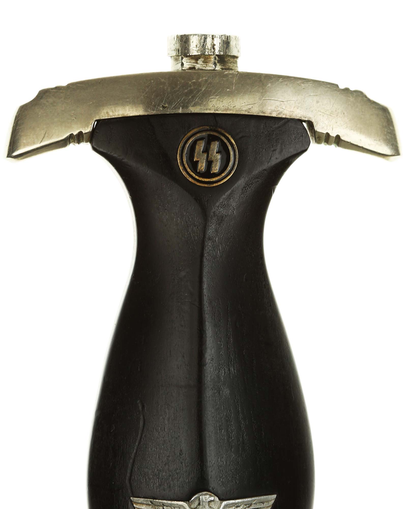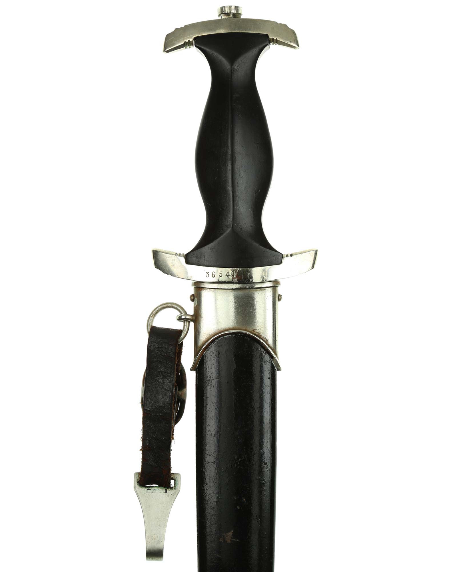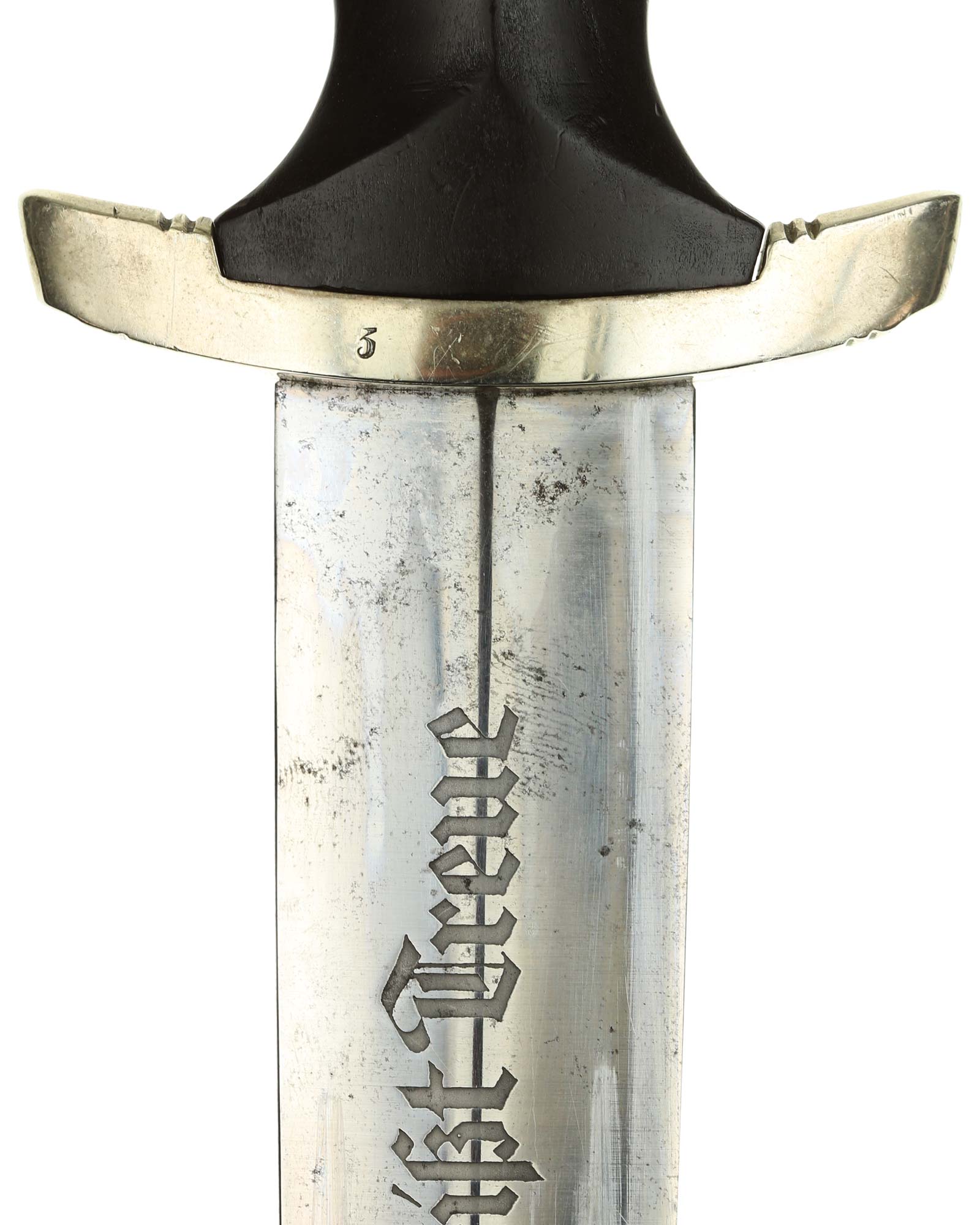 Grip: This grip fits the crossguards. The dagger having solid nickel cross guards. The reverse lower cross guard is district marked with the Roman numeral, "III" for Berlin. The guards are nice and smooth throughout. The ebony grip is in good condition. The SS runes are nice and silvery, with matching double circles around them. The SS serial number, 36549, is stamped into the lower cross guard. The wood of the SS Dagger’s grip has retained all of its deep black color.