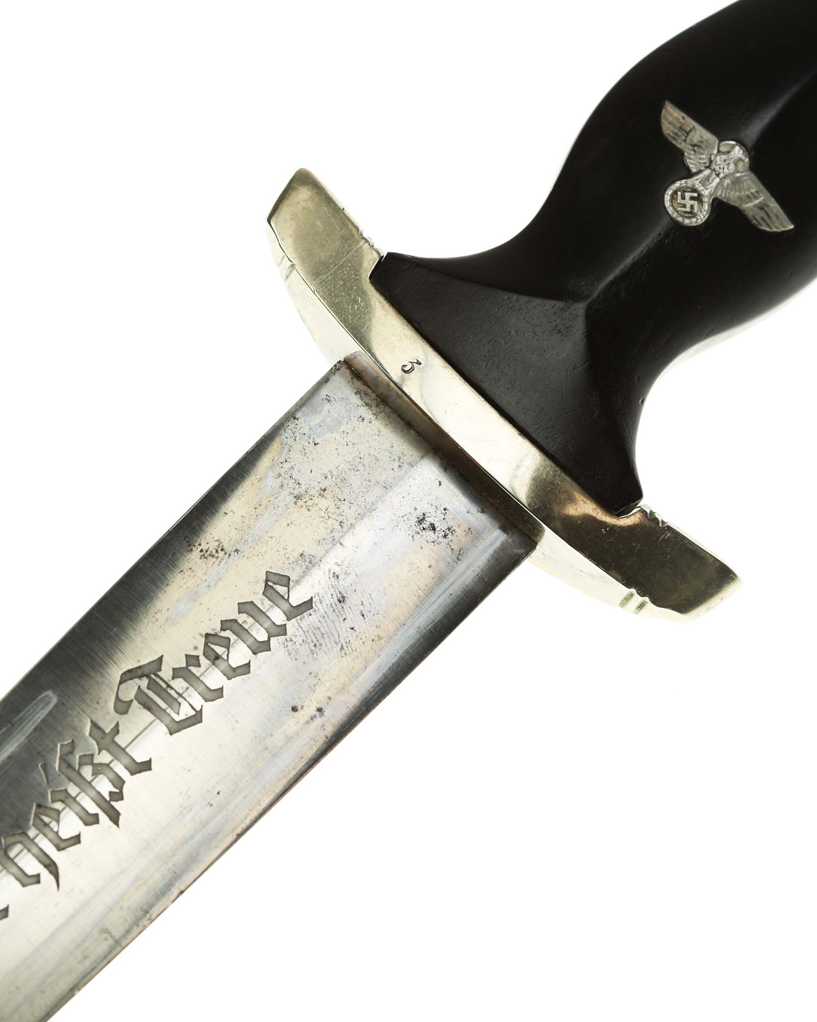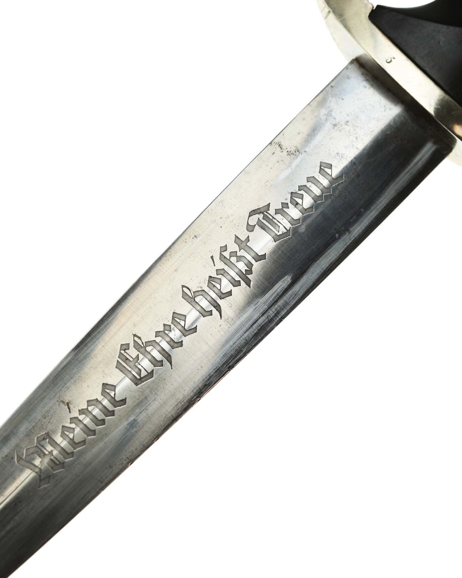 Blade: The blade of this example is still in EXC++ condition. The motto Meine Ehre heißt Treue «My honor is loyalty» is crisp and deep. The reverse ricasso is marked with the Gottlieb Hammesfahr Solingen logo. The blade shoulders perfectly meet the lower cross guard. The Rohm inscription has been factory ground, from tip to guard