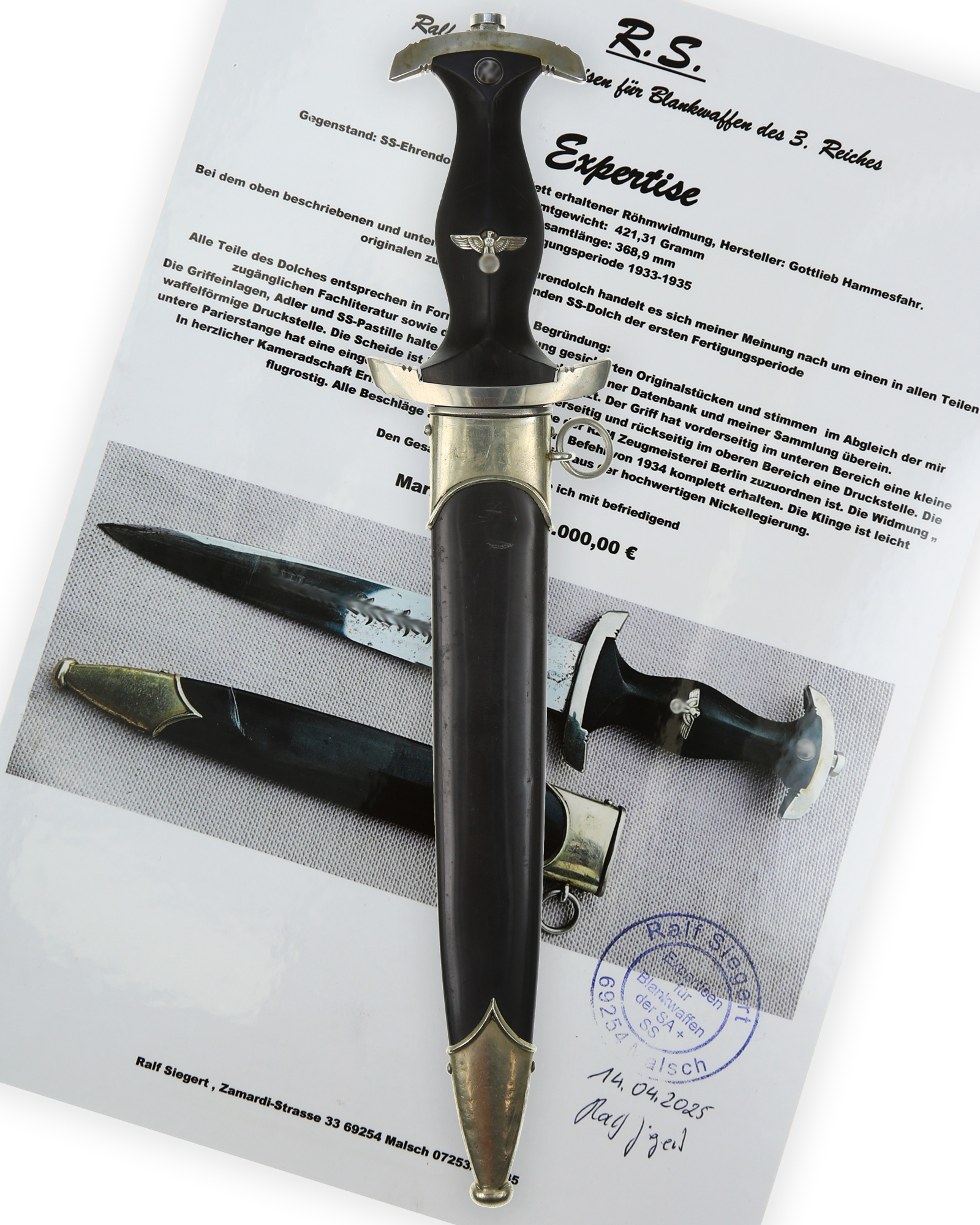 SS [Schutzstaffel] Honour Dagger in early Version. Modell 1933. The dagger is in EXC++ condition throughout. This early SS Dagger is with full Ernst Röhm inscription by Gottlieb Hammesfahr Solingen-Foche.
