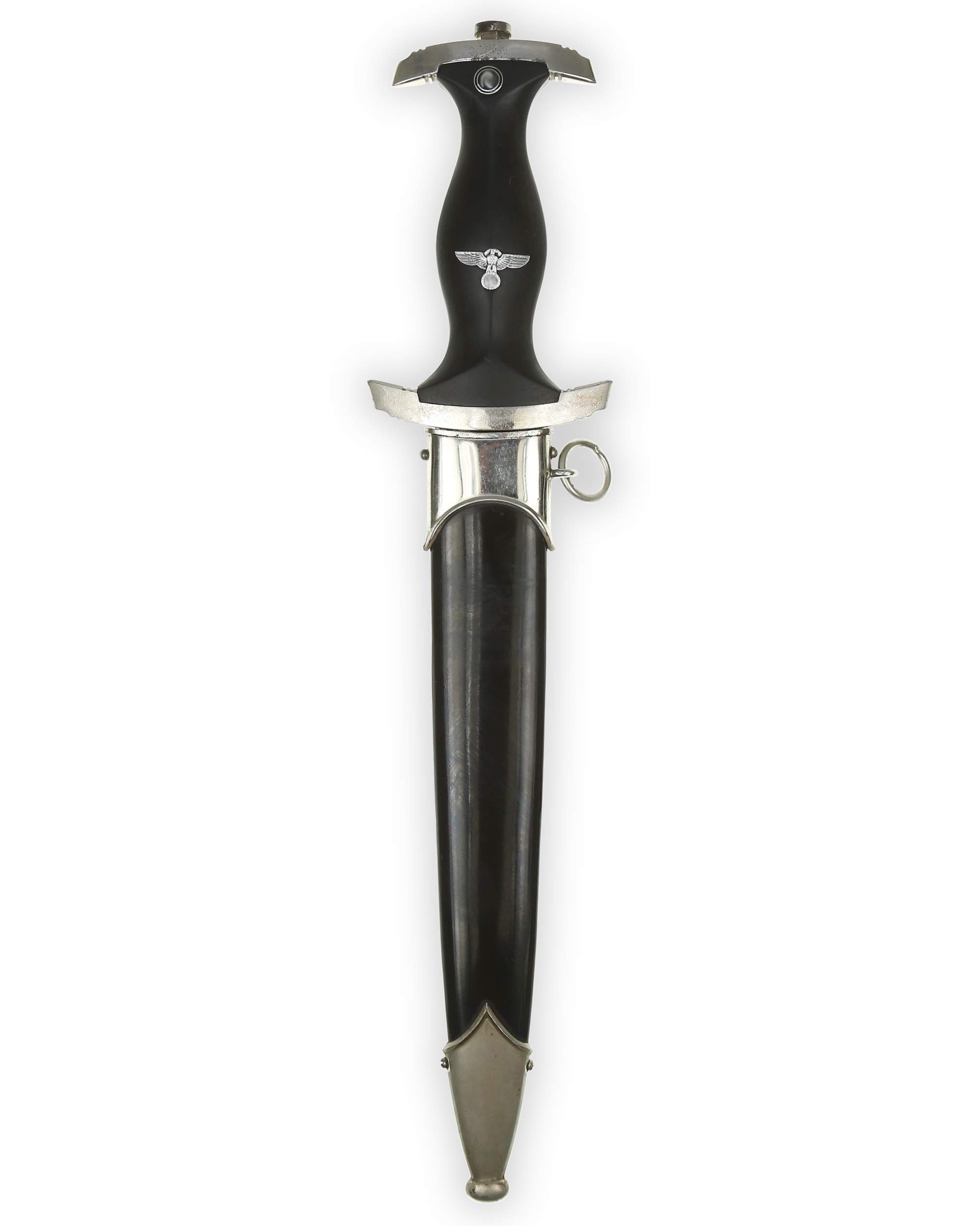 Despite simplified production methods, late SS daggers remain highly collectible, especially when preserved in clean, original condition with an intact blade, crisp motto etching, and complete scabbard.
