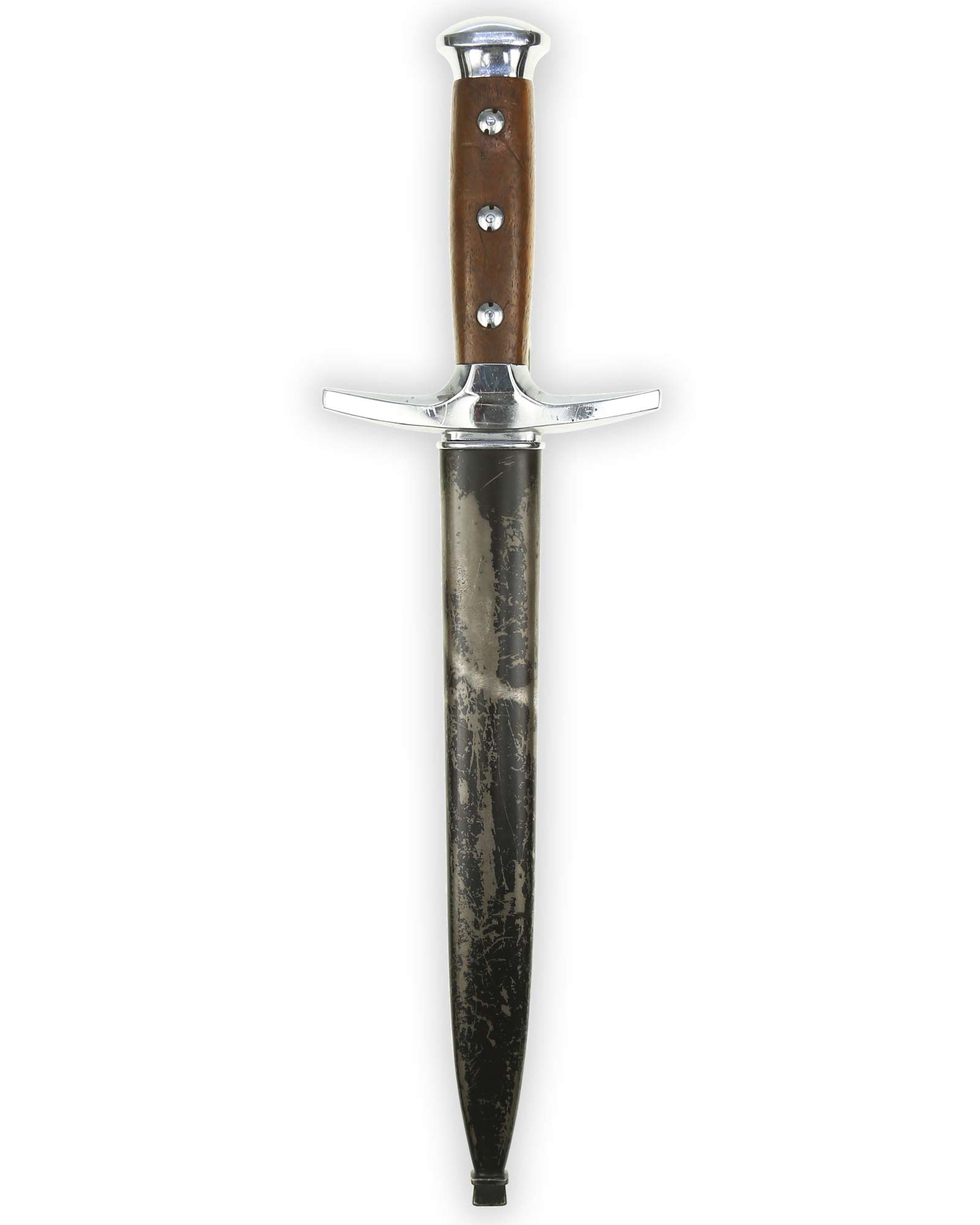 Grip: Two-piece wooden grip slabs, secured with three screws. Surface with distinctive grain, ergonomically shaped for a secure hold. Crossguard and pommel fittings of metal, nickel-plated; the crossguard plain, half-moon shaped.