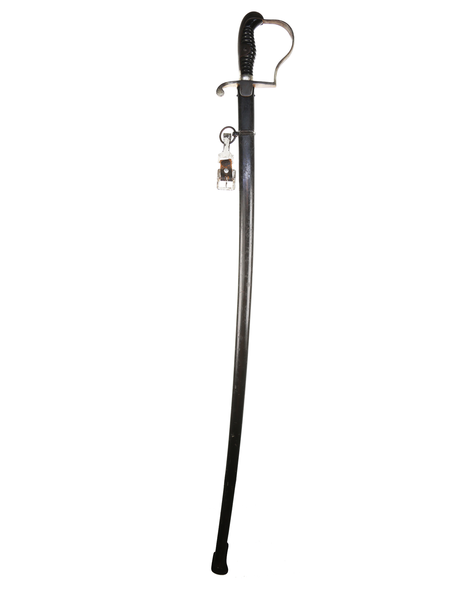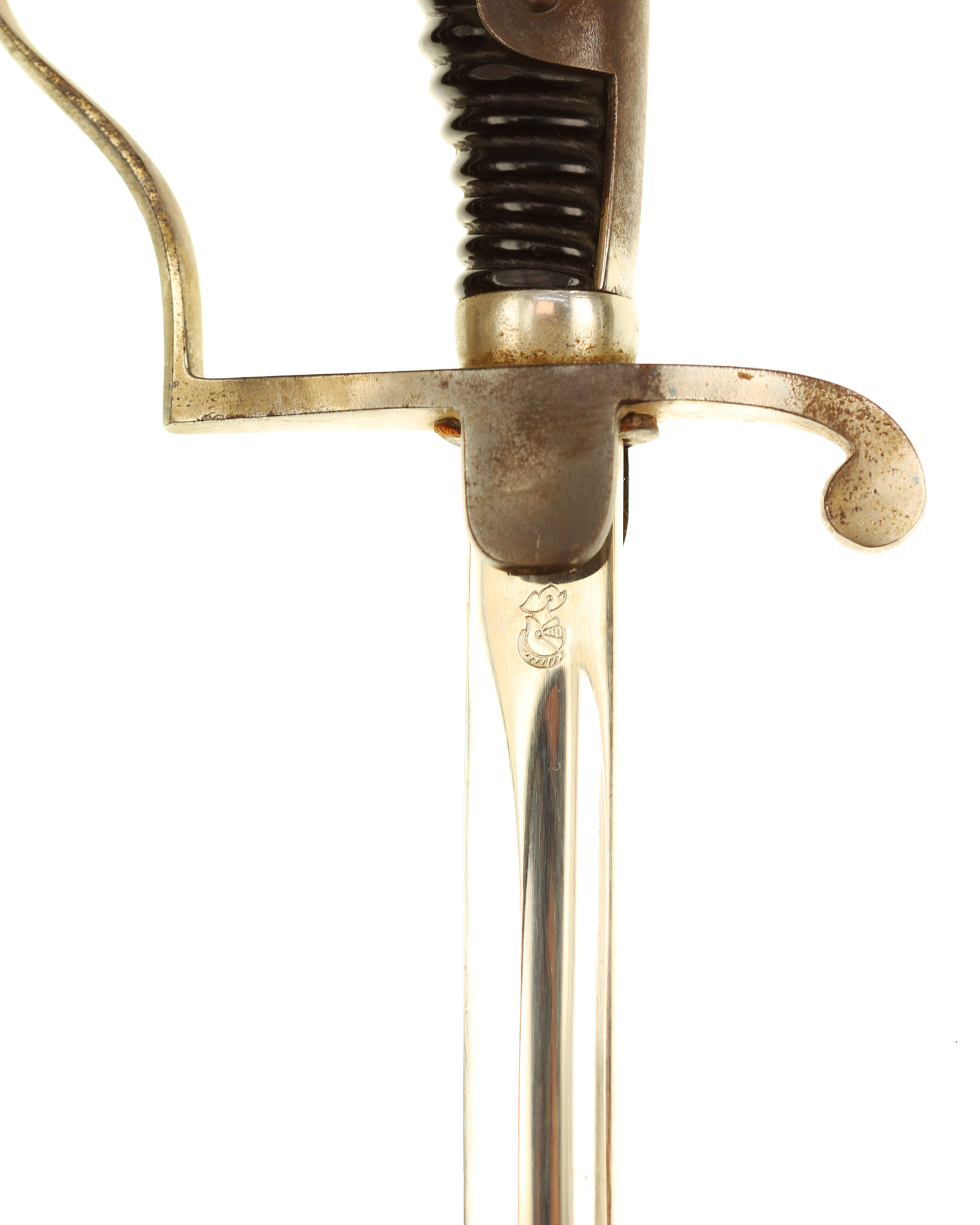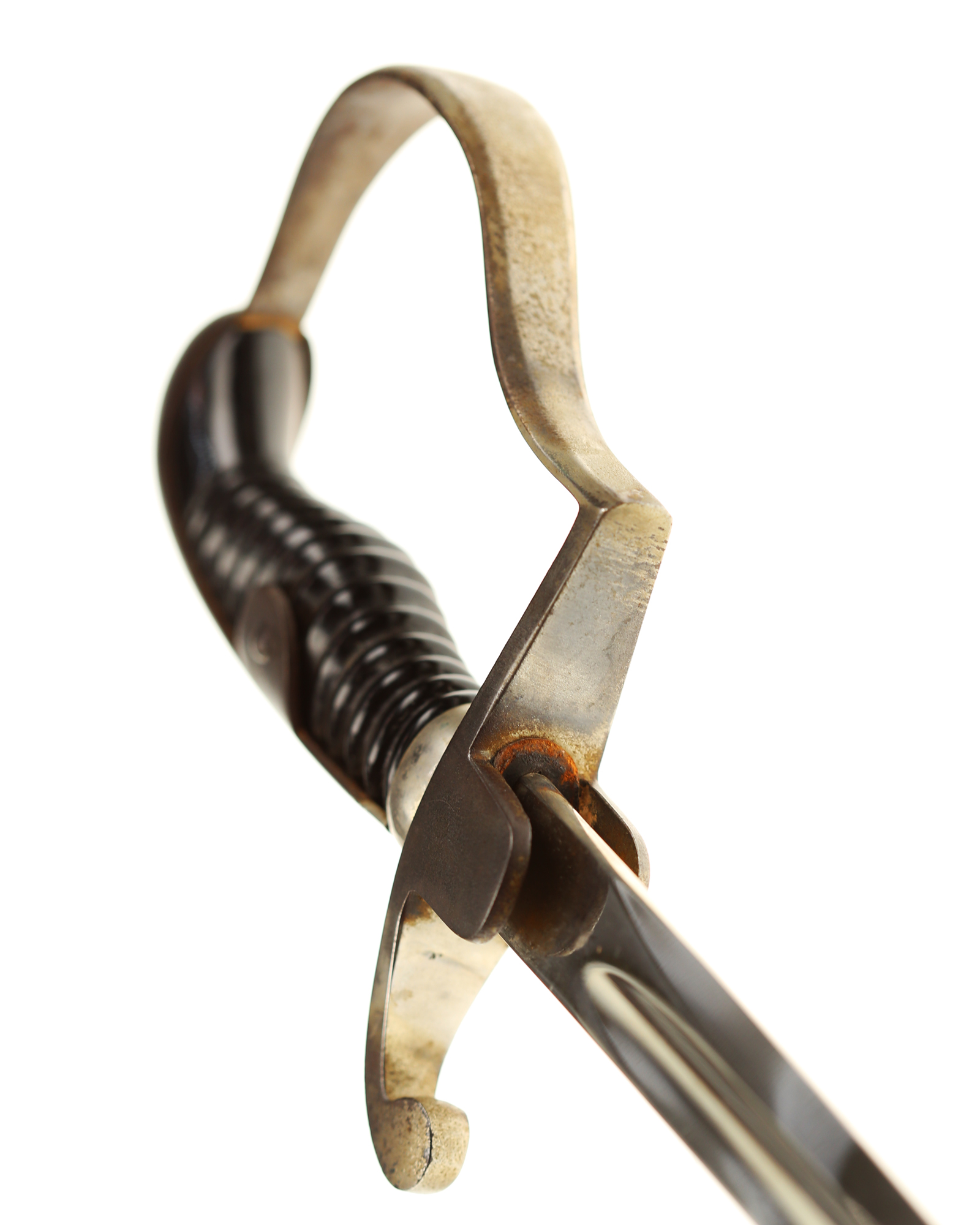 This Dove Head example is a good, solid brass piece. The grip is a black celluloid over wood base. The celluloid is in perfect condition throughout and it is tightly wrapped with triple twisted brass wire. The blade of this example has a mirror nickel surface. The obverse ricasso has the knighthead stamping with the firm’s initials below, WKC. The scabbard is straight throughout. This scabbard has nice, black paint.