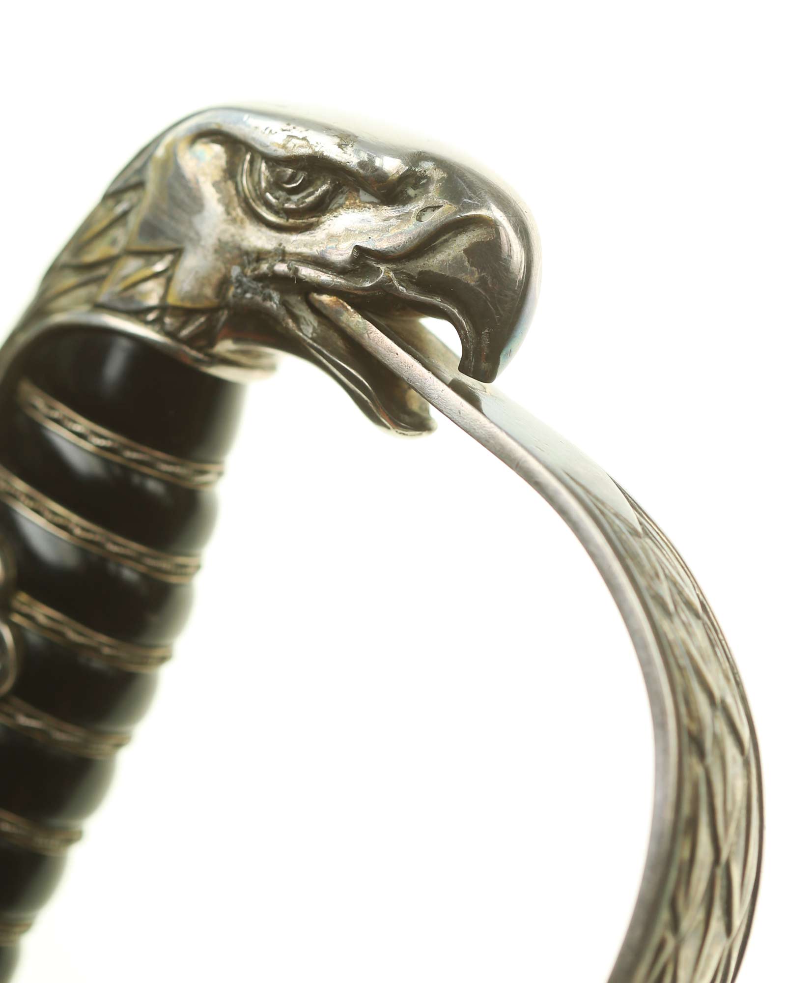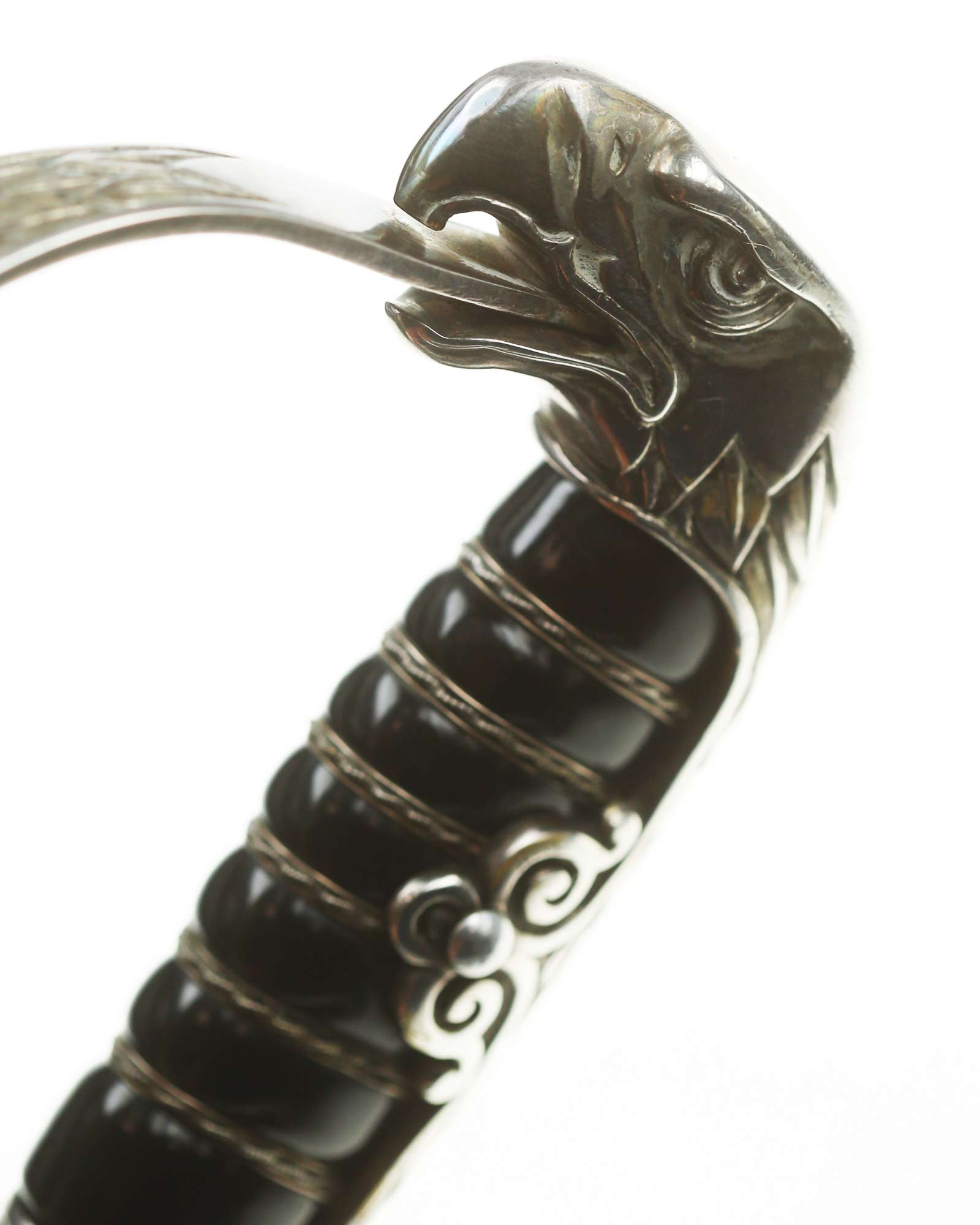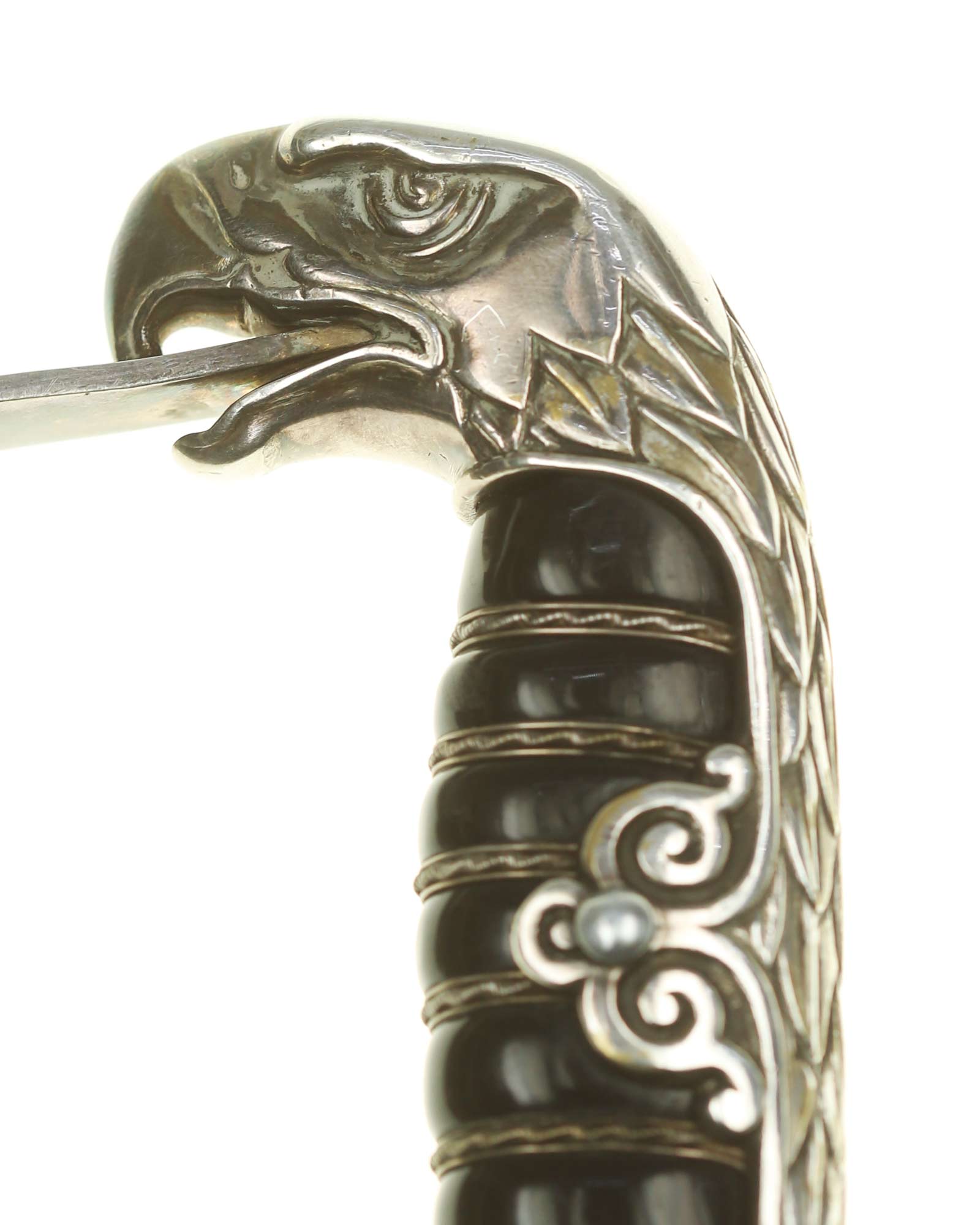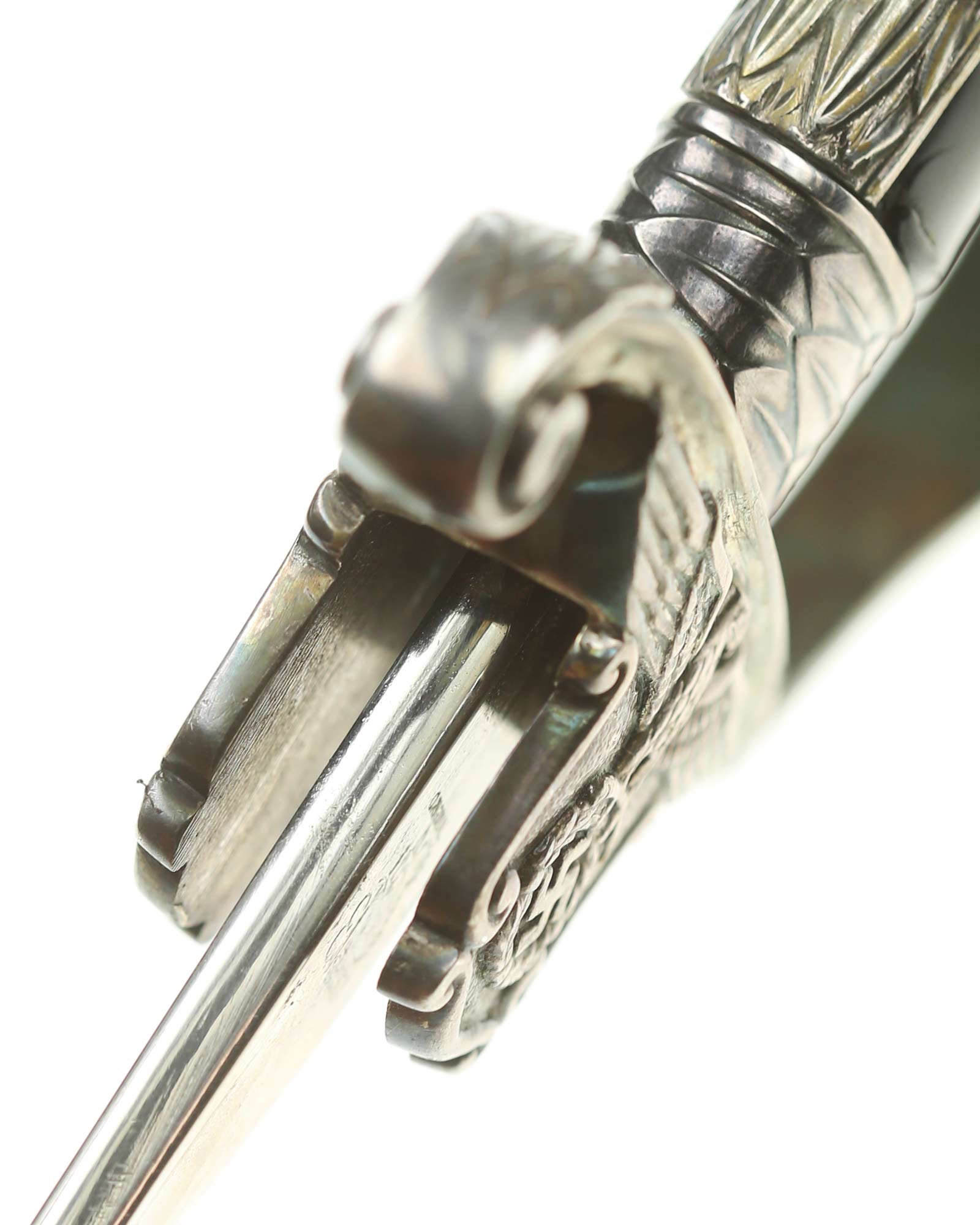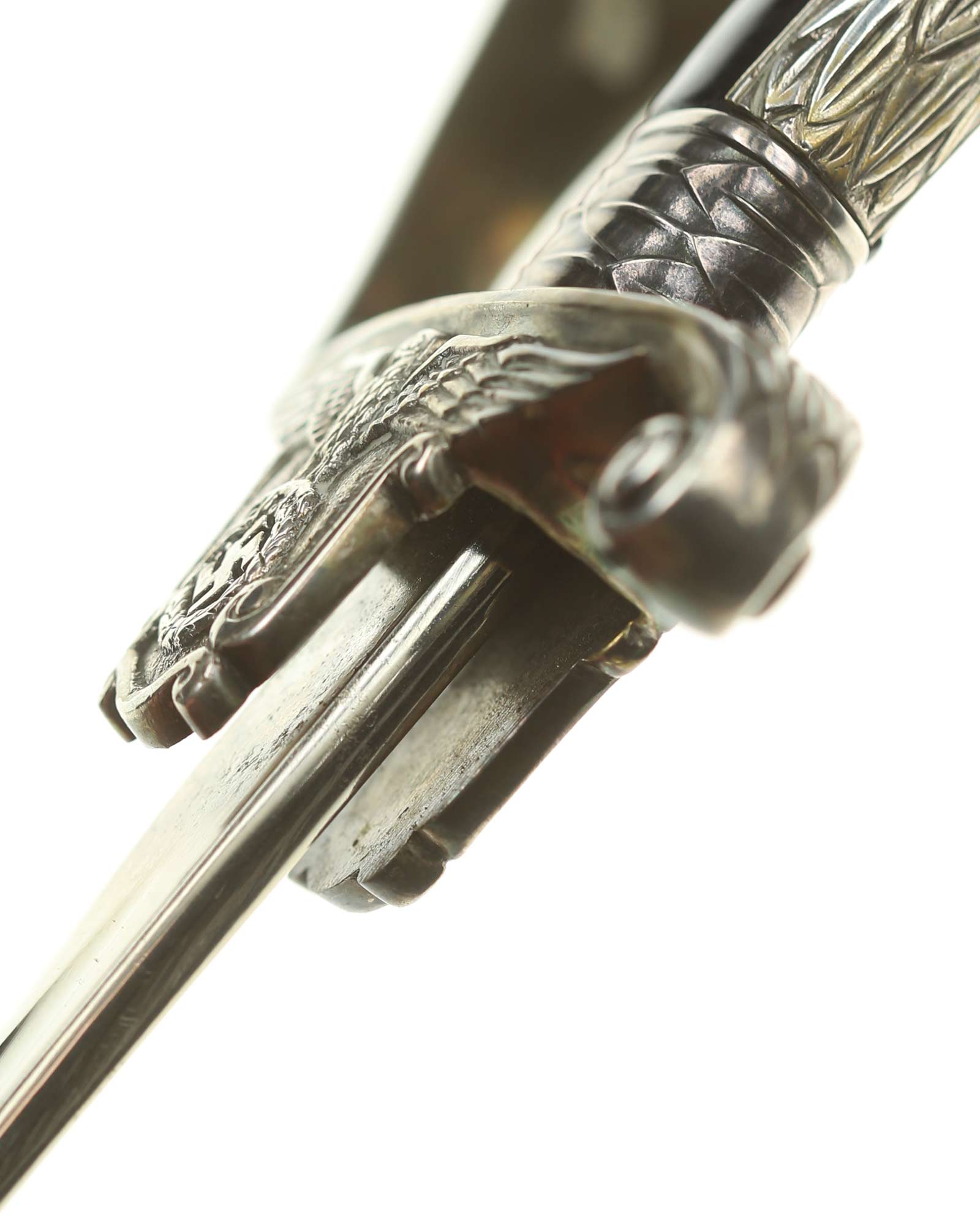 Sabre for judicial officers (model number 1763) manufactured by Carl Eickhorn Solingen. Nickel-plated blade with double-sided fuller. Silver-plated hilt with decoration, eagle head cap and black plastic grip. Black lacquered steel scabbard. Length approx. 107 cm.